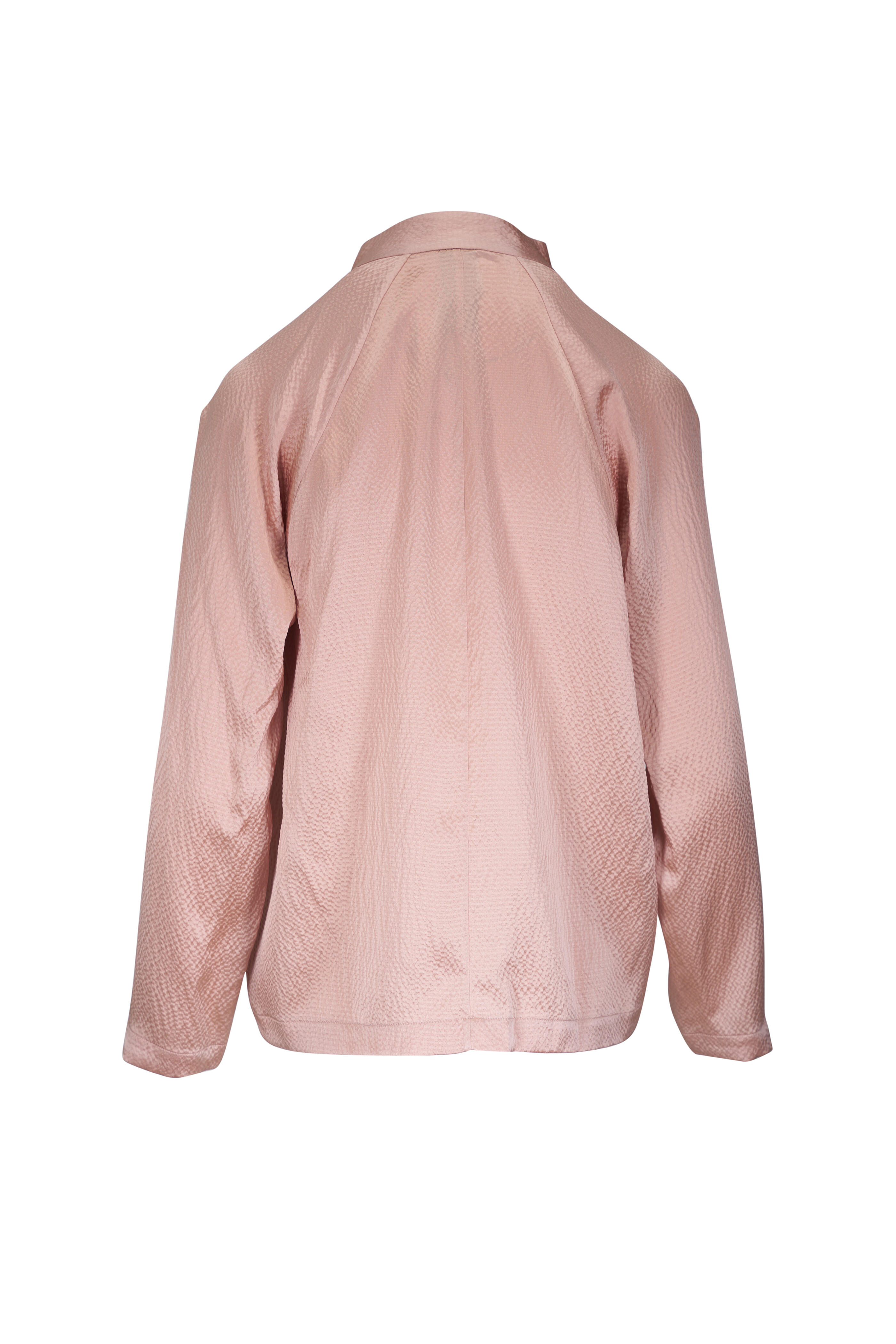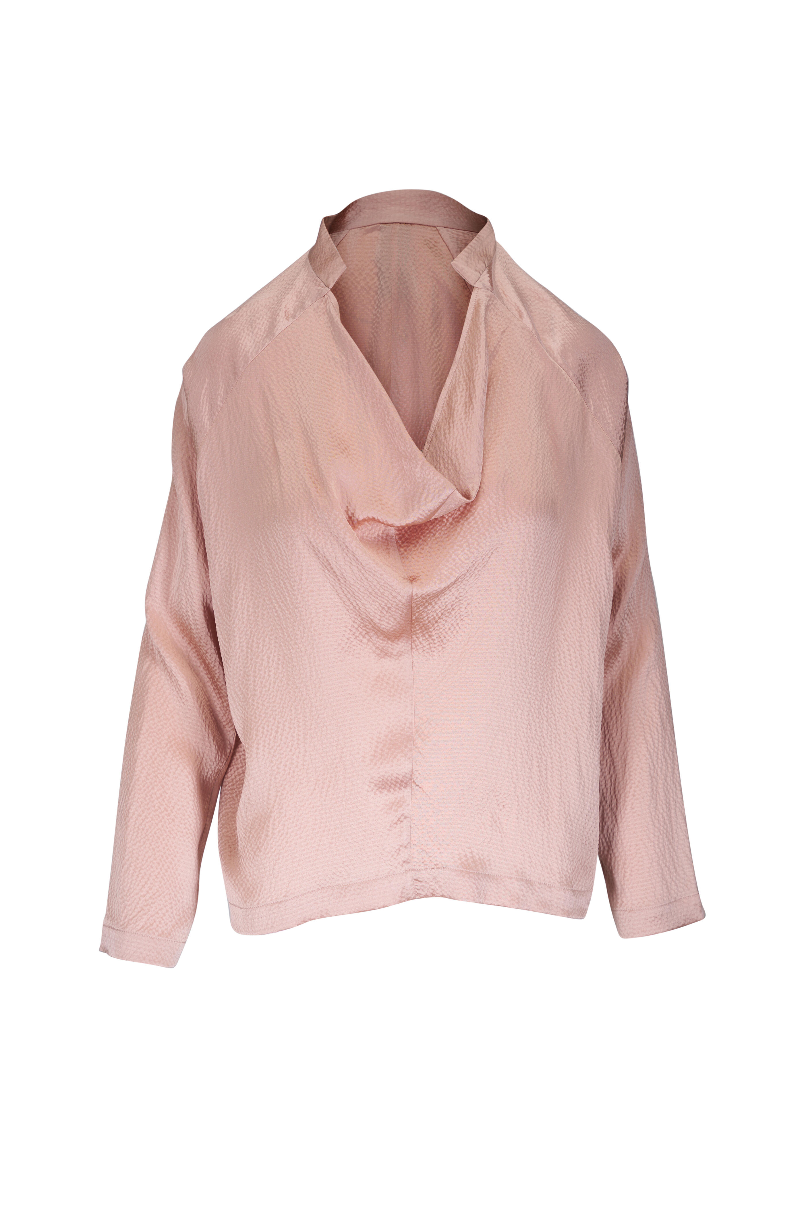Surplus cowl neckline; partial mock neck. High-low hem. Made in the USA. Approximately 25 ½" shoulder to hem (measurements taken from size 4). 100% silk. Dry clean.