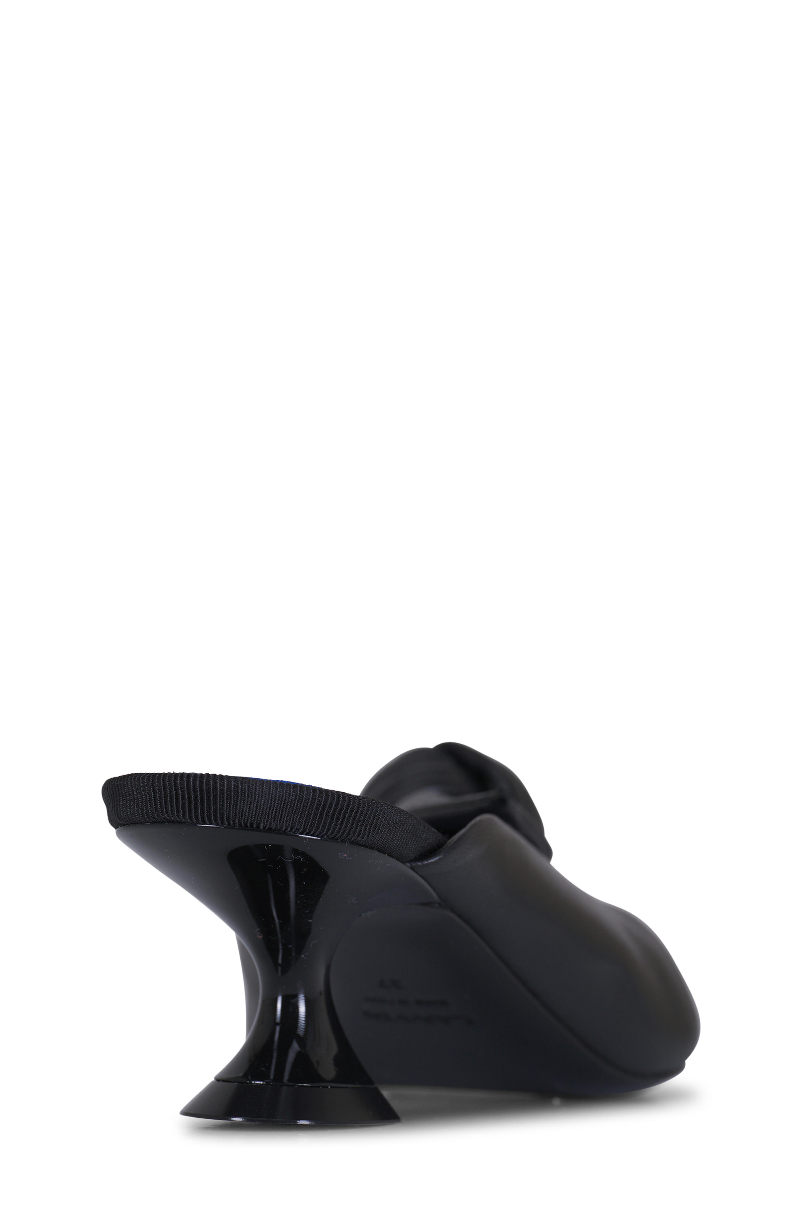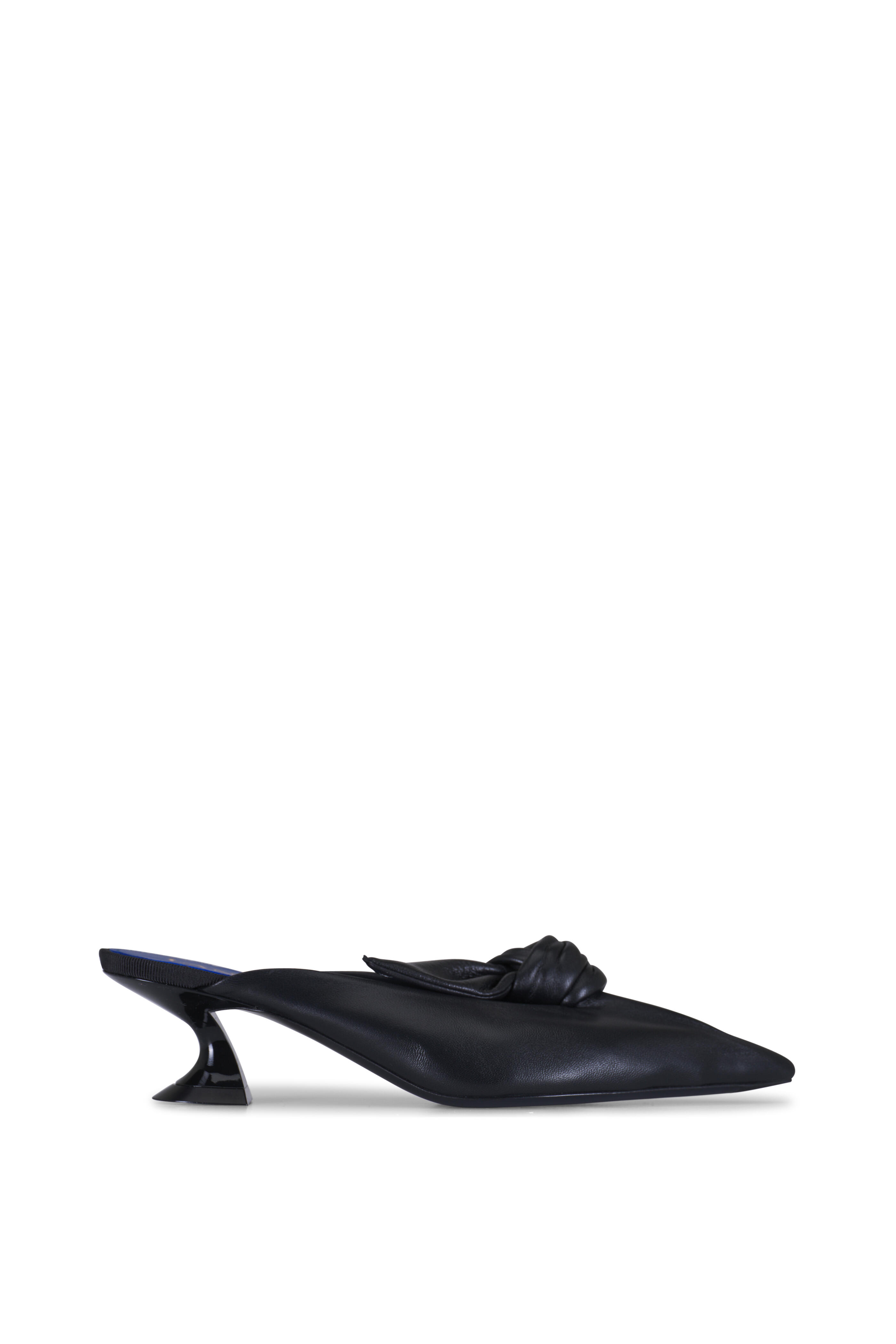 Leather upper. Pointed toe. Straight leather bow on vamp. Slip on style. Leather lining and insole. Leather sole. Made in Italy. Heel measurement: 50mm.