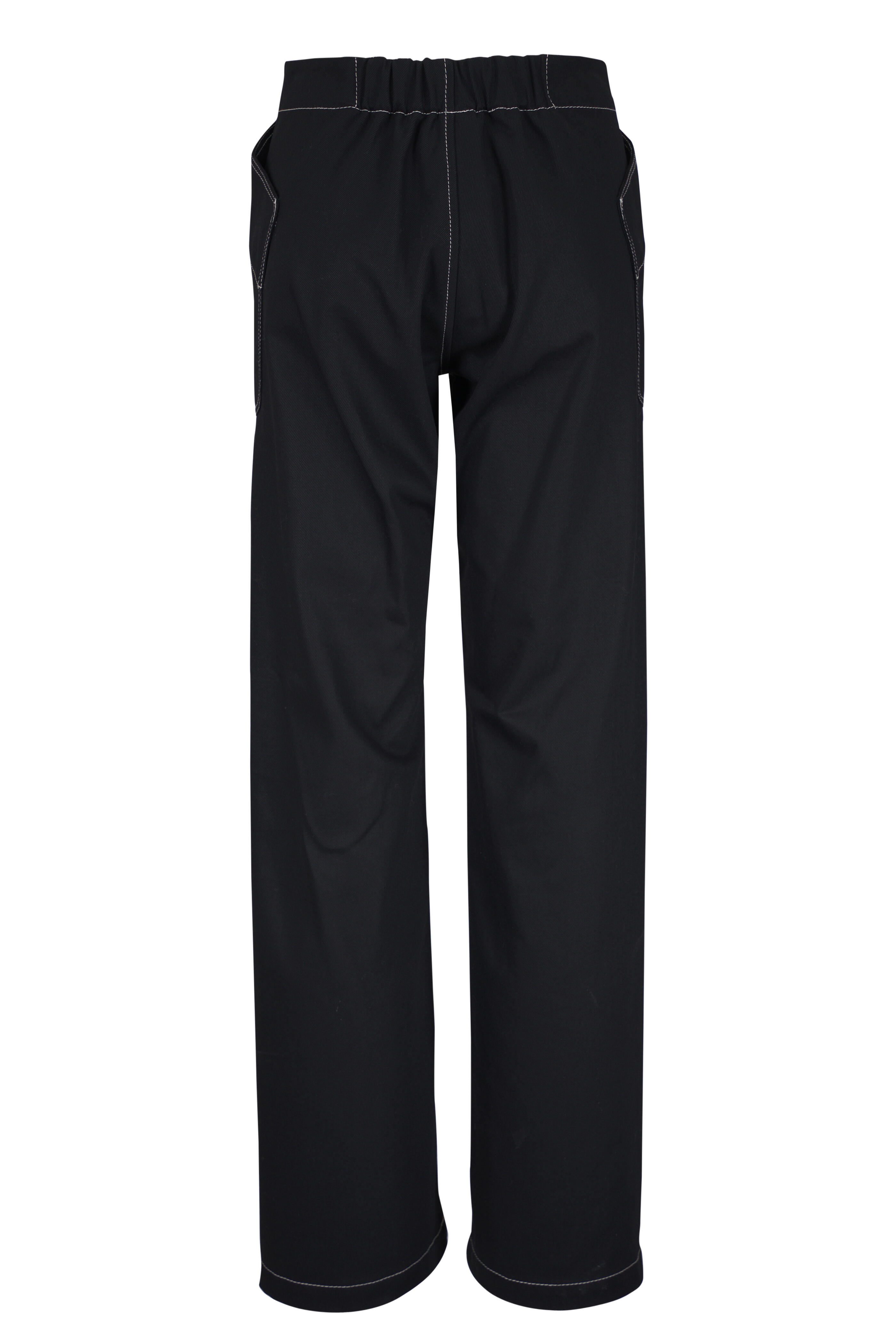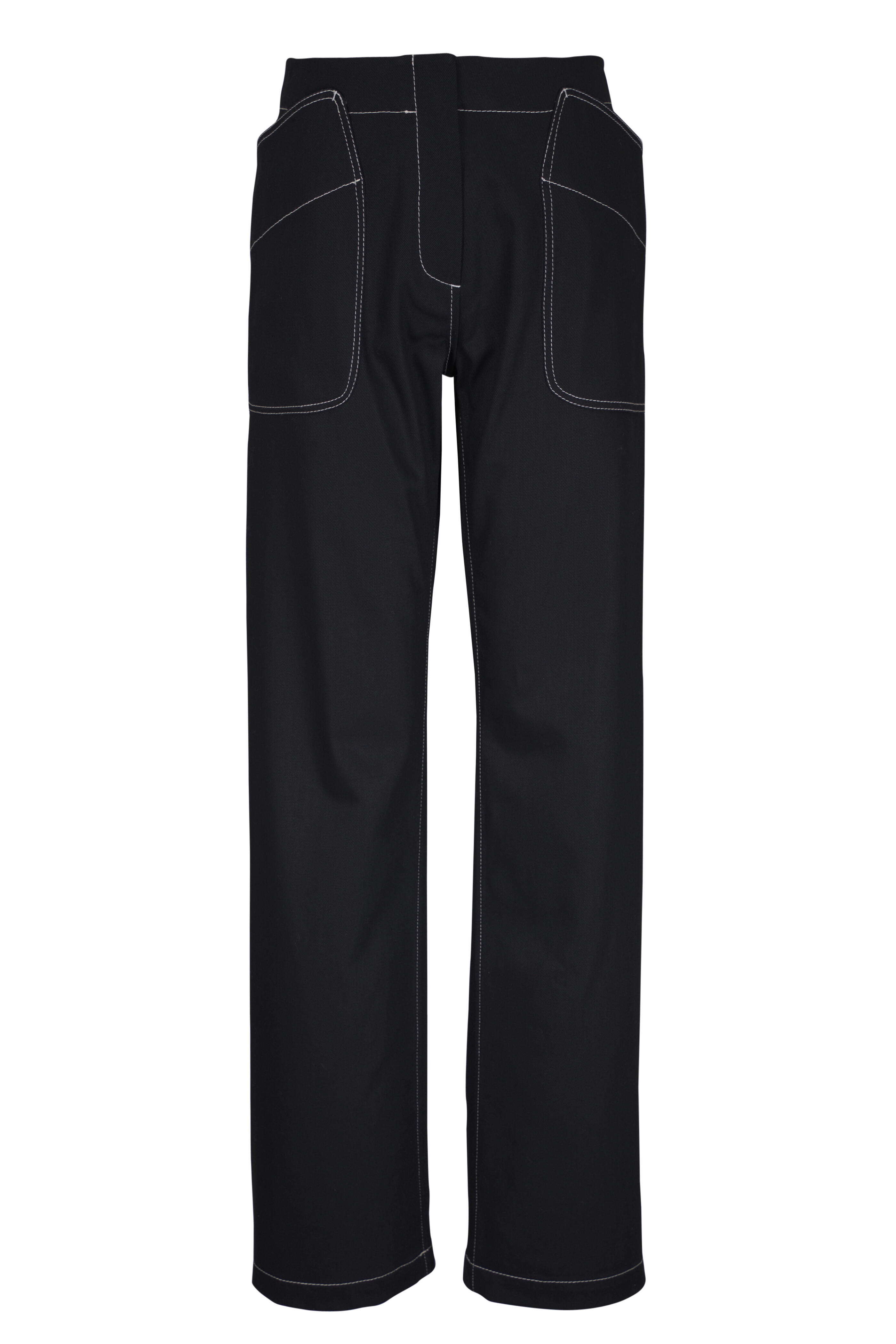 Zip fly; hook-and-bar closure. Elasticized back waistband. Front patch pockets. Contrasting stitching. Made in the USA. Inseam: 33". 100% organic cotton. Machine wash.