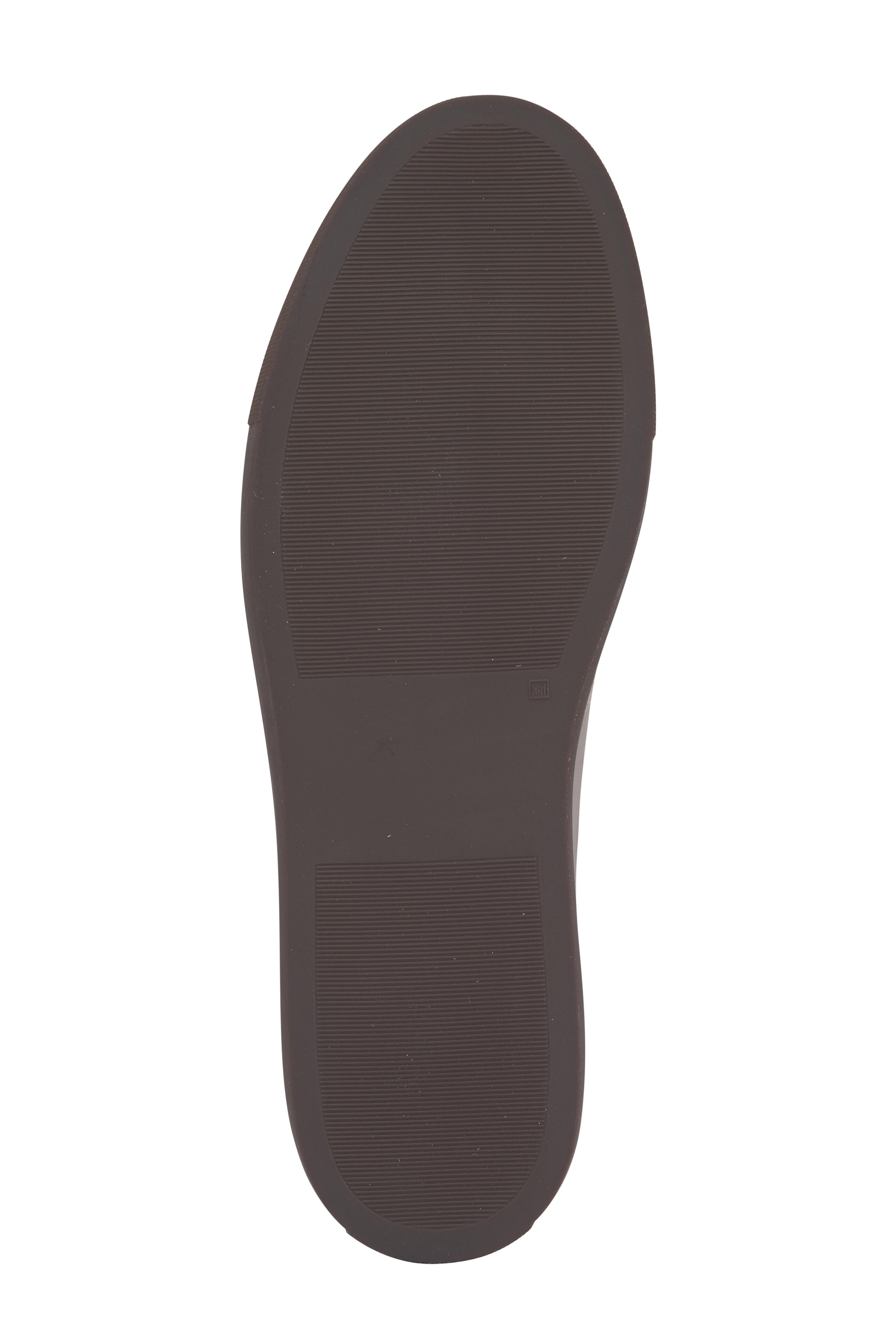 Leather and suede upper. Round toe. Six eyelet lace-up closure. Gold embossed serial number at side. Leather lining; cushioned insole. Rubber sole. Made in Italy.