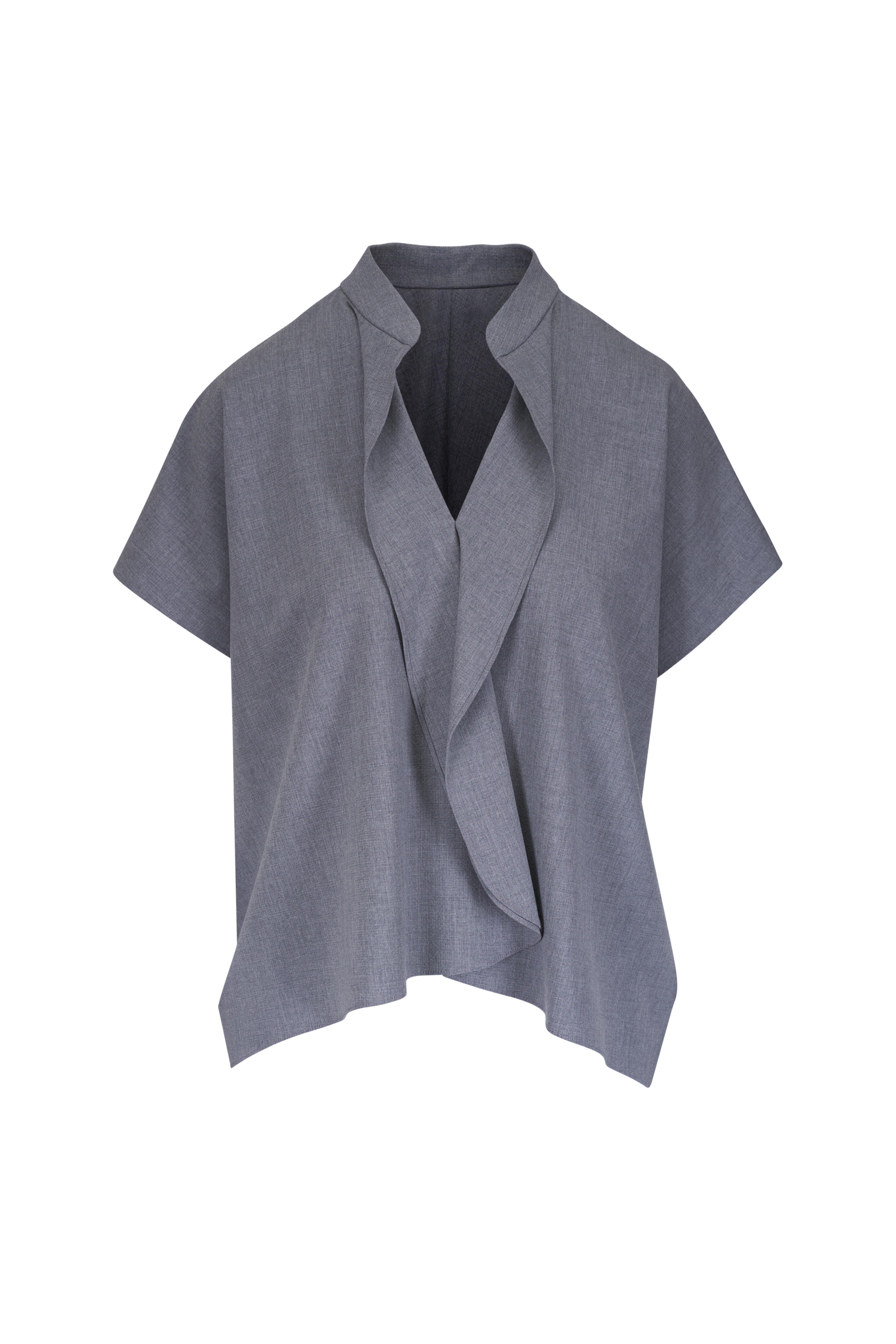 Stand collar. V-neckline; draped ruffle detail at neckline. Pull-on style. Shirttail hem. Made in the USA. Shoulder to hem 26" (size 4). 68% polyester, 29% viscose, 3% elastane. Dry clean.