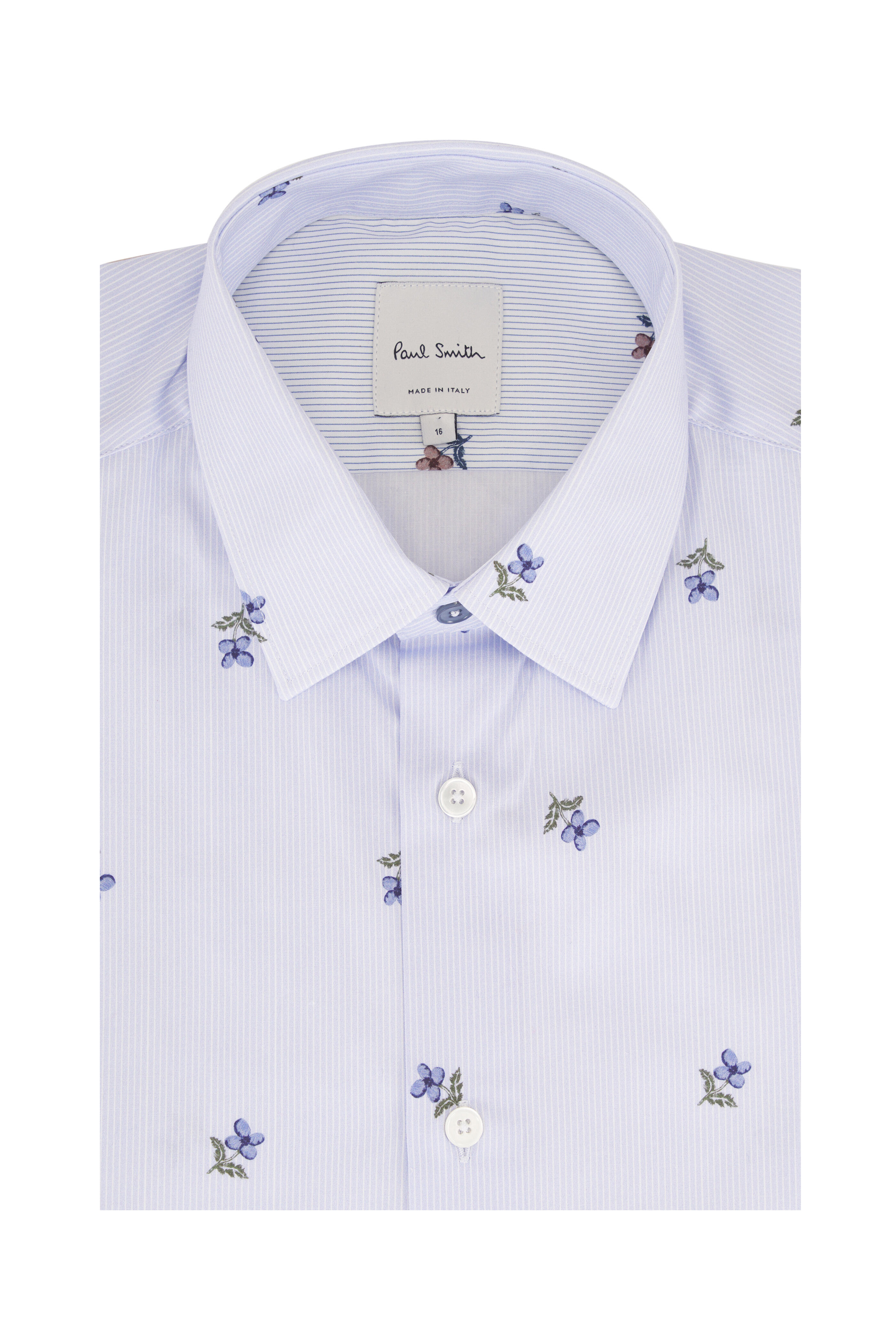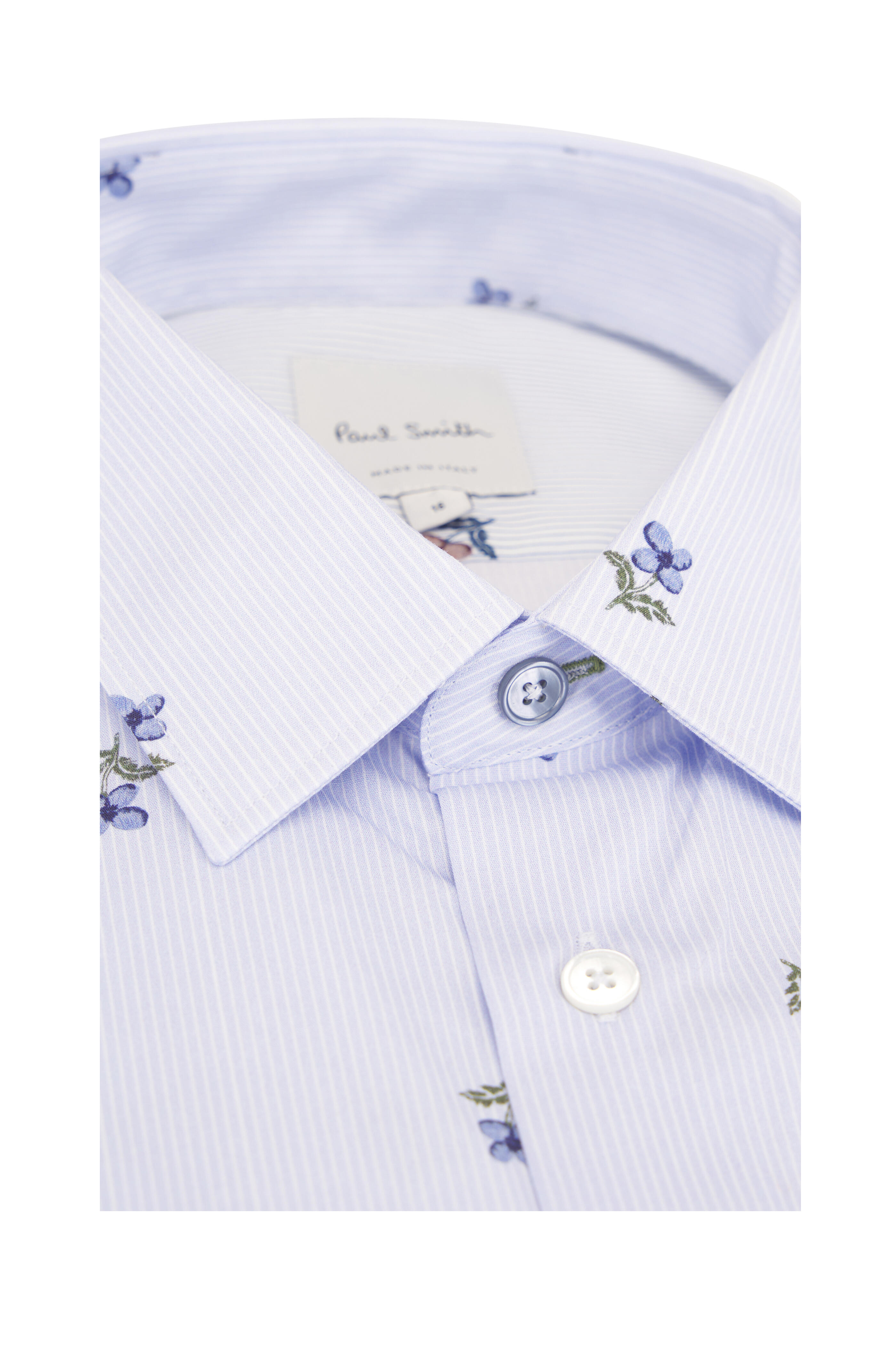 Spread collar. Front button placket. Single button mitered cuffs. Made in Italy. 100% cotton. Dry clean.