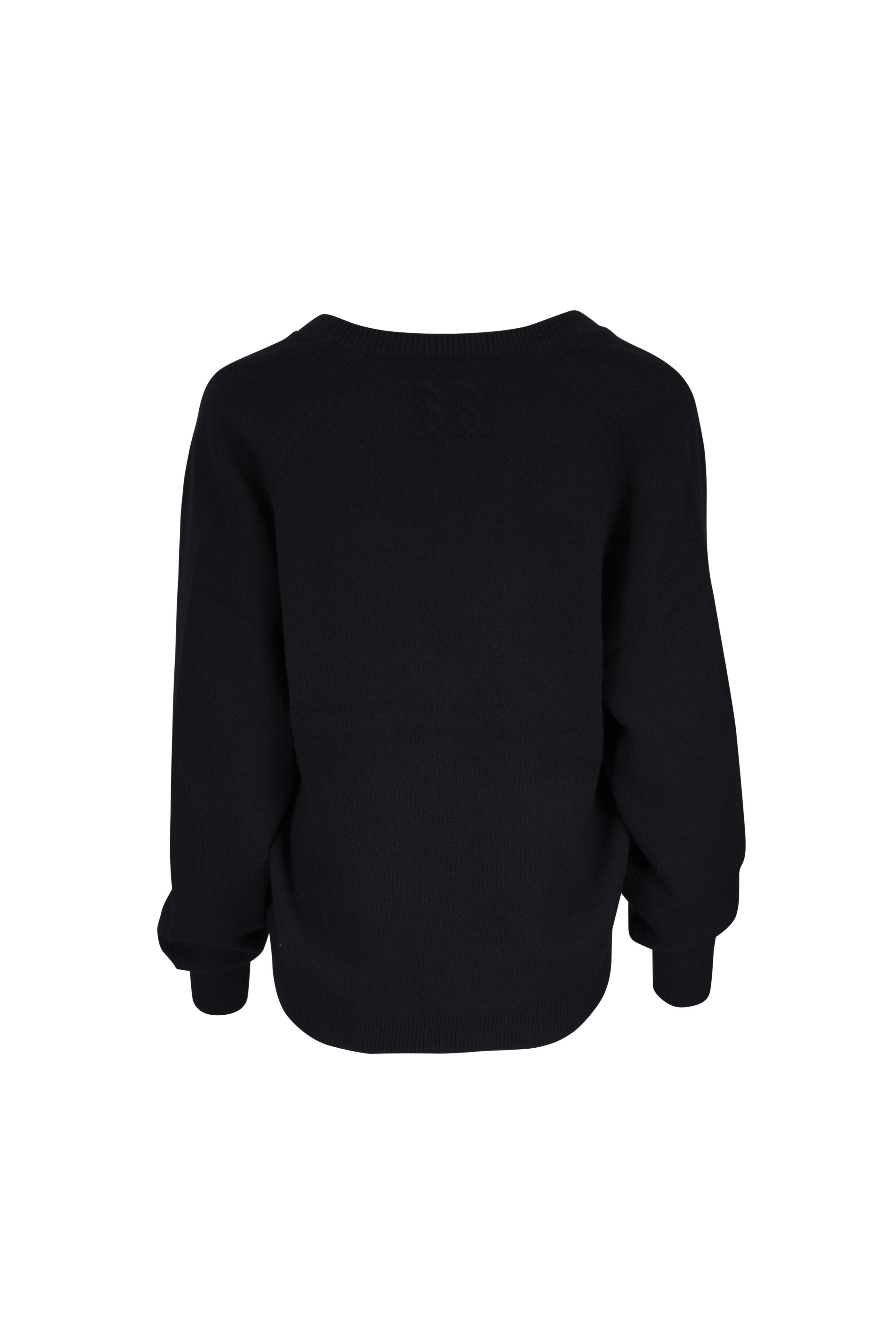 V-neckline. Ribbed trims. Imported. 100% cashmere. Dry clean.