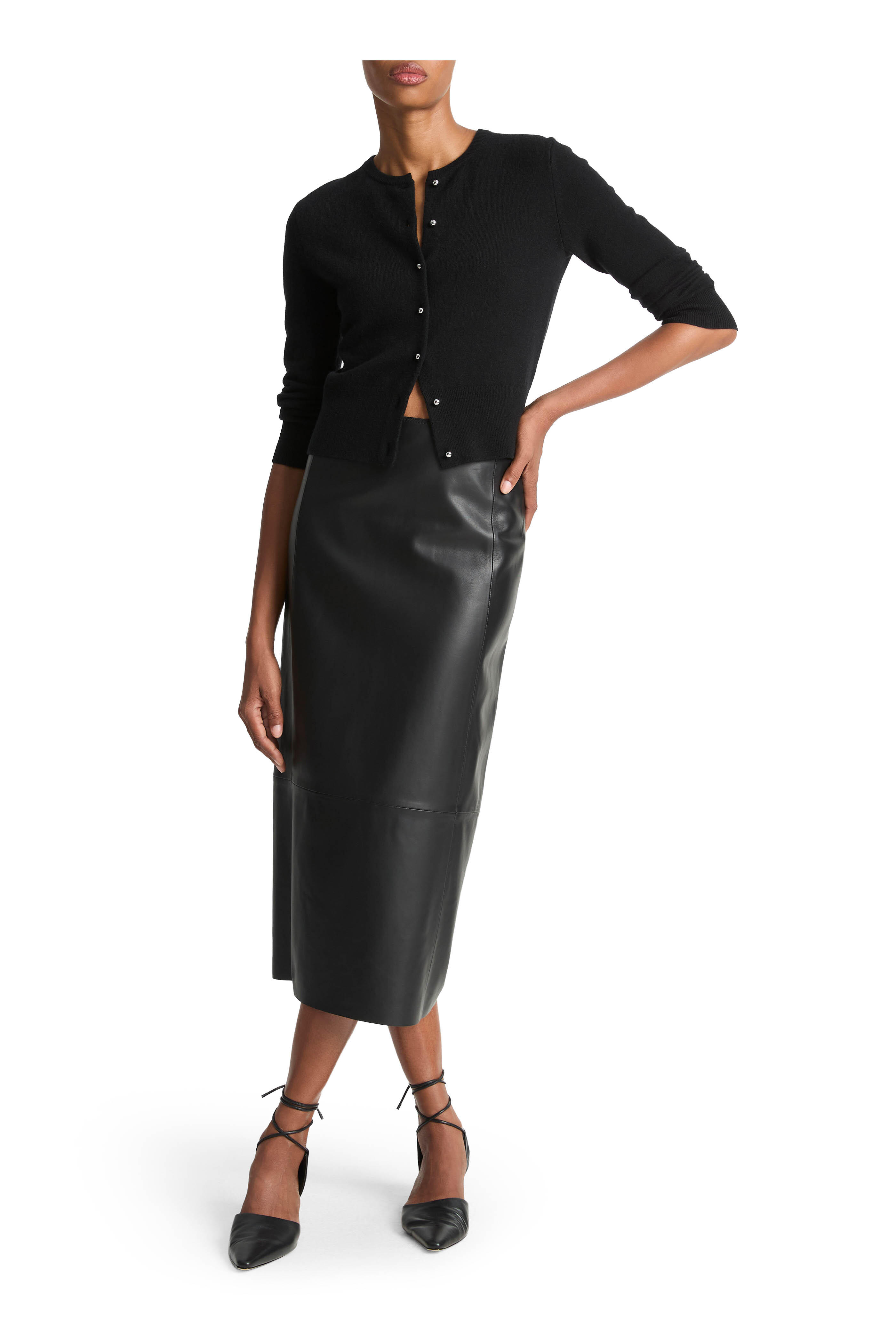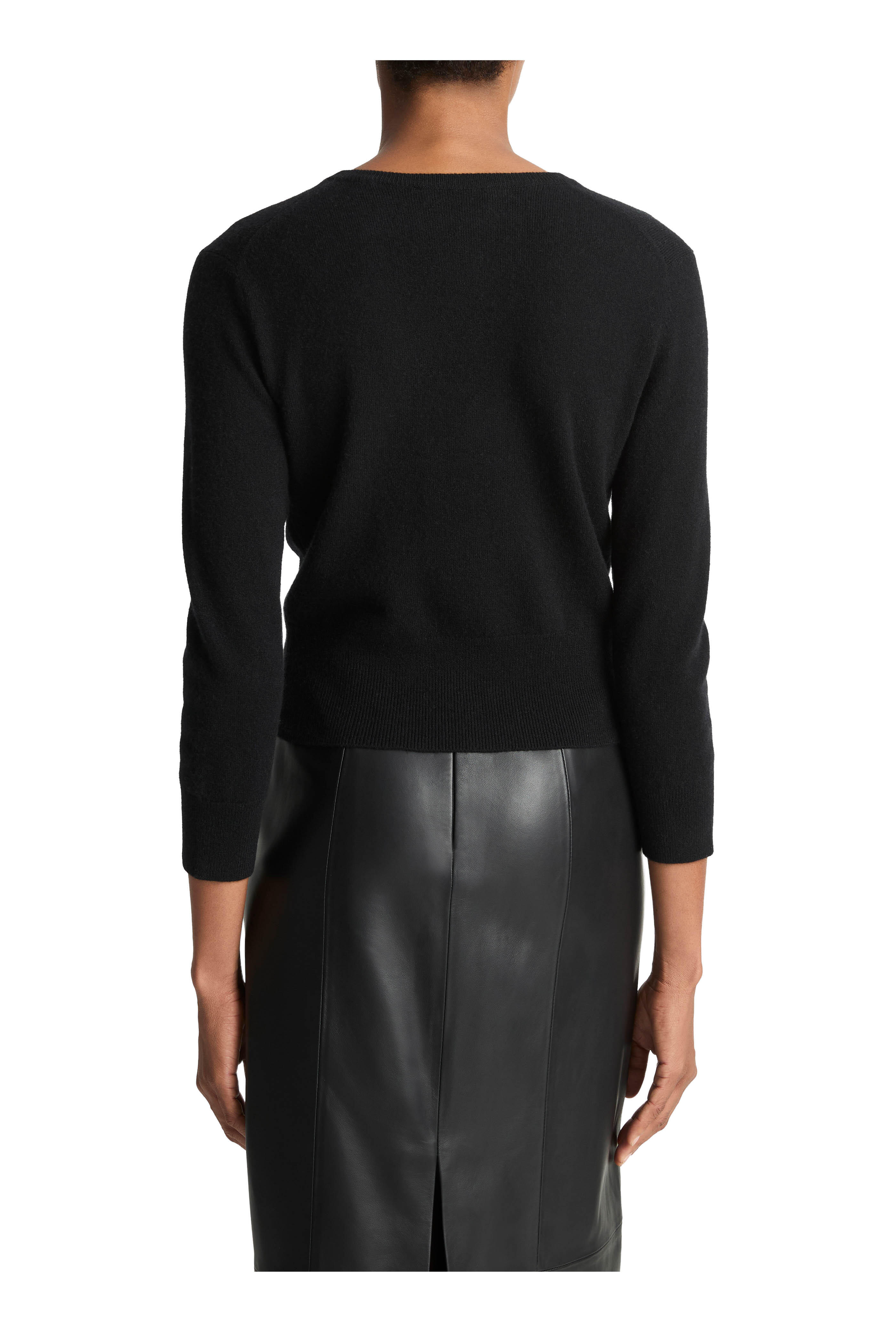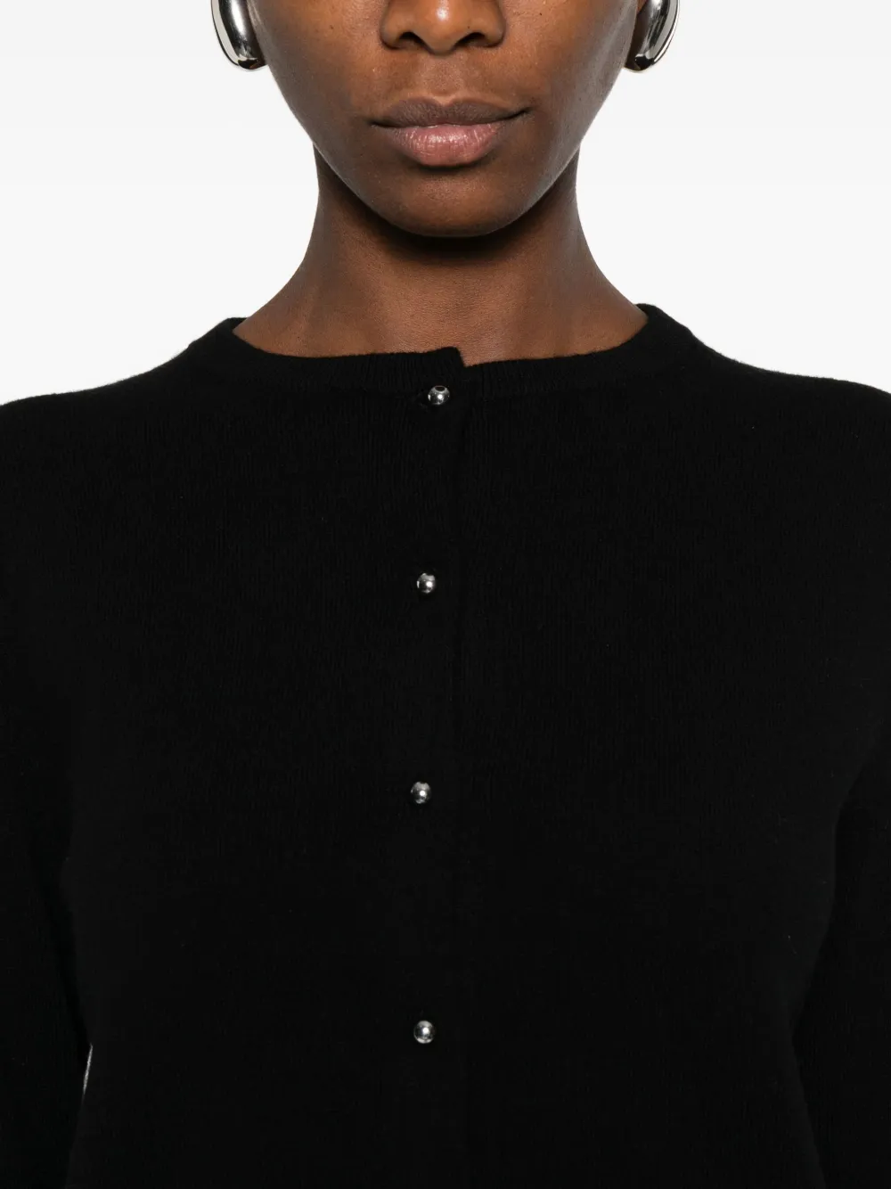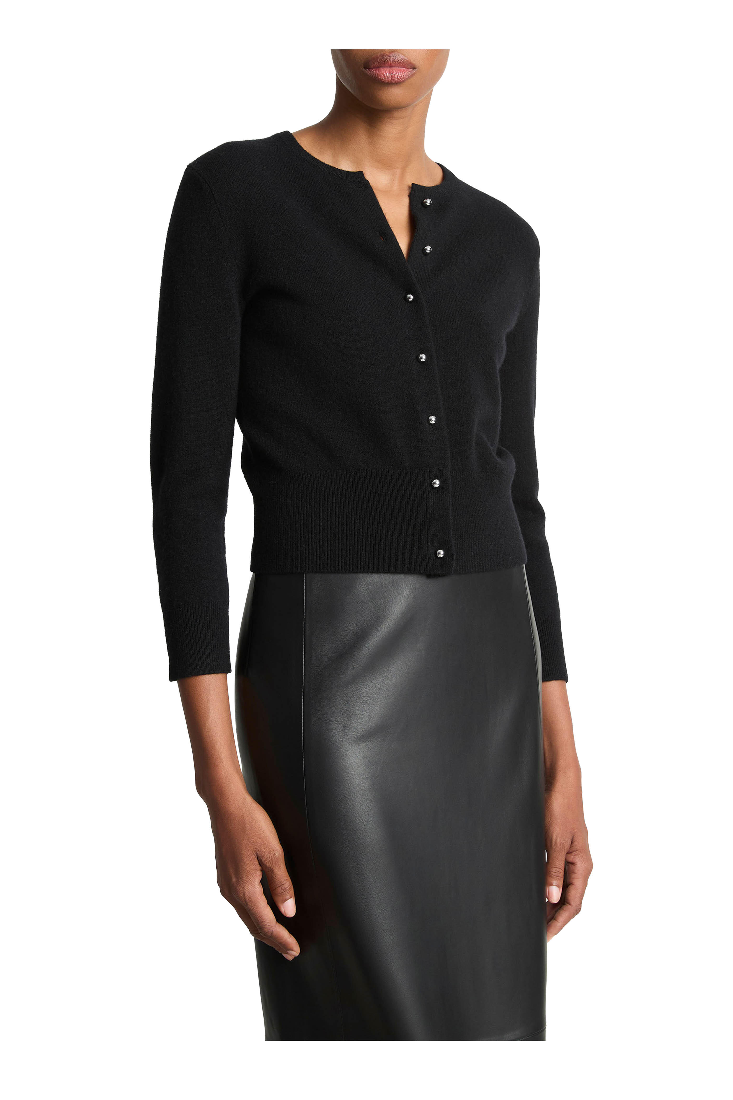 Crew neckline. Front button placket. Ribbed trims. Imported. 67% wool, 28% cashmere. 4% nylon, 1% spandex. Dry clean.