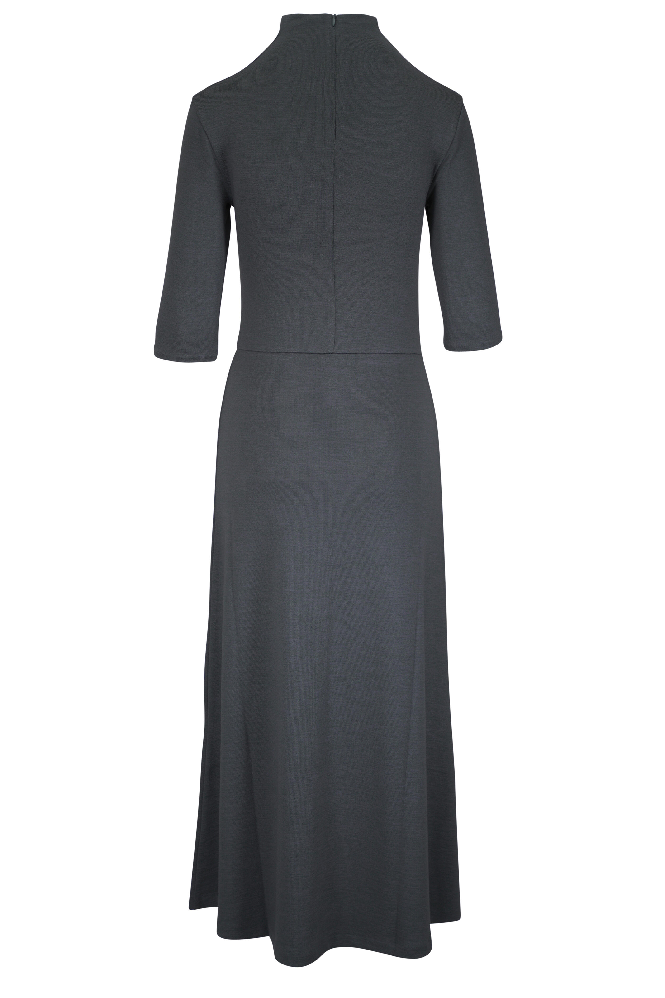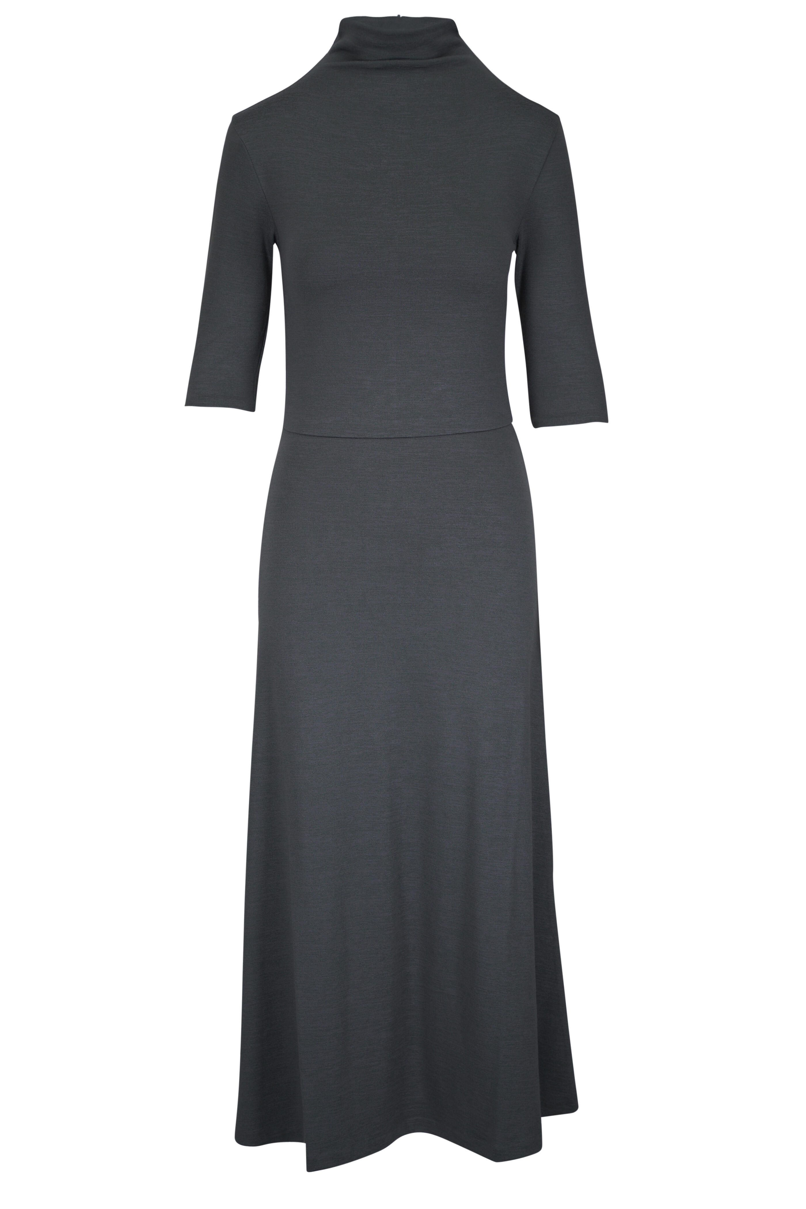 Turtleneck. Concealed back zip. Elbow length sleeves. Imported. Approximately 52" shoulder to hem. 53% polyester, 45% rayon, 2% spandex. Machine wash.