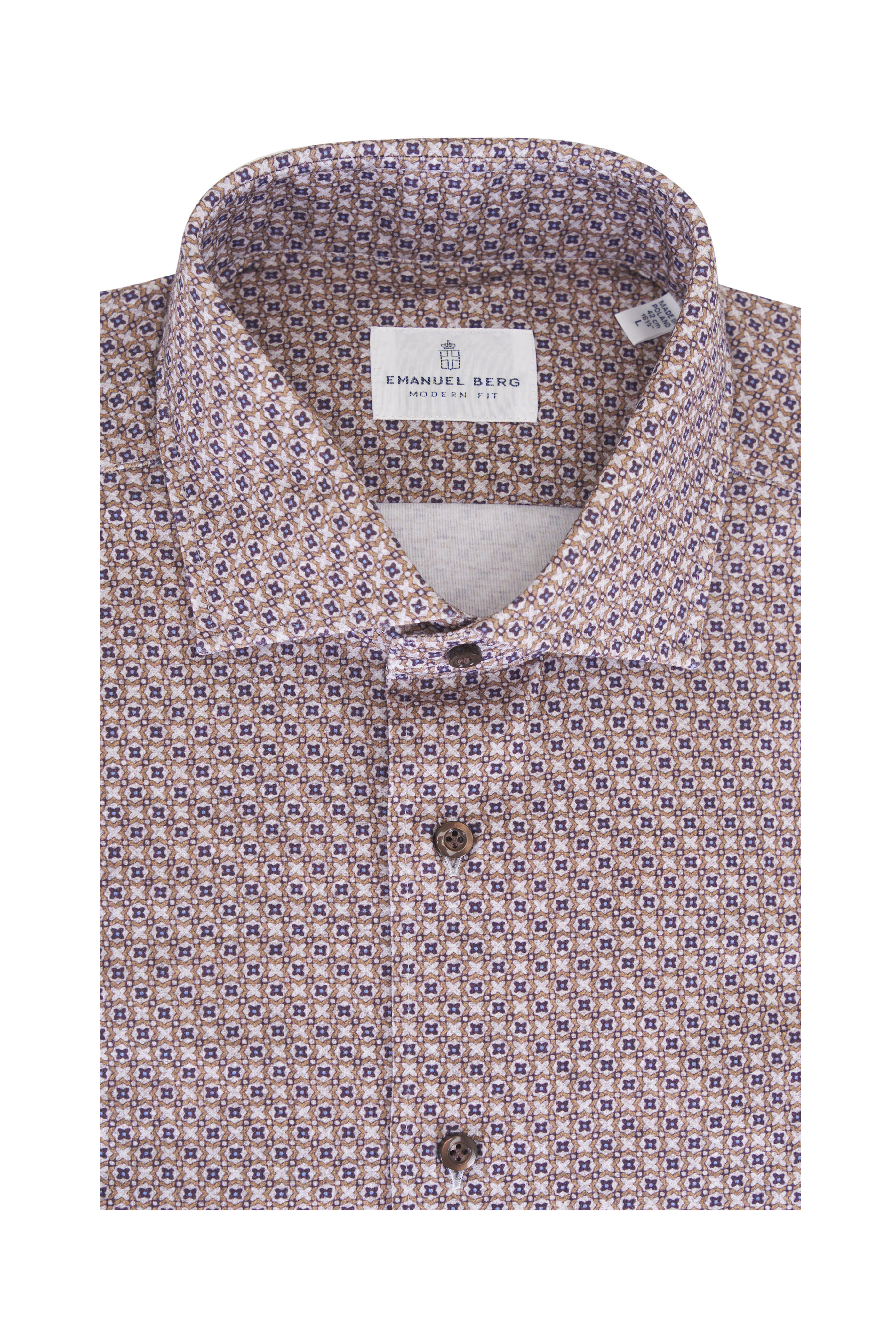 Spread collar. French front button placket. Adjustable single button mitered cuffs. Made in Poland. Modern fit. 89% cotton, 11% elastane. Machine wash.
