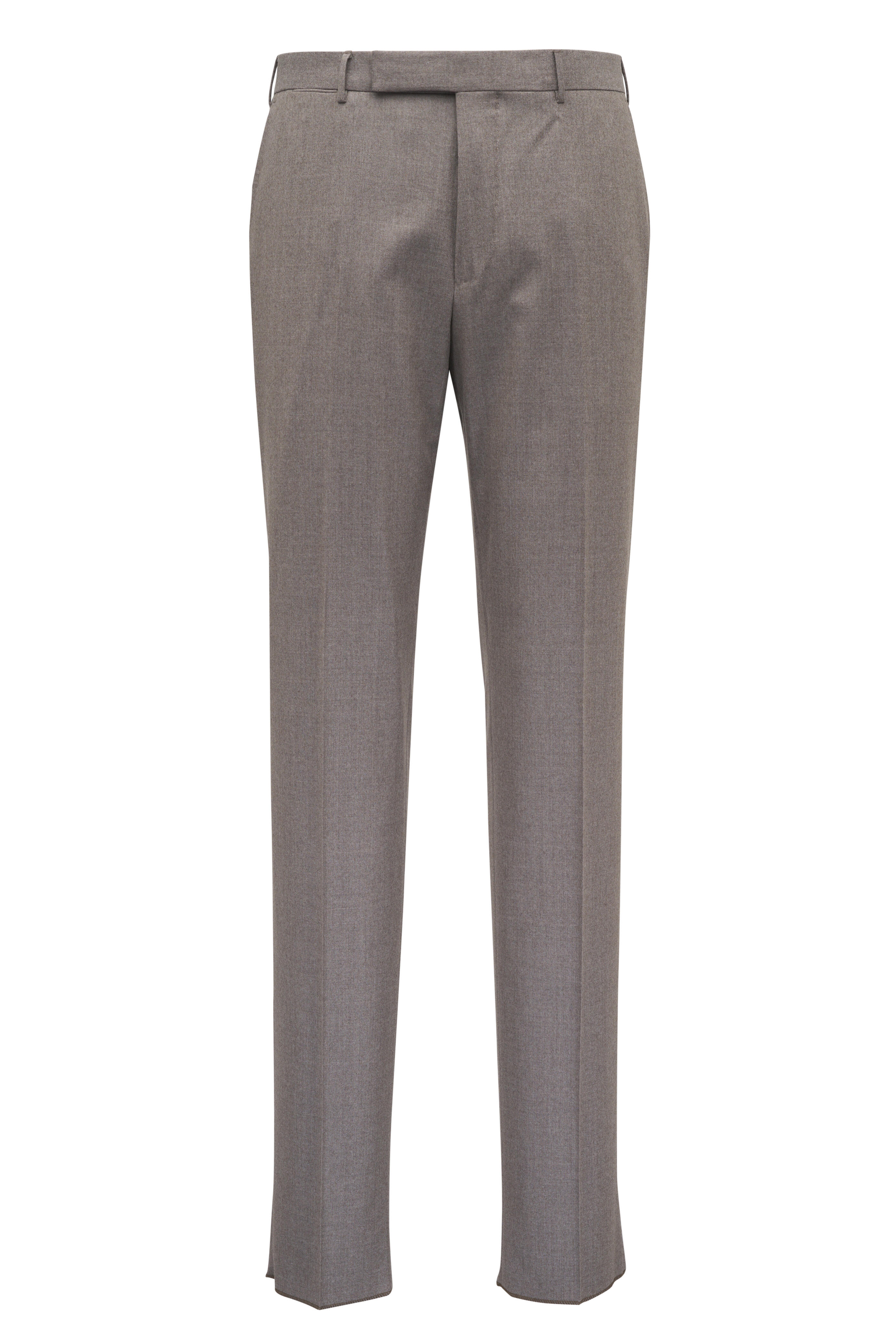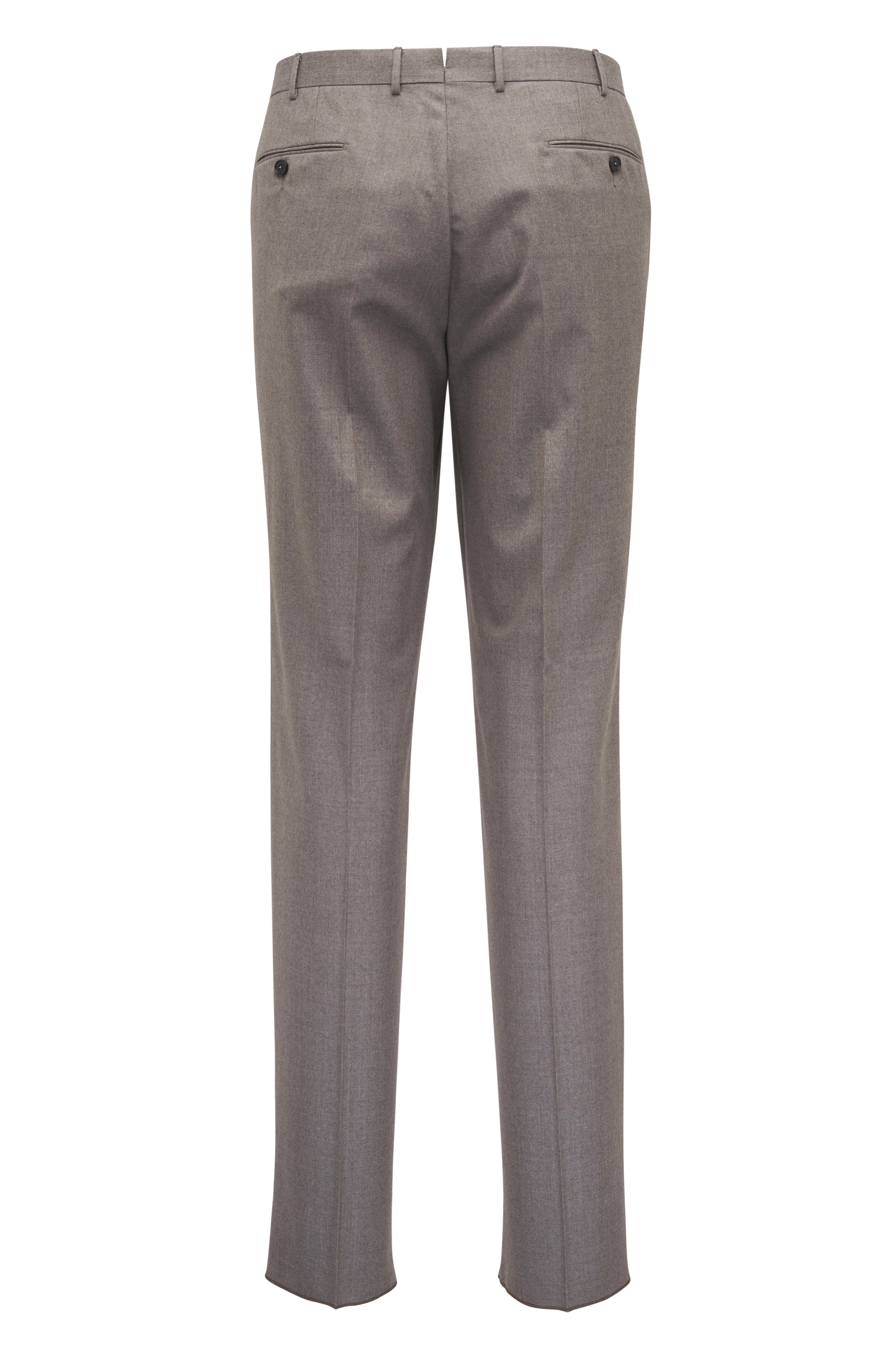 Banded waist; extended waist tab. Front slash pockets, back button-besom pockets. Unfinished hem. Imported. Regular fit. 100% Wool; lined. Dry clean.