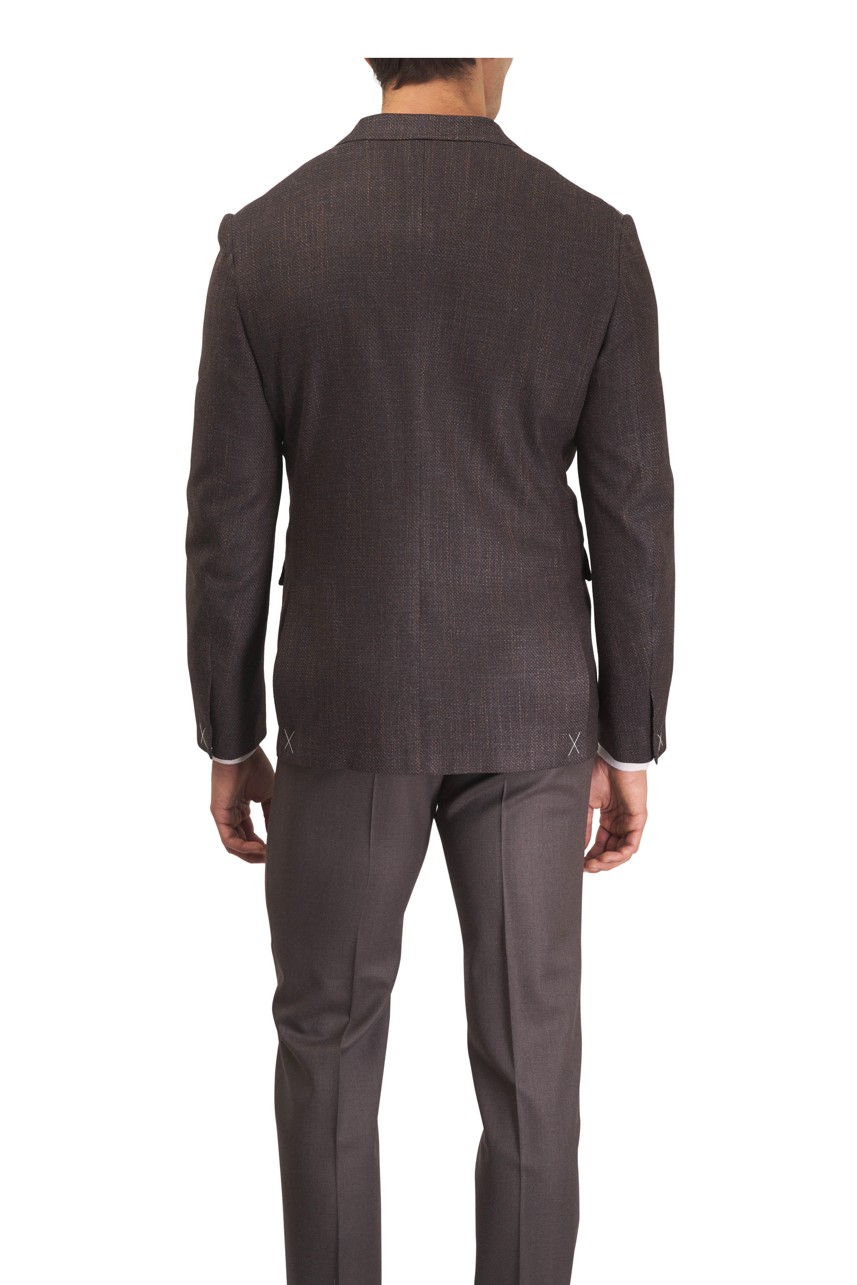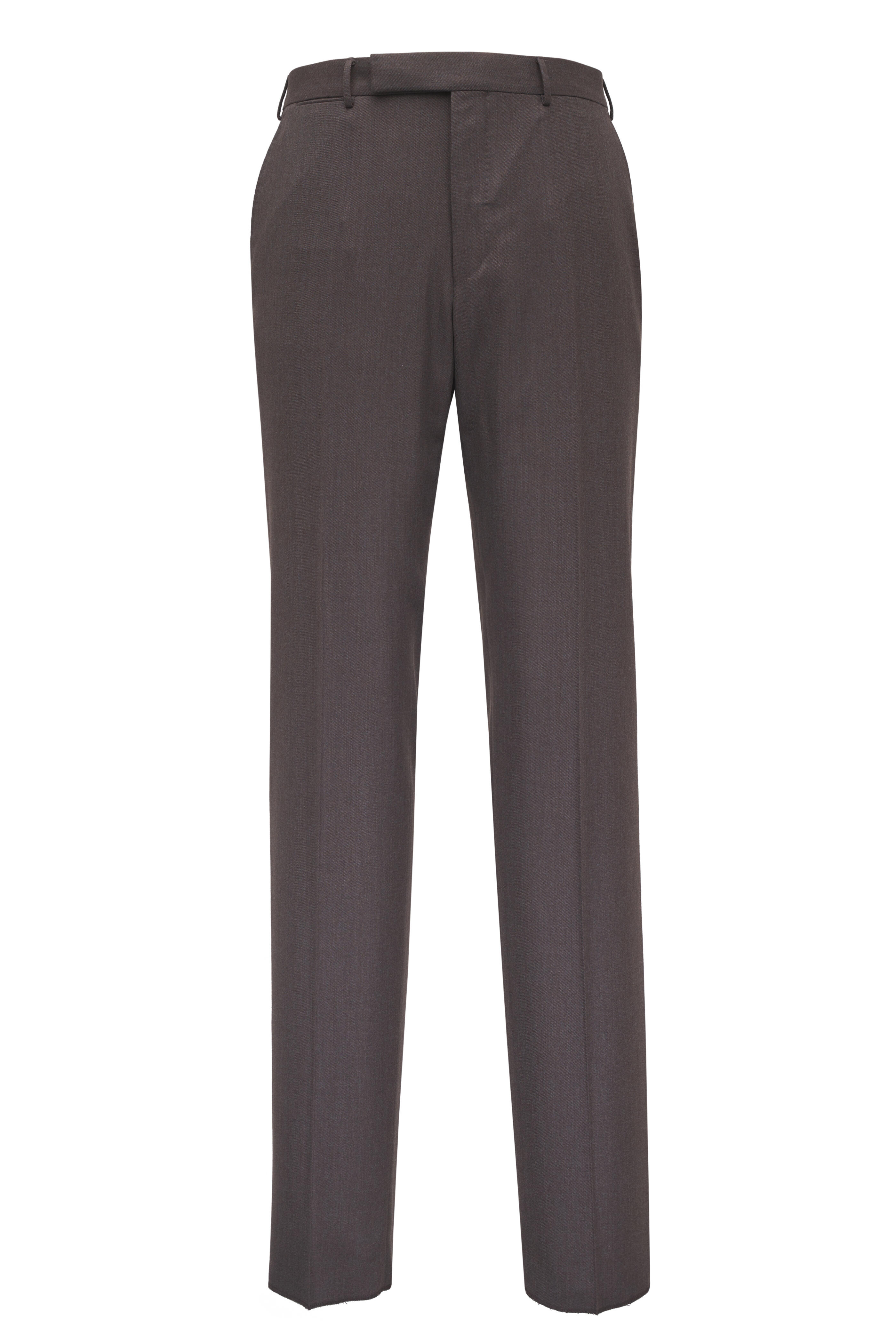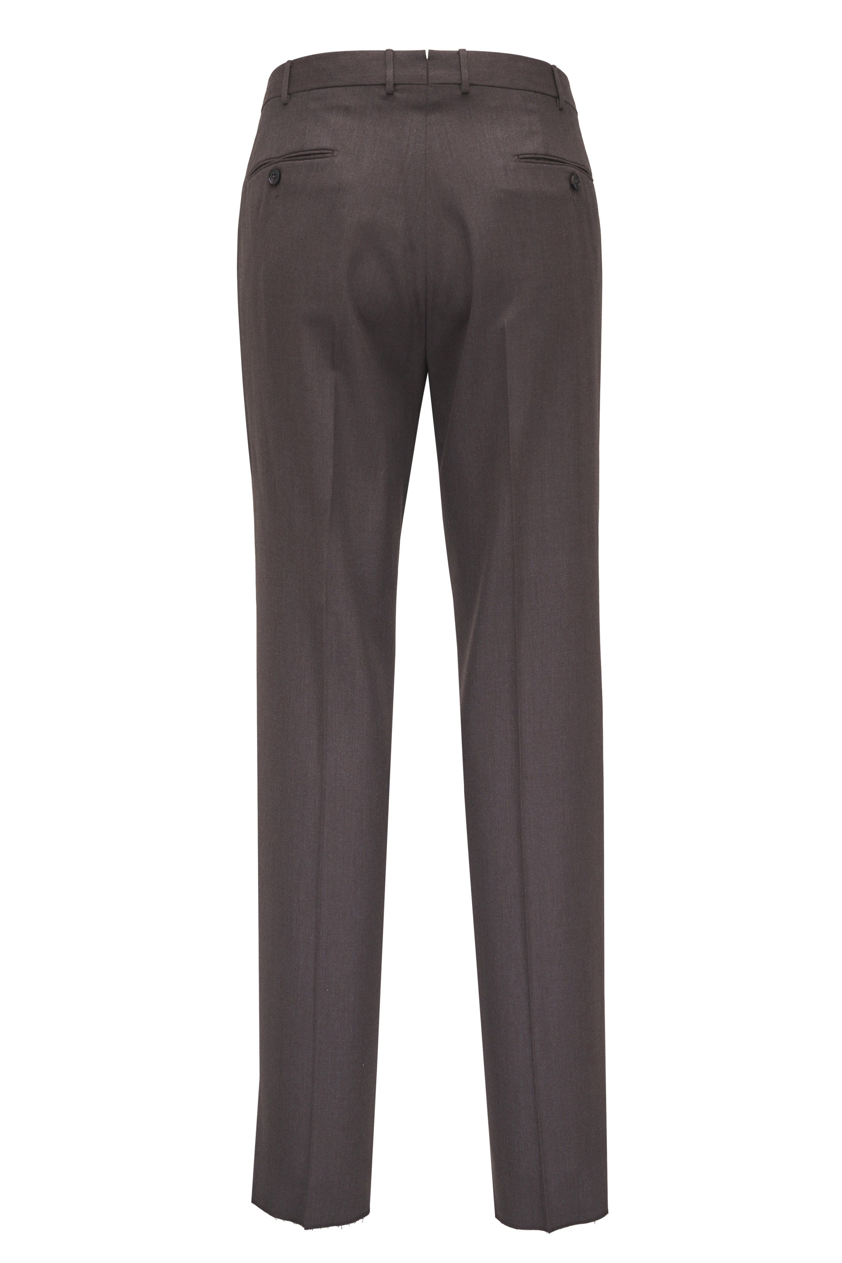 Zip fly with button tab closure. Banded waistband; belt loops. Side slash pockets; back welt button pockets. Unfinished hem. Imported. 34" Inseam (size 36 R). 100% Wool. Dry clean.