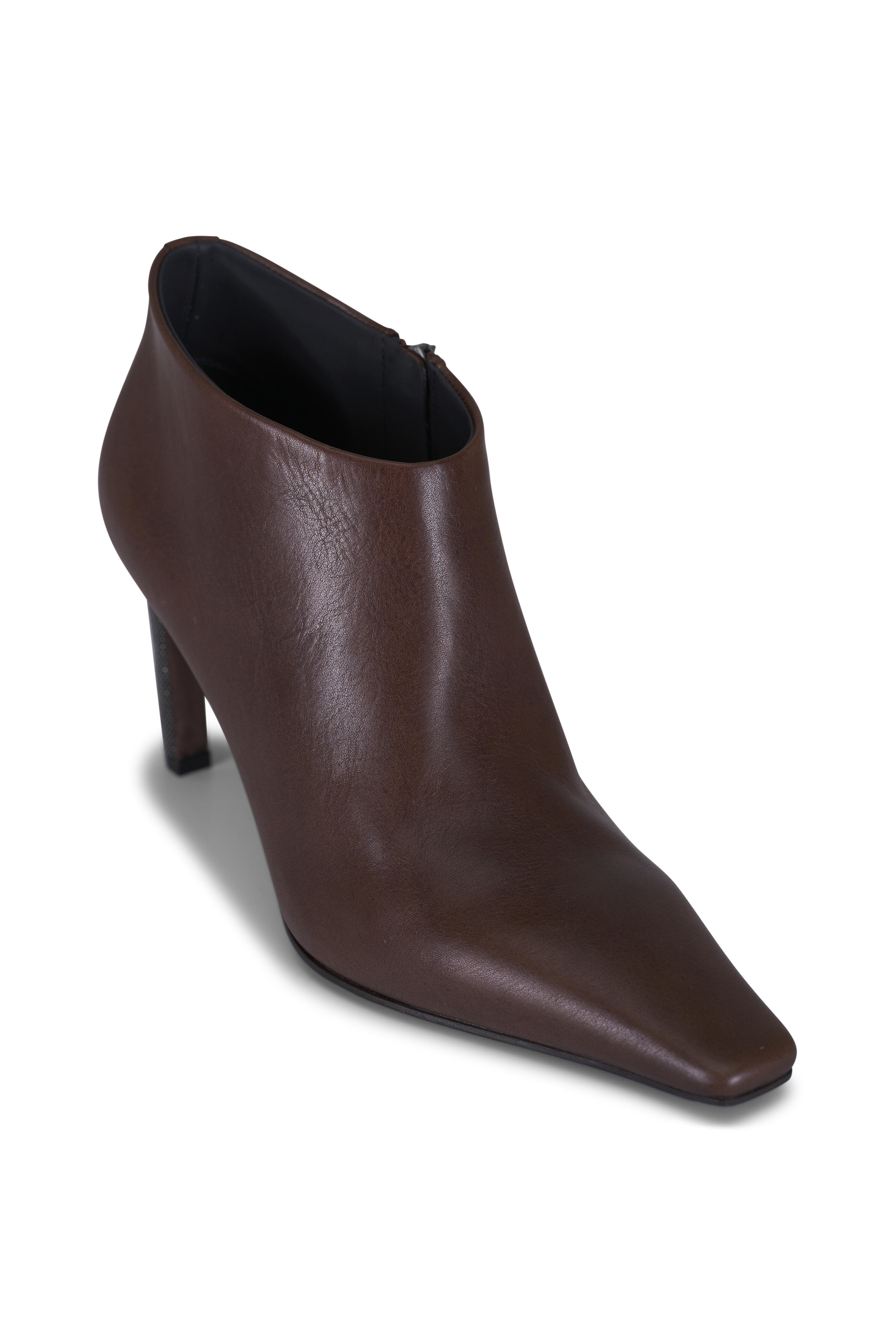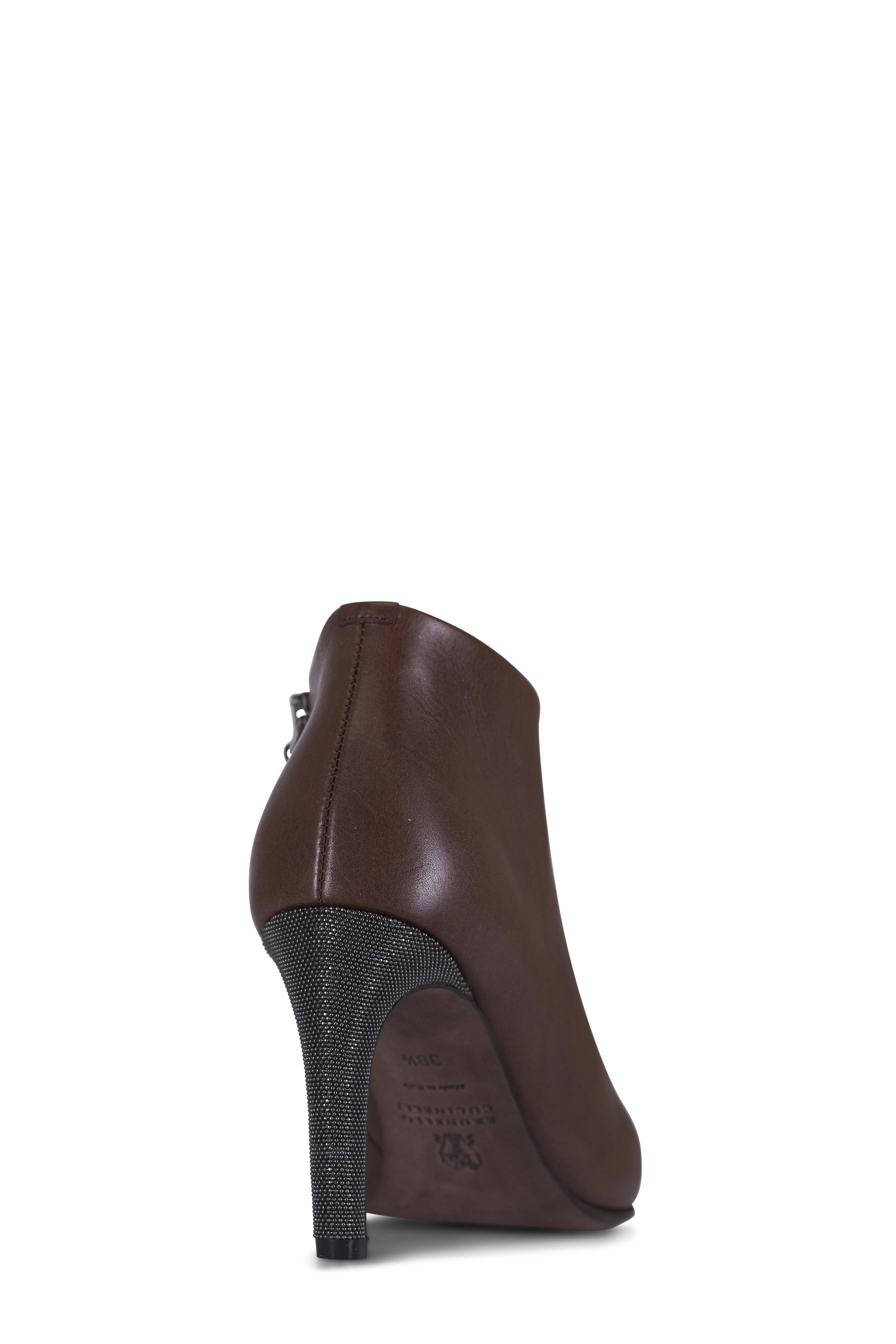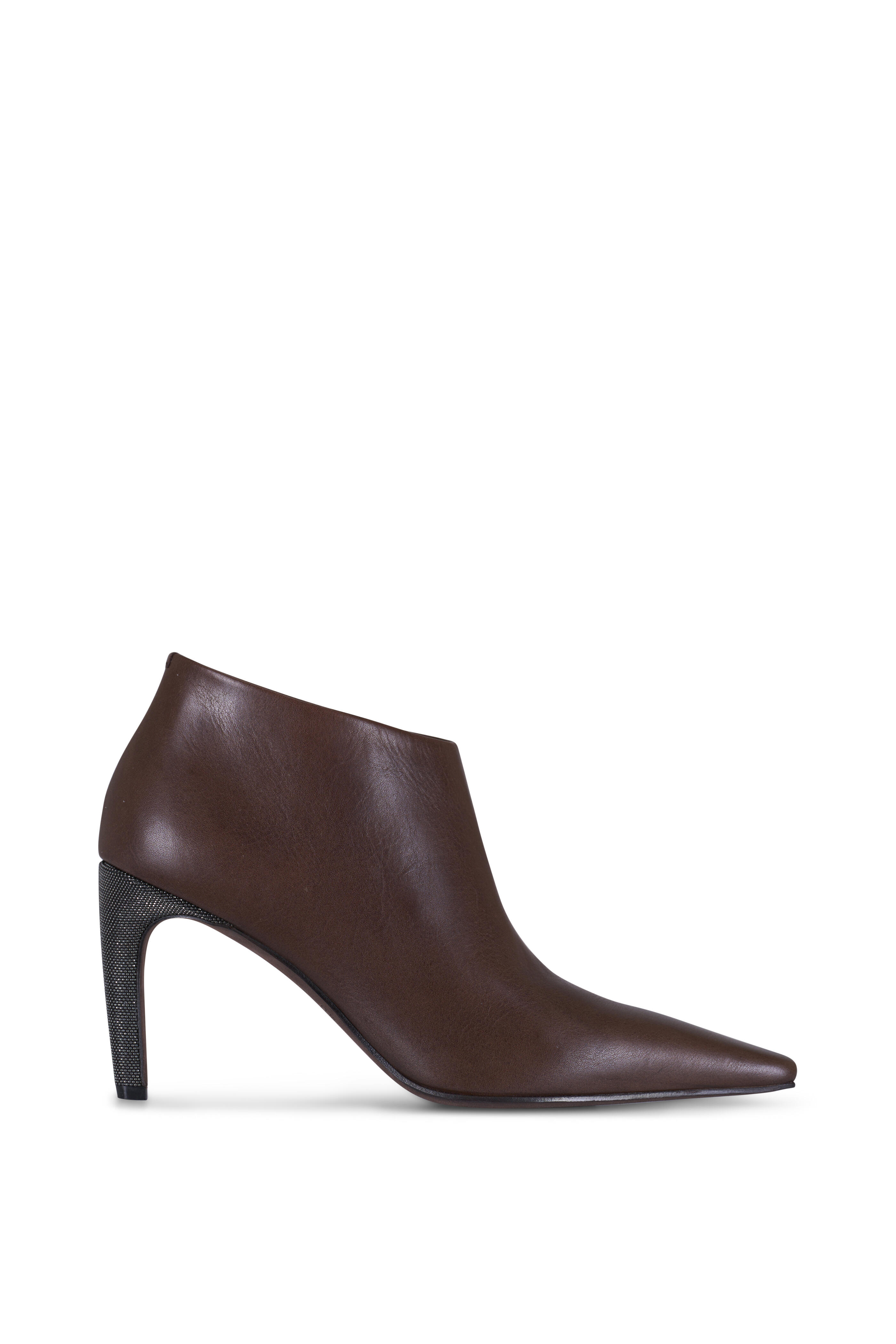 Smooth leather upper. Pointed toe. Side zip closure. Monili covered heel. Leather sole with rubber inset. Made in Italy. Heel measurement: 80mm.