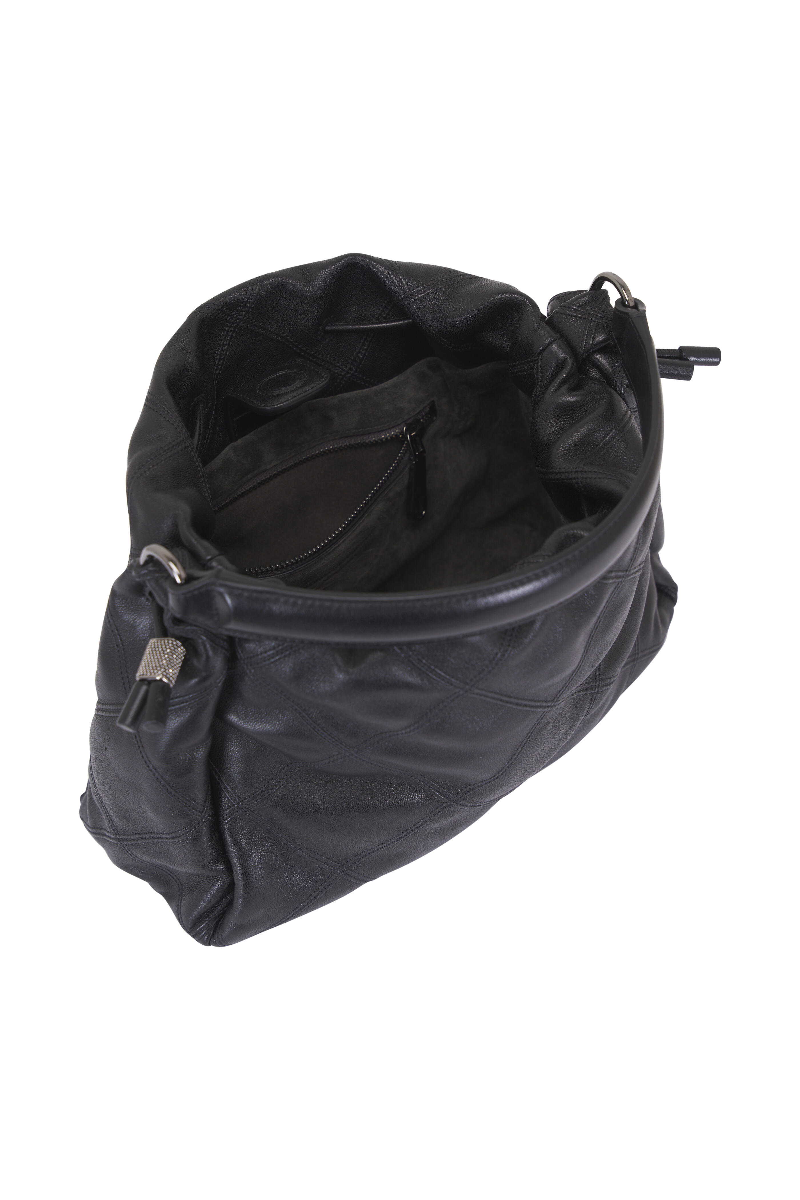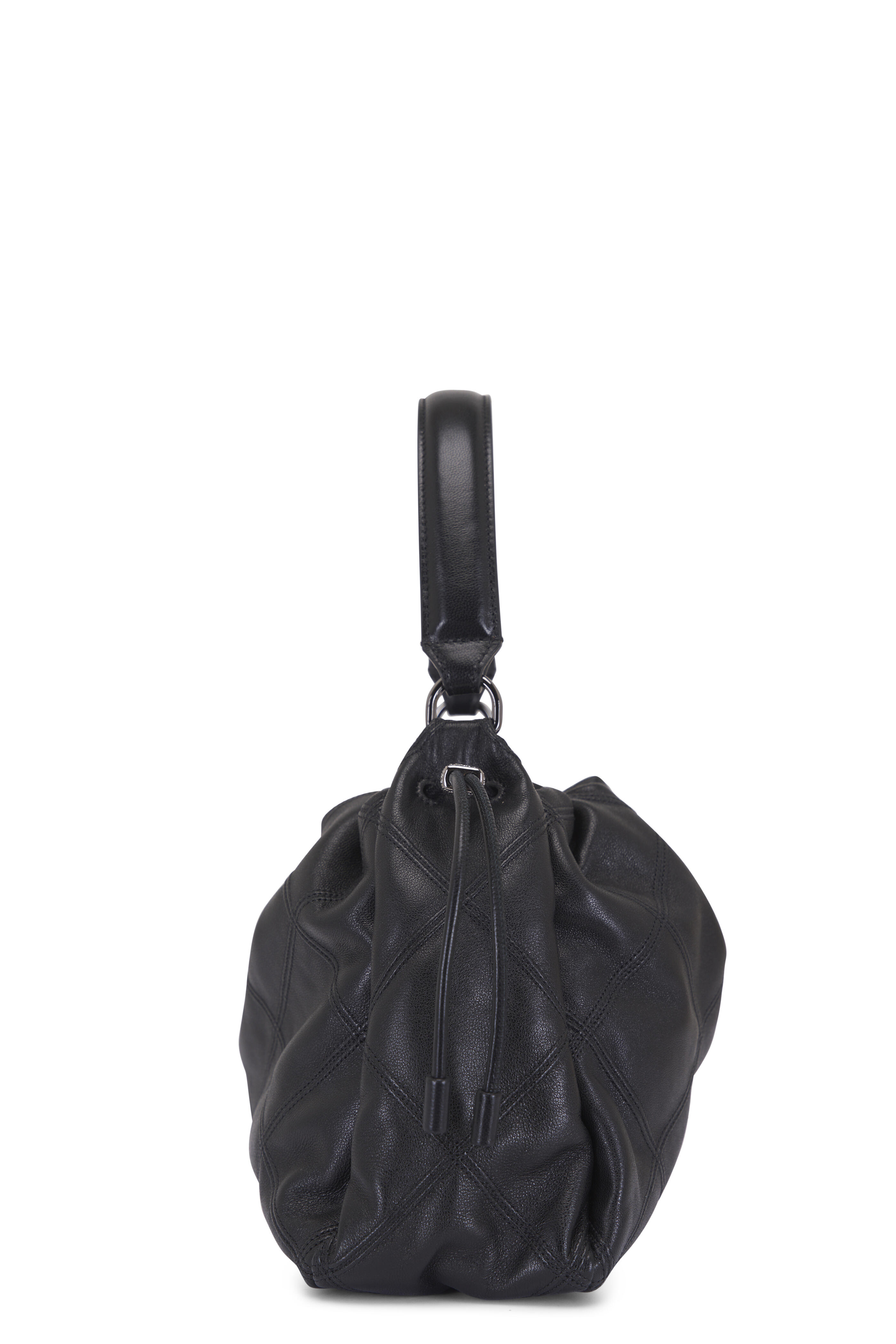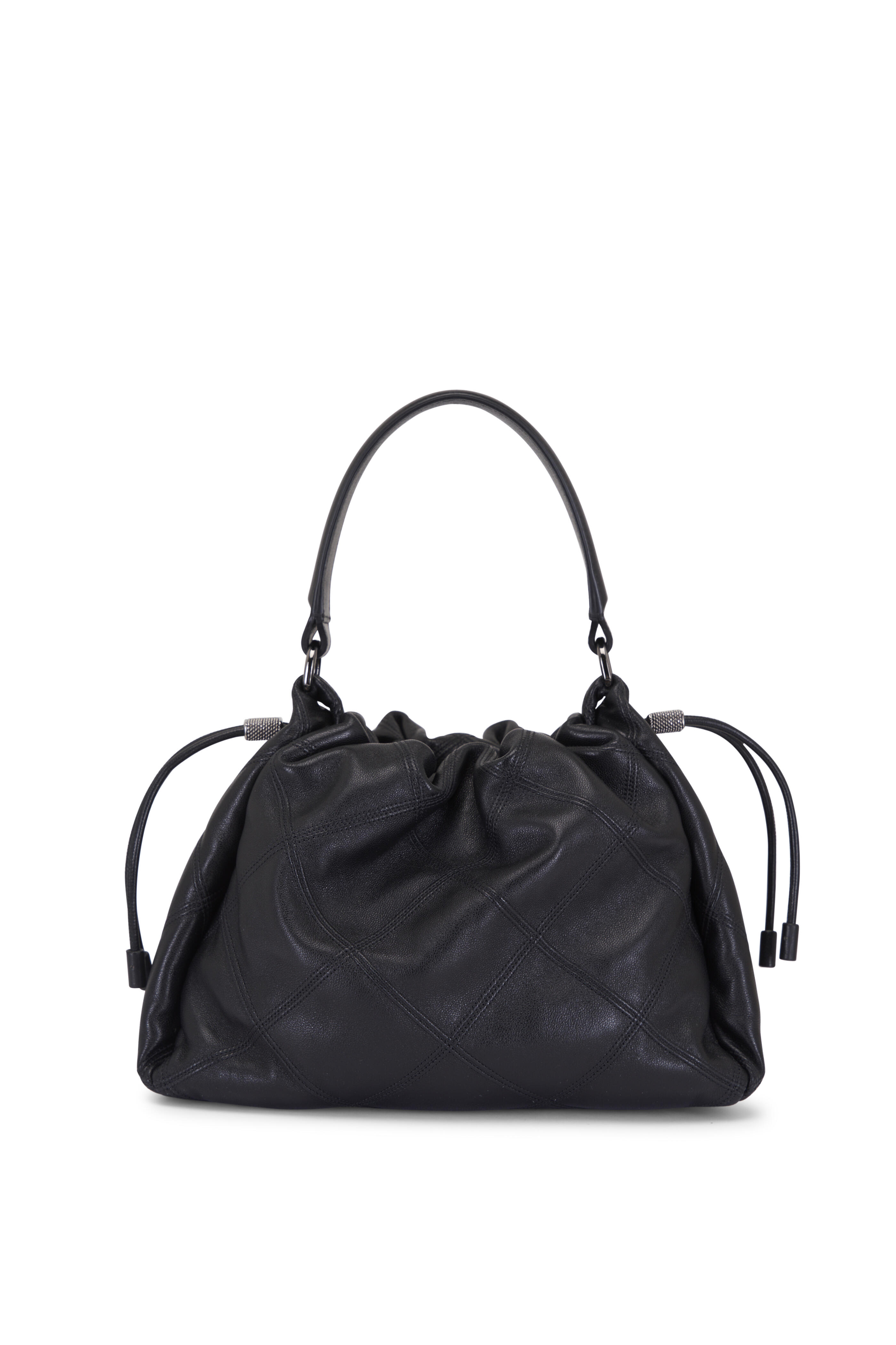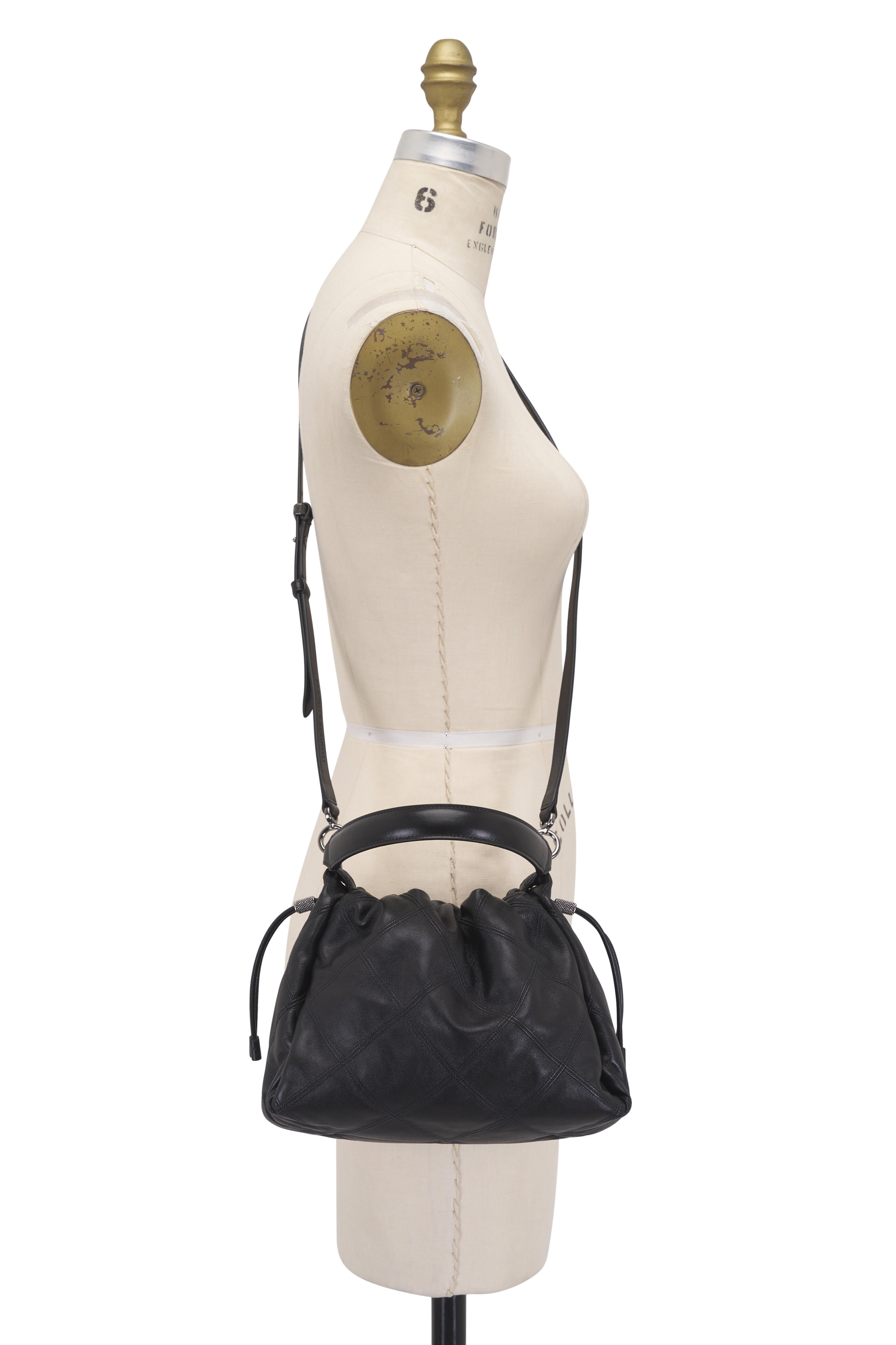 Nappa leather. Top handle. Adjustable and detachable shoulder strap. Drawstring closure. Internal pocket with zip closure. Leather lining. Monili detailing. Made in Italy. Length: 9.8". Height: 7". Width: 3.1".