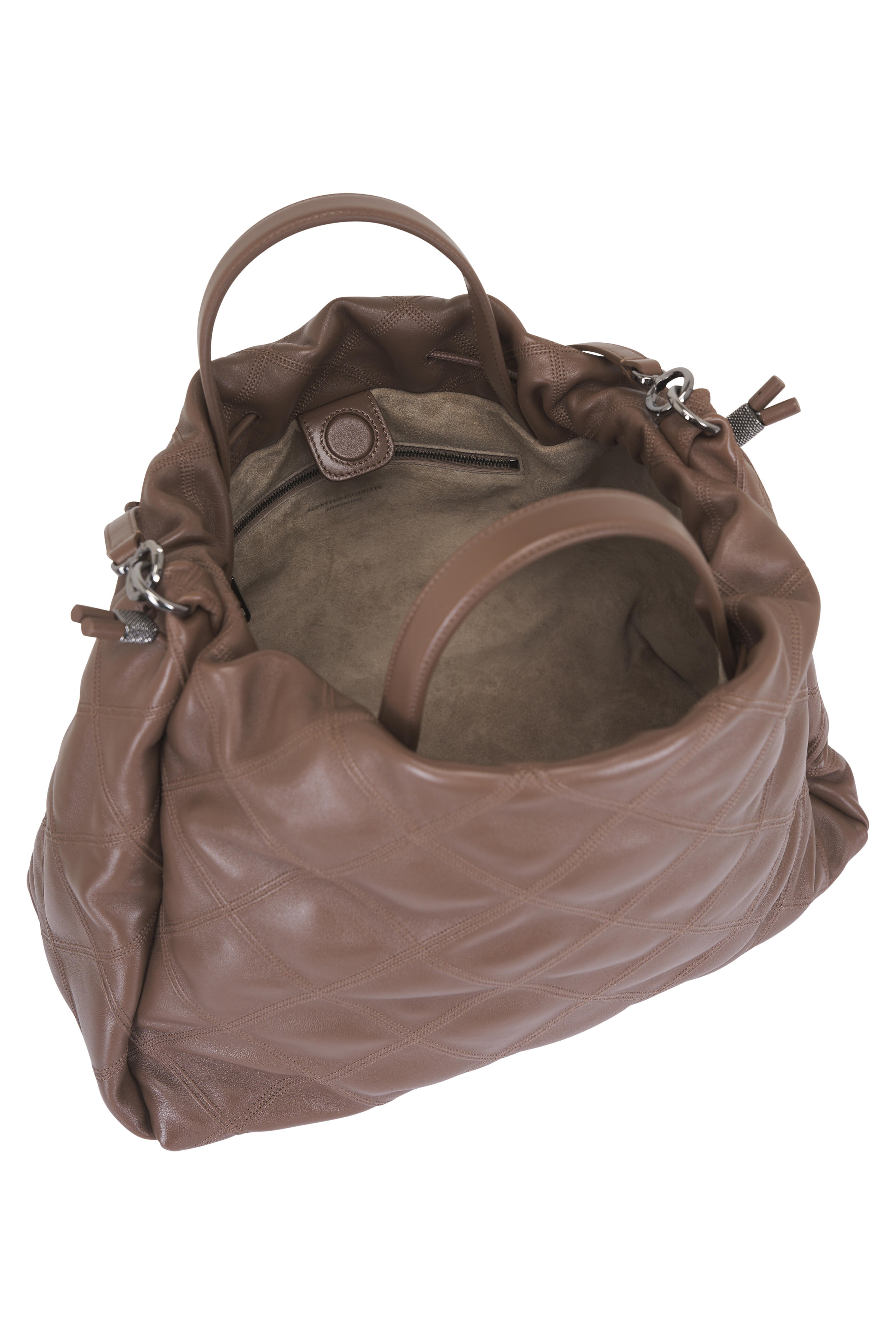 Leather. Dual top handles. Magnetic closure; drawstring closure. Adjustable and detachable shoulder strap. Internal pocket with zip closure. Suede lining. Monili detailing. Made in Italy. Length: 15.75". Height: 10.2". Width: 6.3".