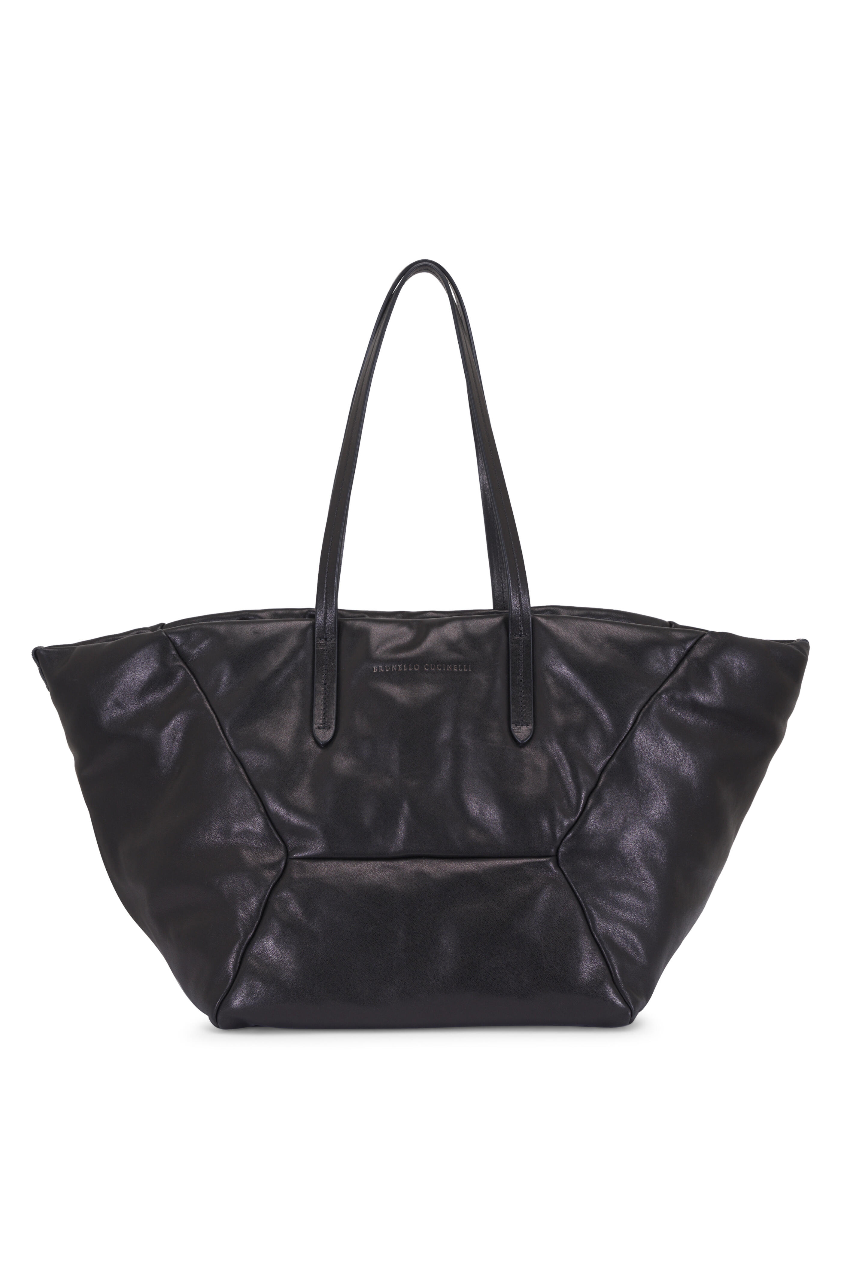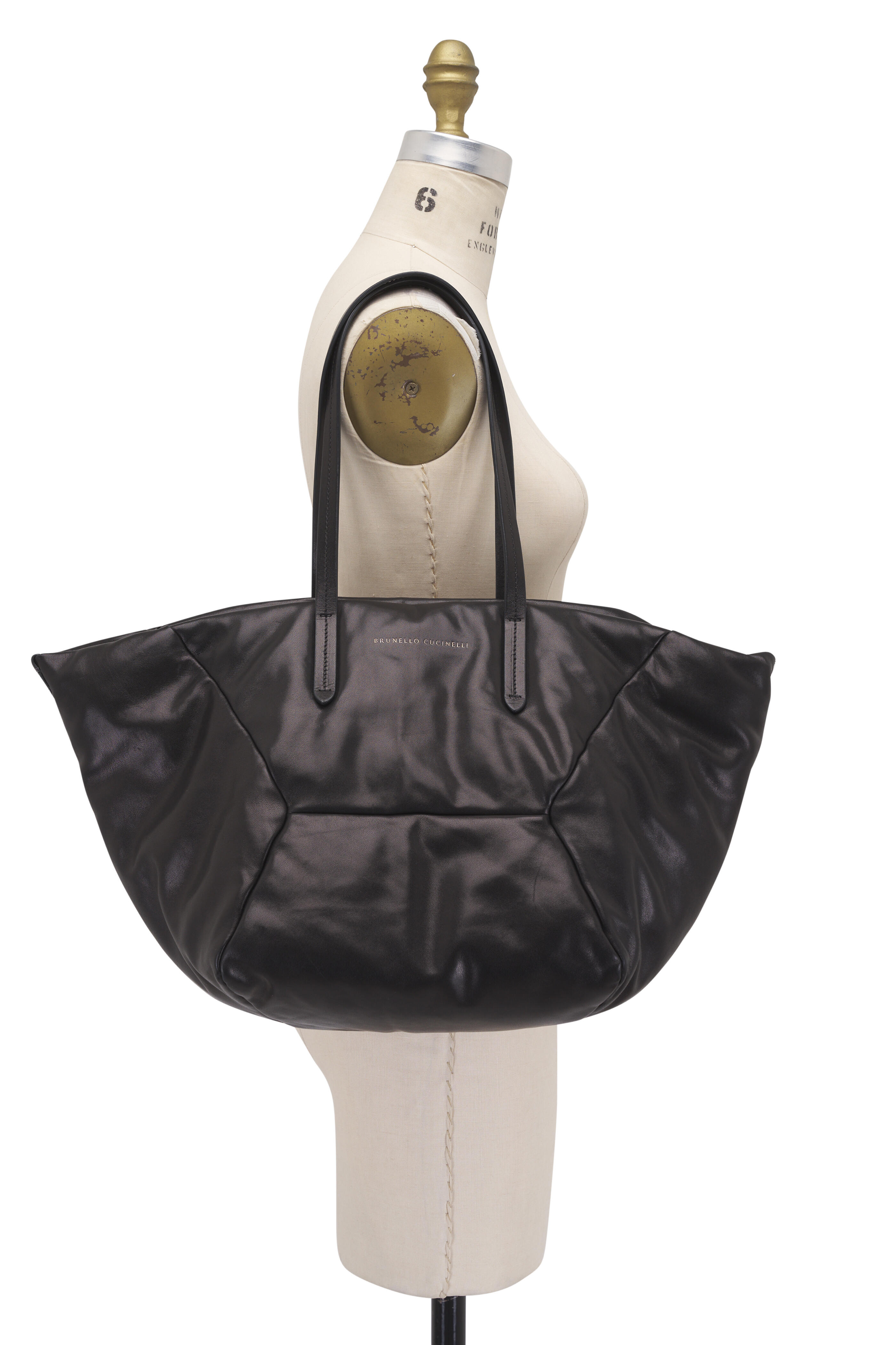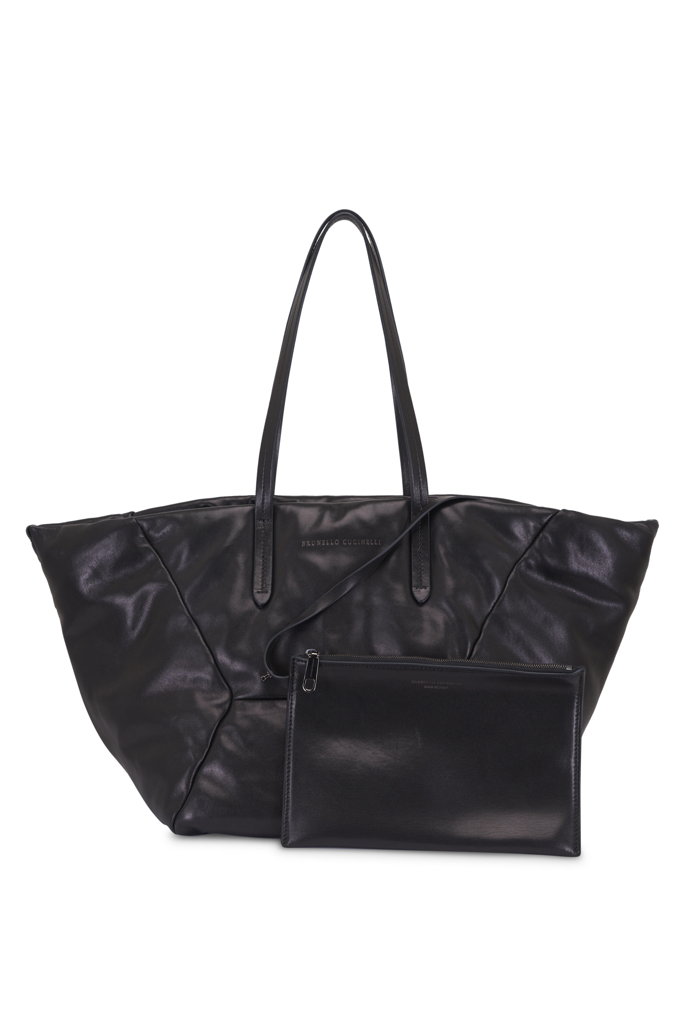 Leather outer. Dual top handles. Interior magnetic closure. Detachable leather pouch. Leather lining. Made in Italy. Length: 20.8". Height: 10.6". Width: 9.8".