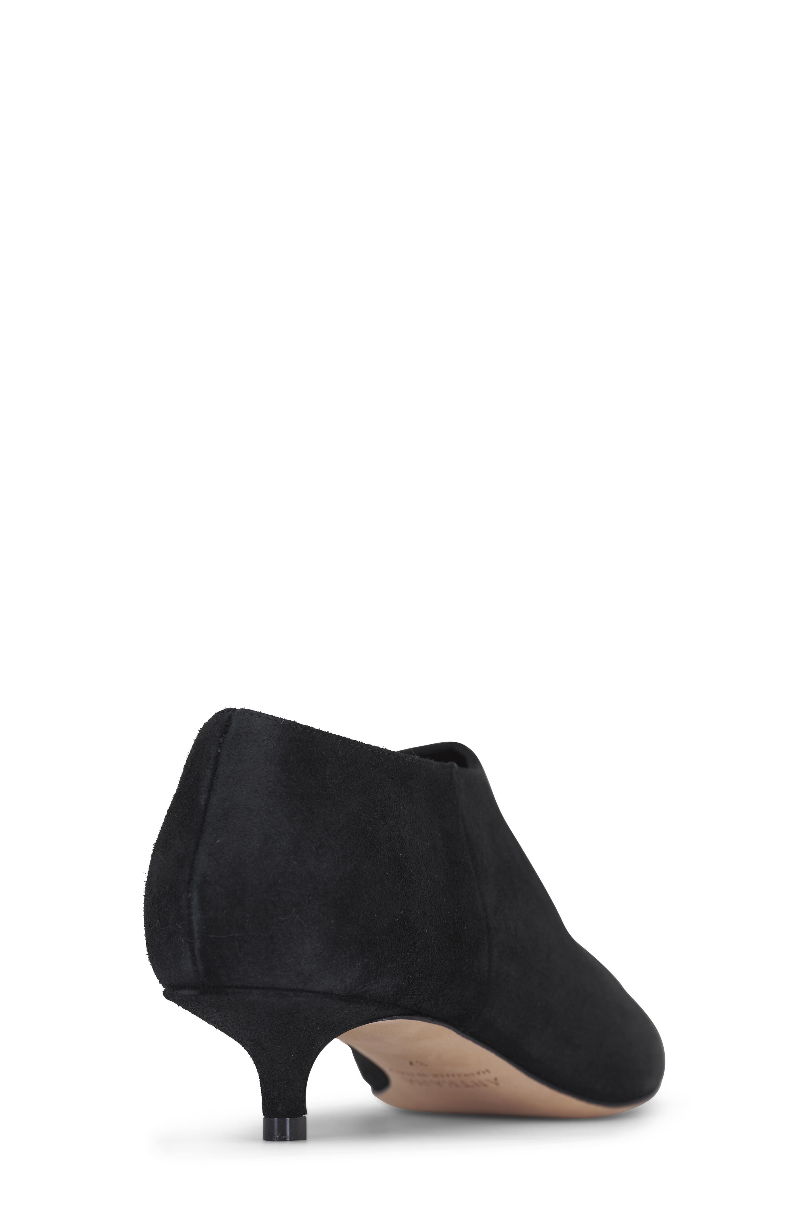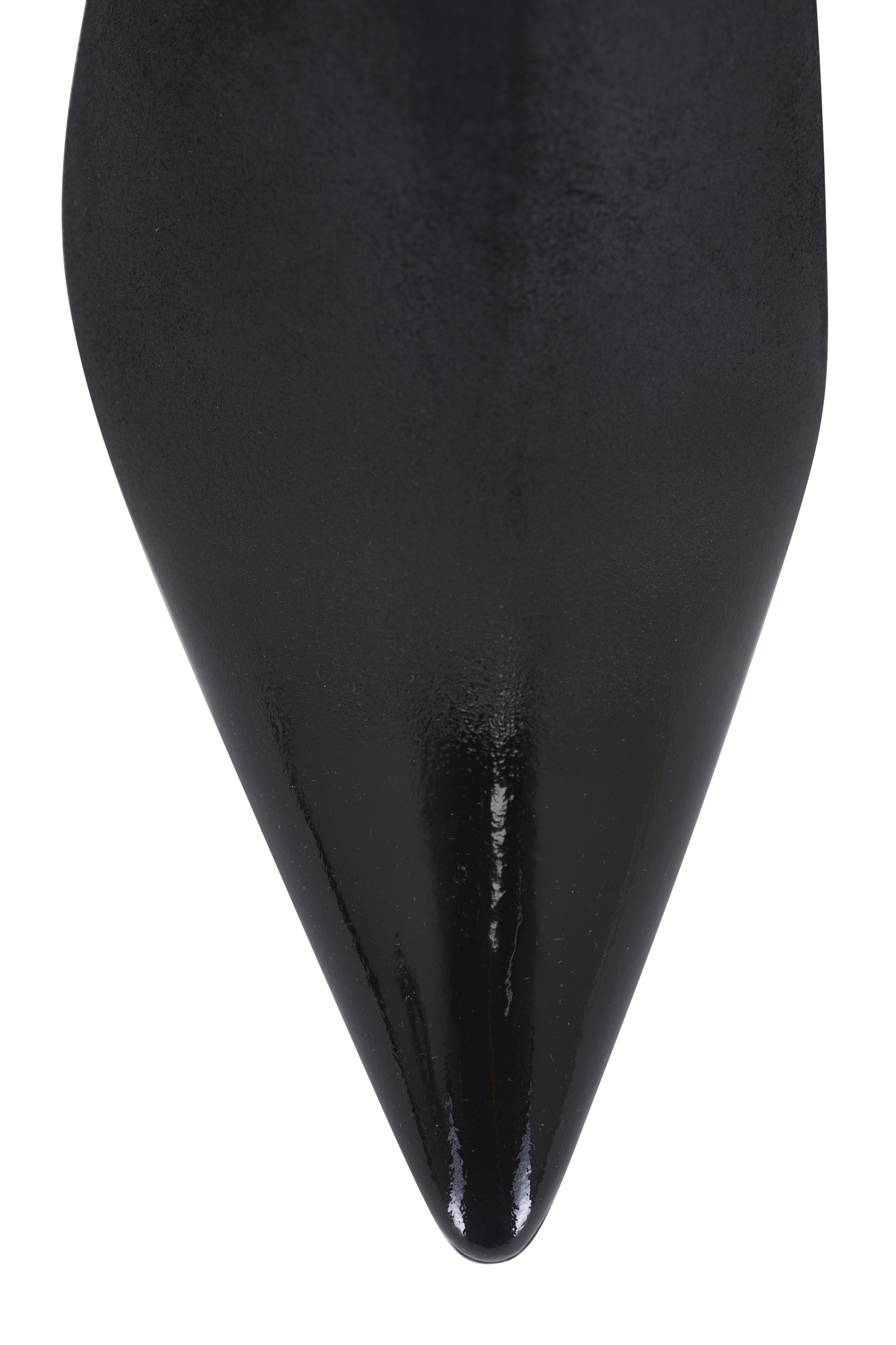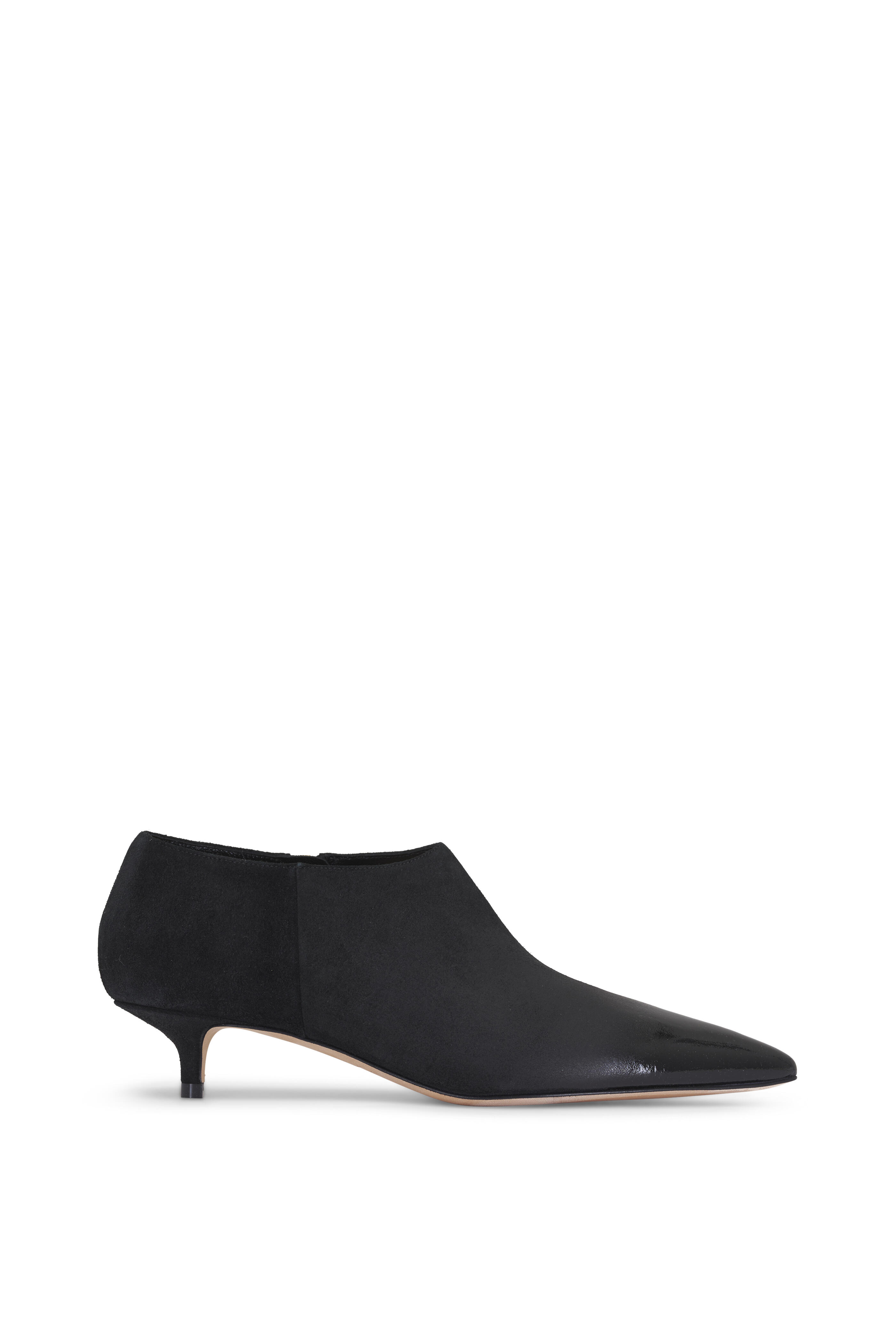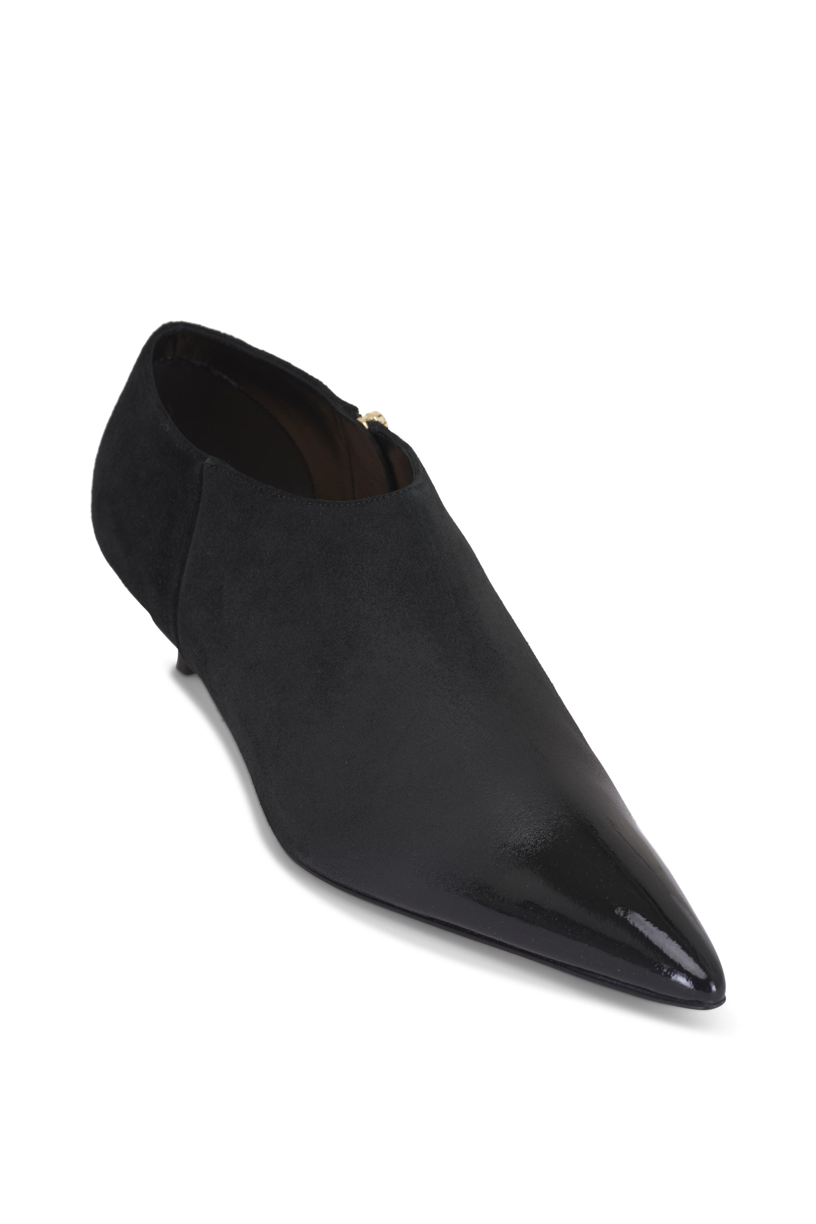 Suede and patent leather upper. Pointed toe. Side zip. Leather lining and insole. Leather sole. Made in Italy. Heel measurement: 35mm.