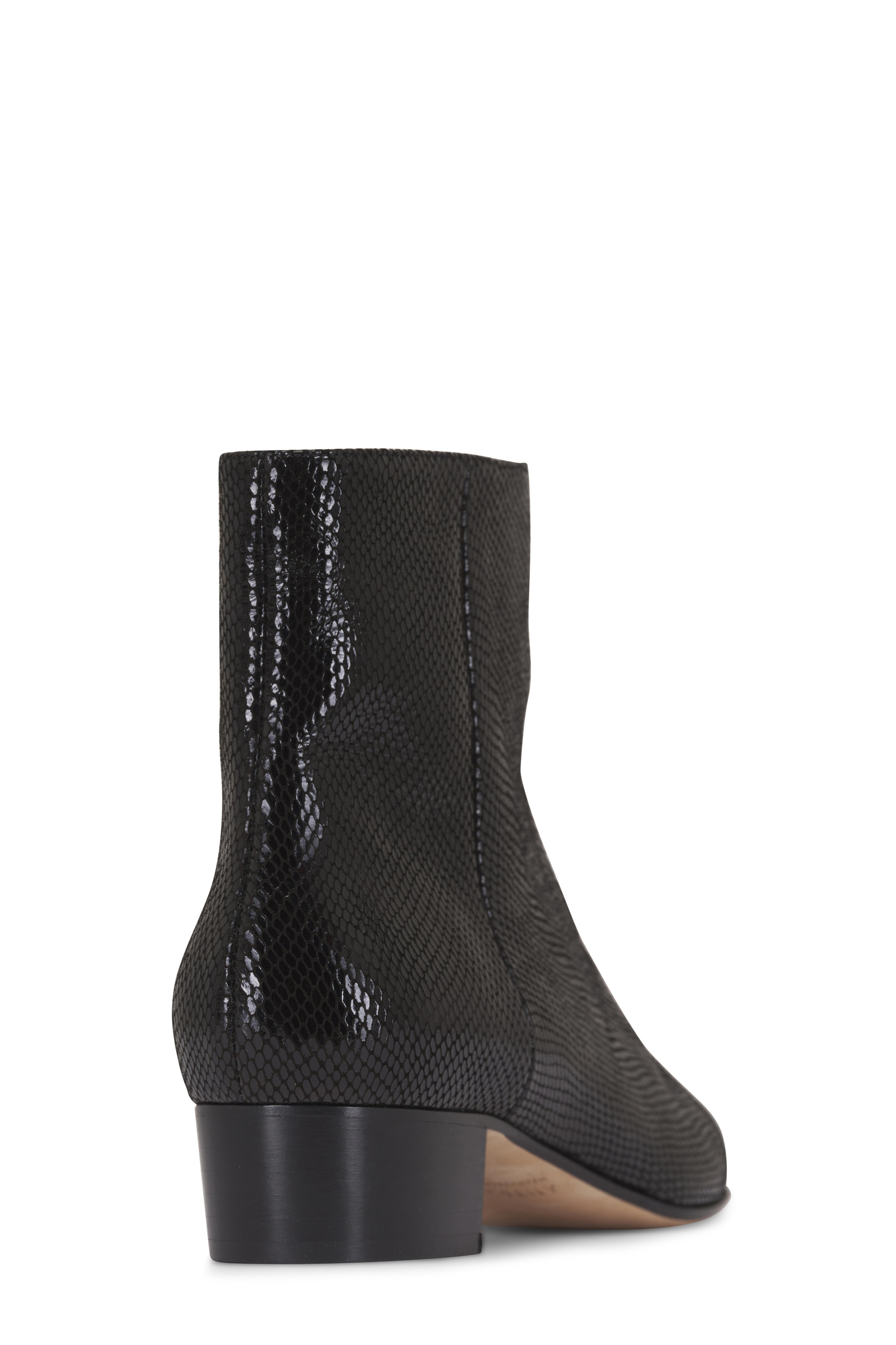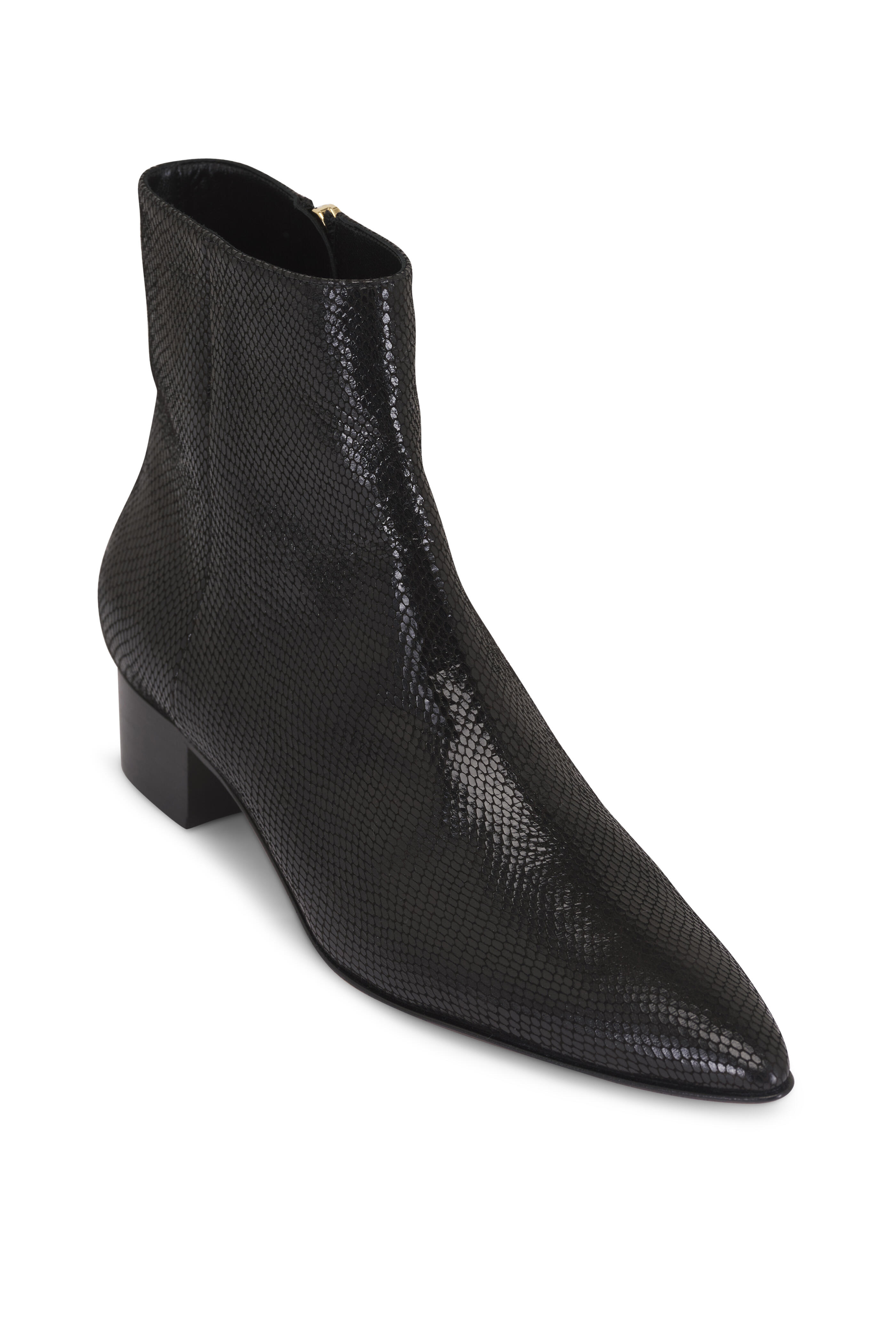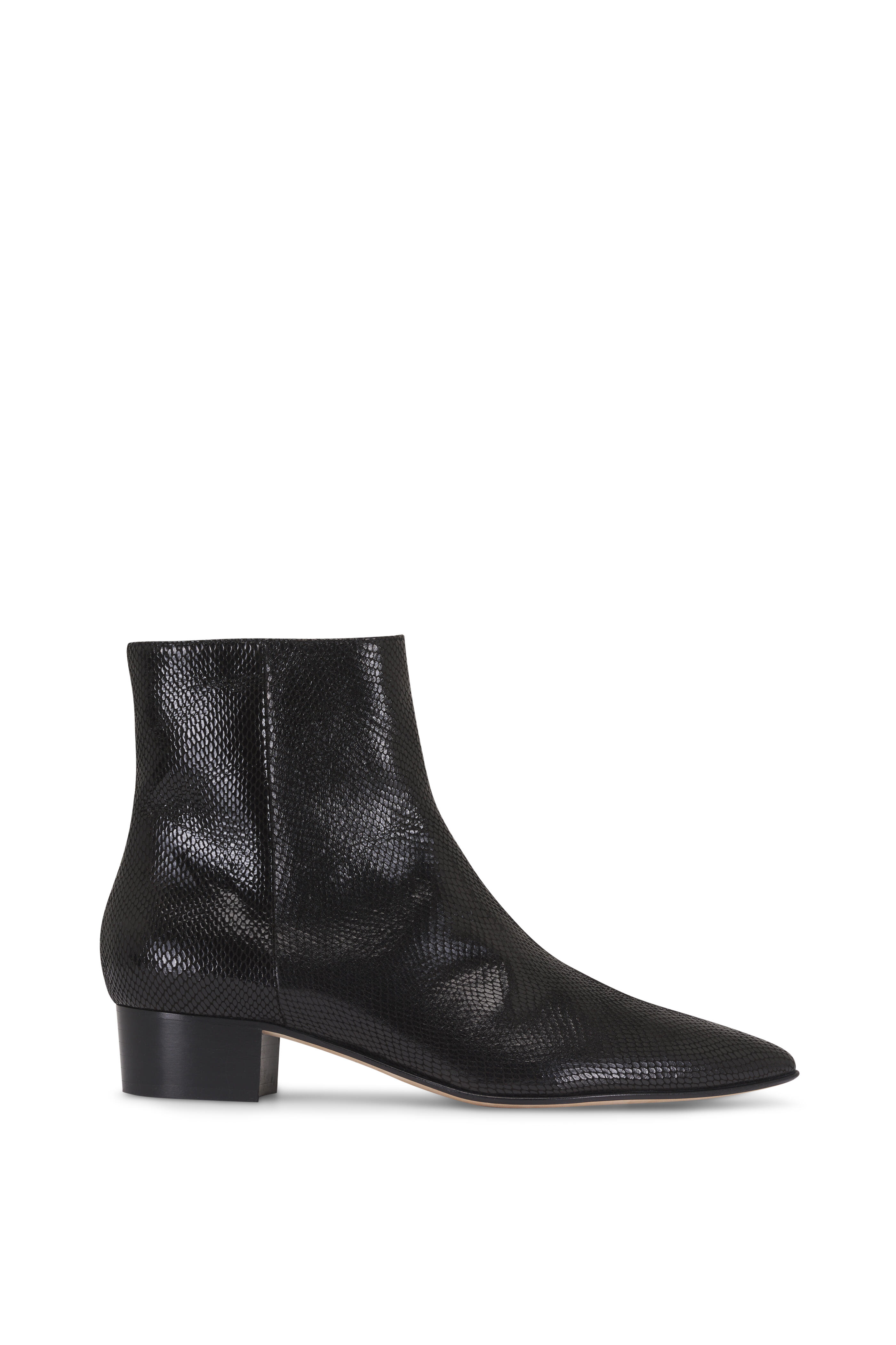 Snake-embossed leather upper. Pointed toe. Side zip closure. Leather lining and sole. Stacked heel. Leather sole. Handmade in Italy. Heel measurement: 30mm.