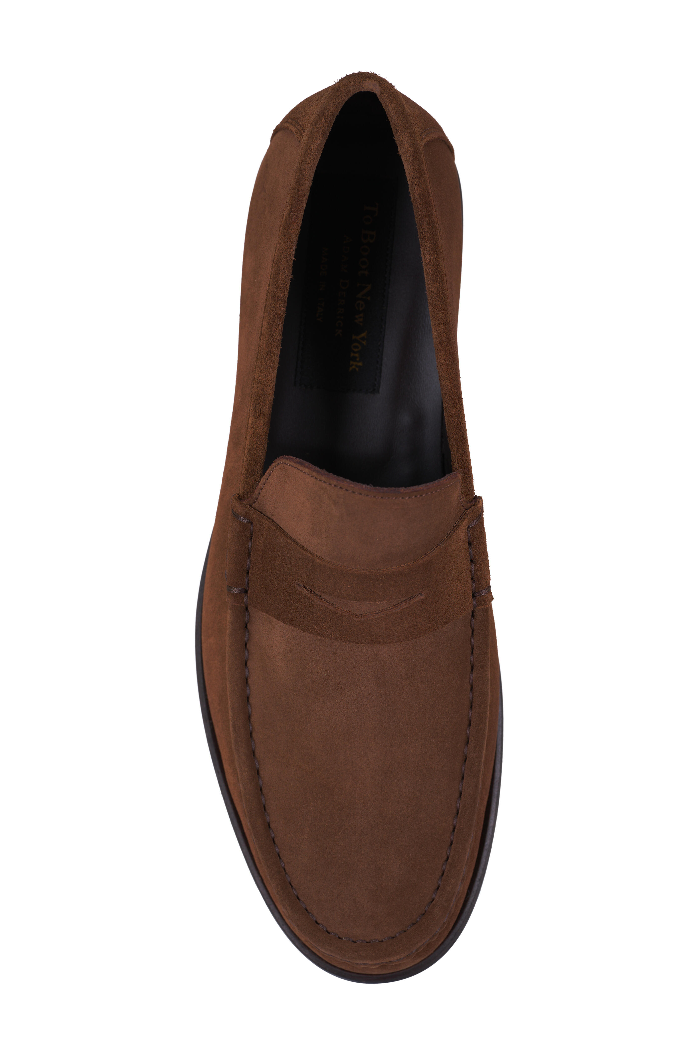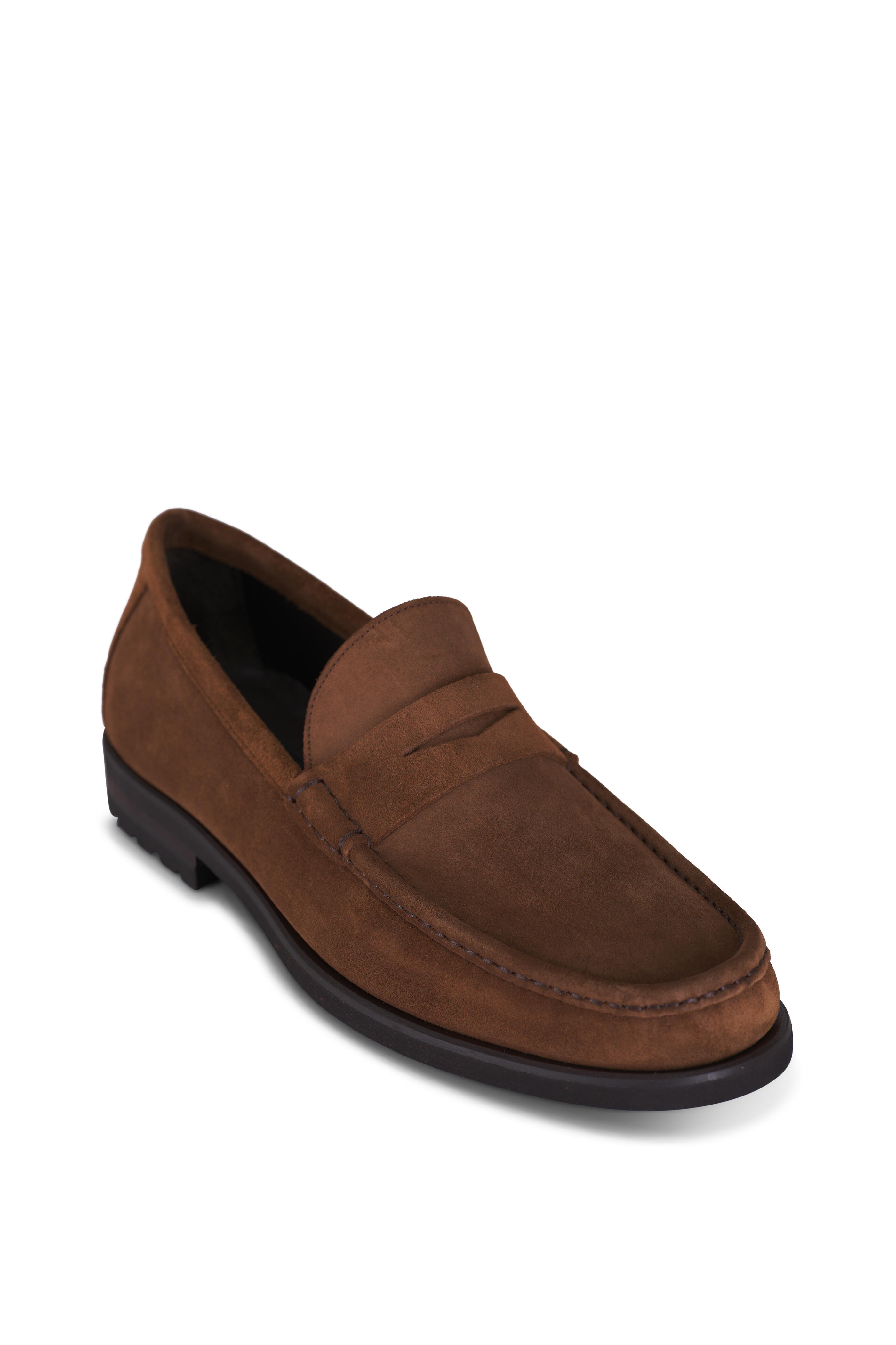 Suede upper. Apron toe. Penny strap at vamp. Slip on style. Leather lining and insole. Rubber sole. Made in Italy.