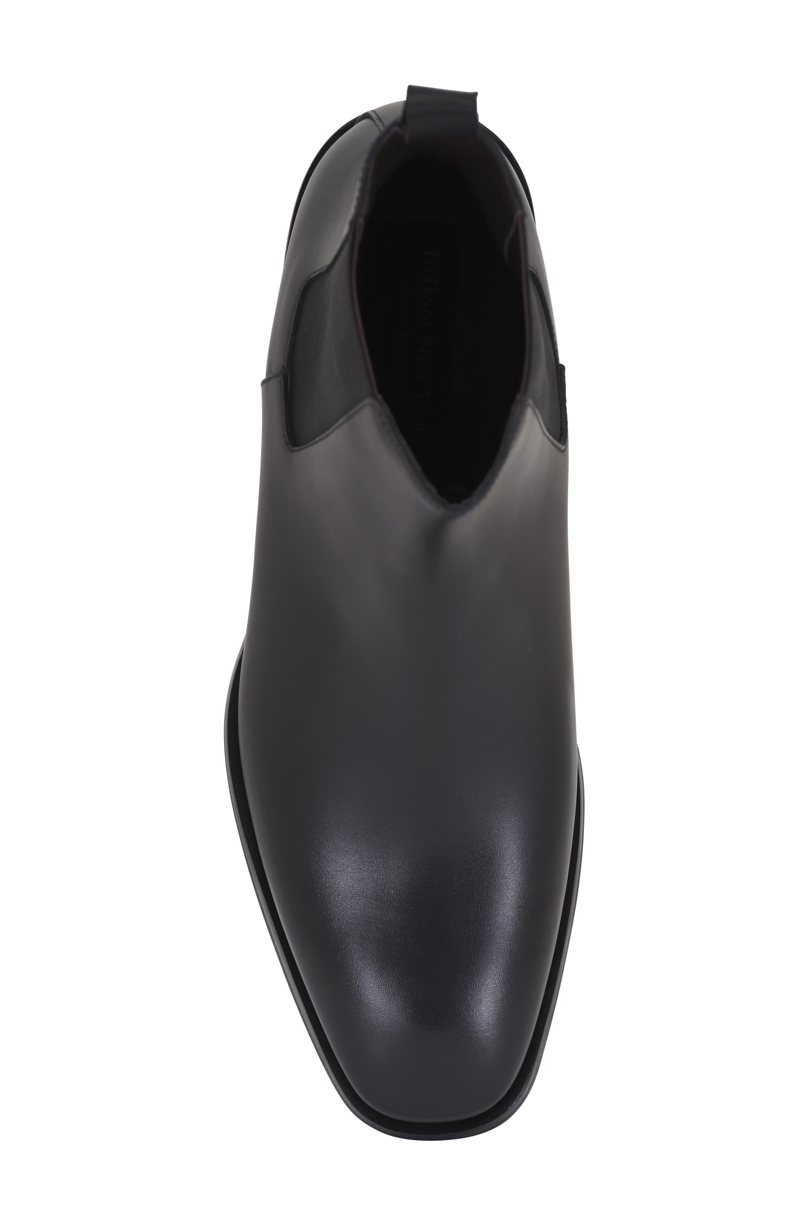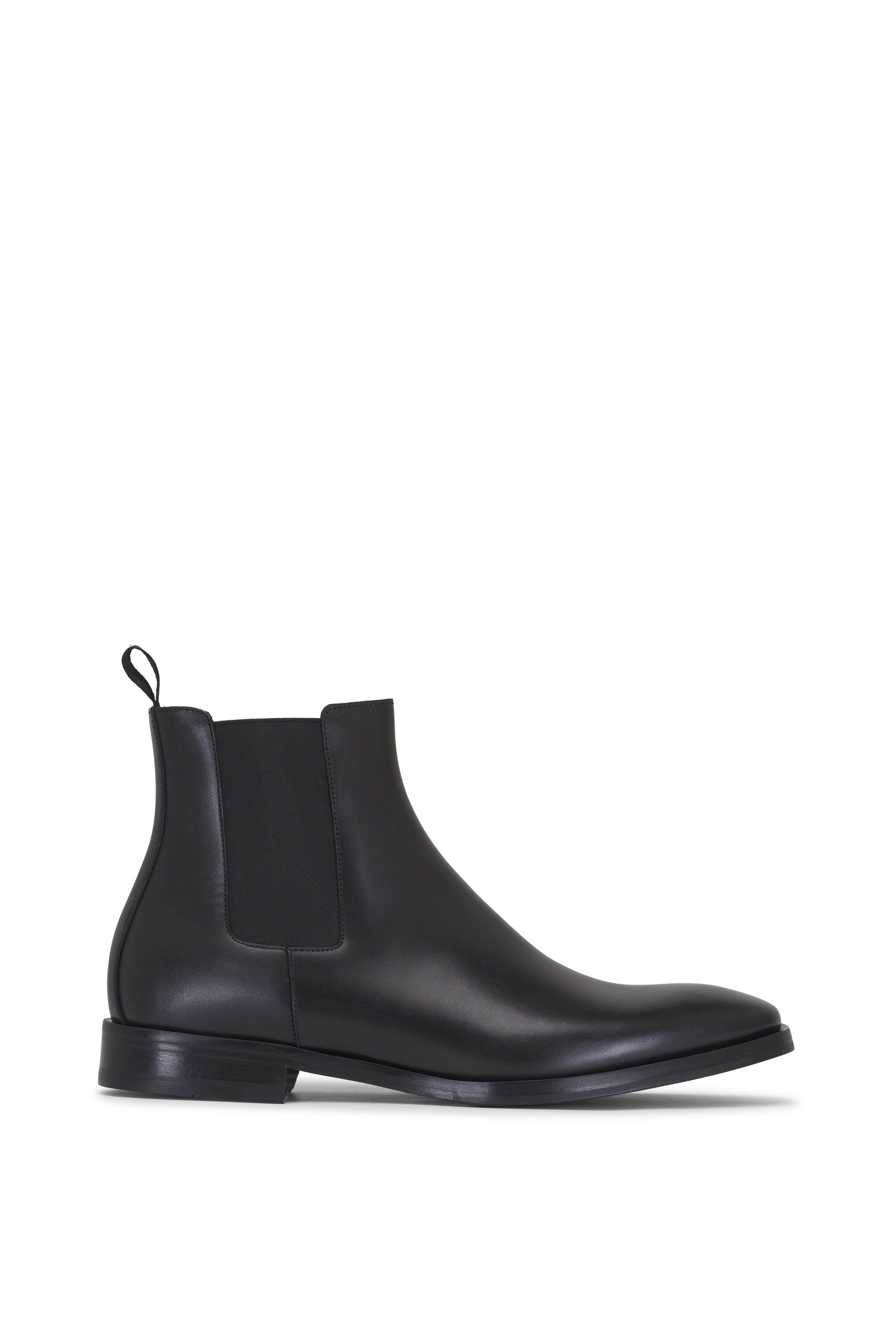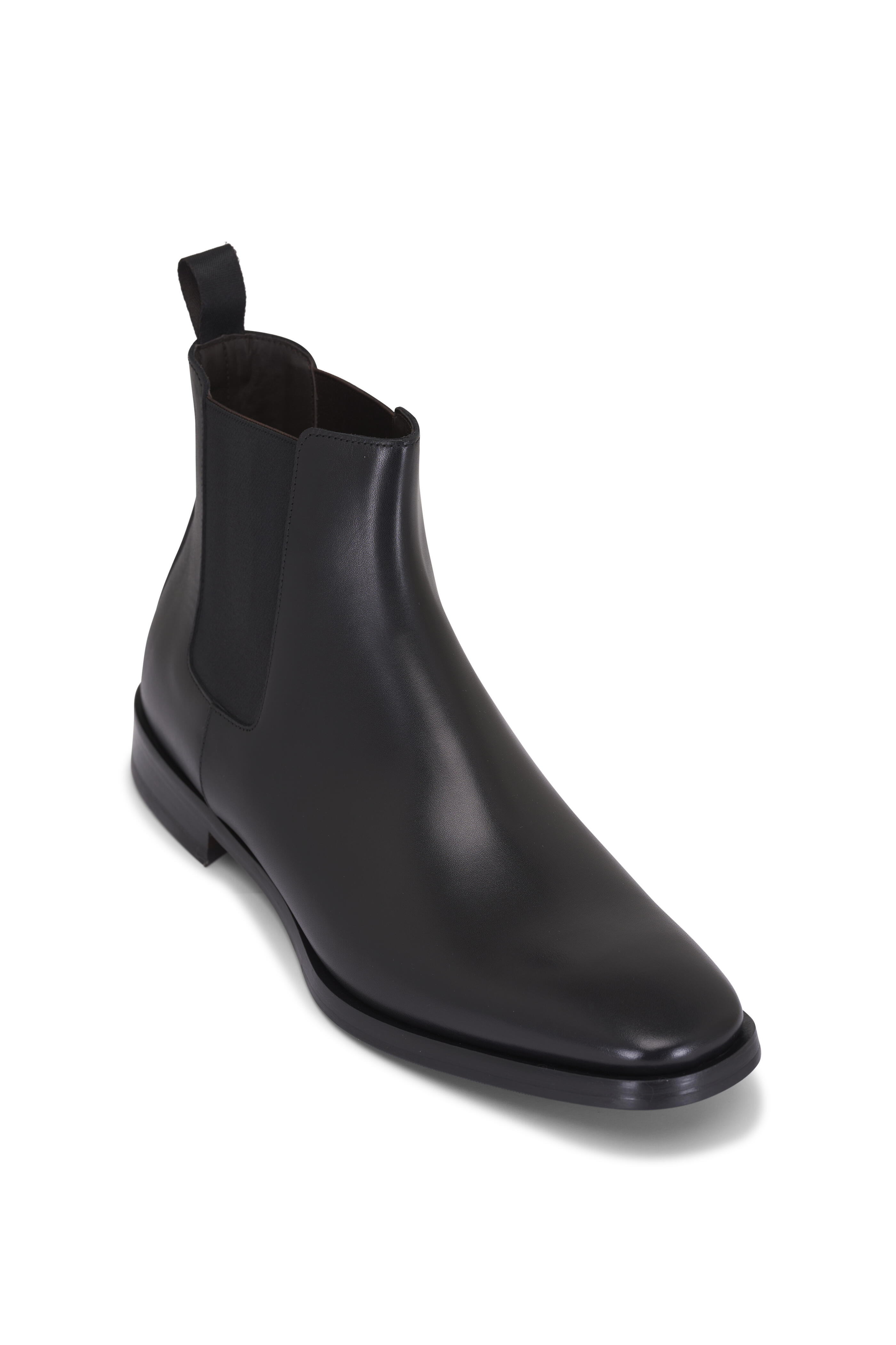 Leather upper. Slip-on style. Tapered toe. Back pull tab. Elasticized side gores. Leather lining and insole. Stack heel. Rubber sole. Made in Italy.