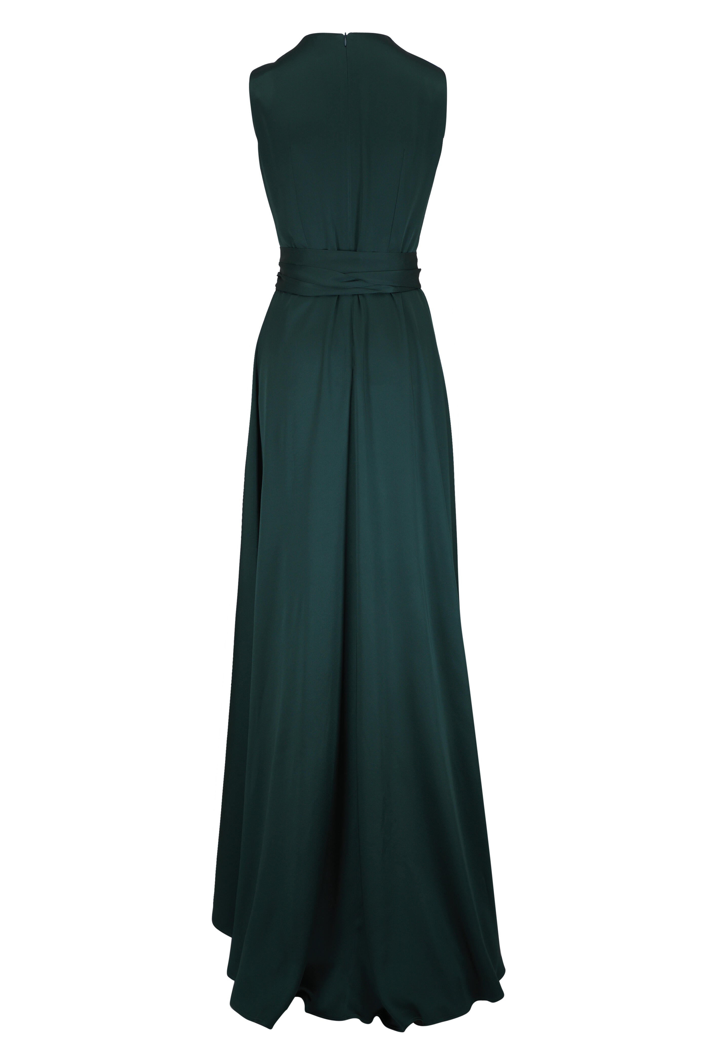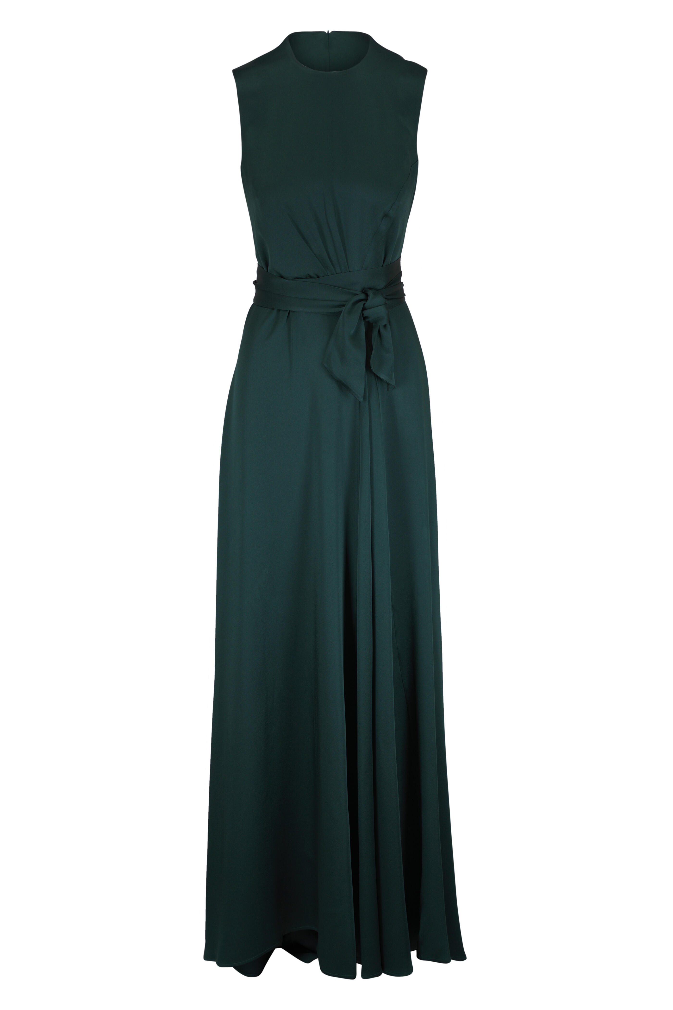 Crew neckline. Concealed back zip. Front deep pleat. Sleeveless. Straight hem. Made in Italy. Shoulder to hem 67" (size 4). 73% acetate, 27% viscose. Dry clean.