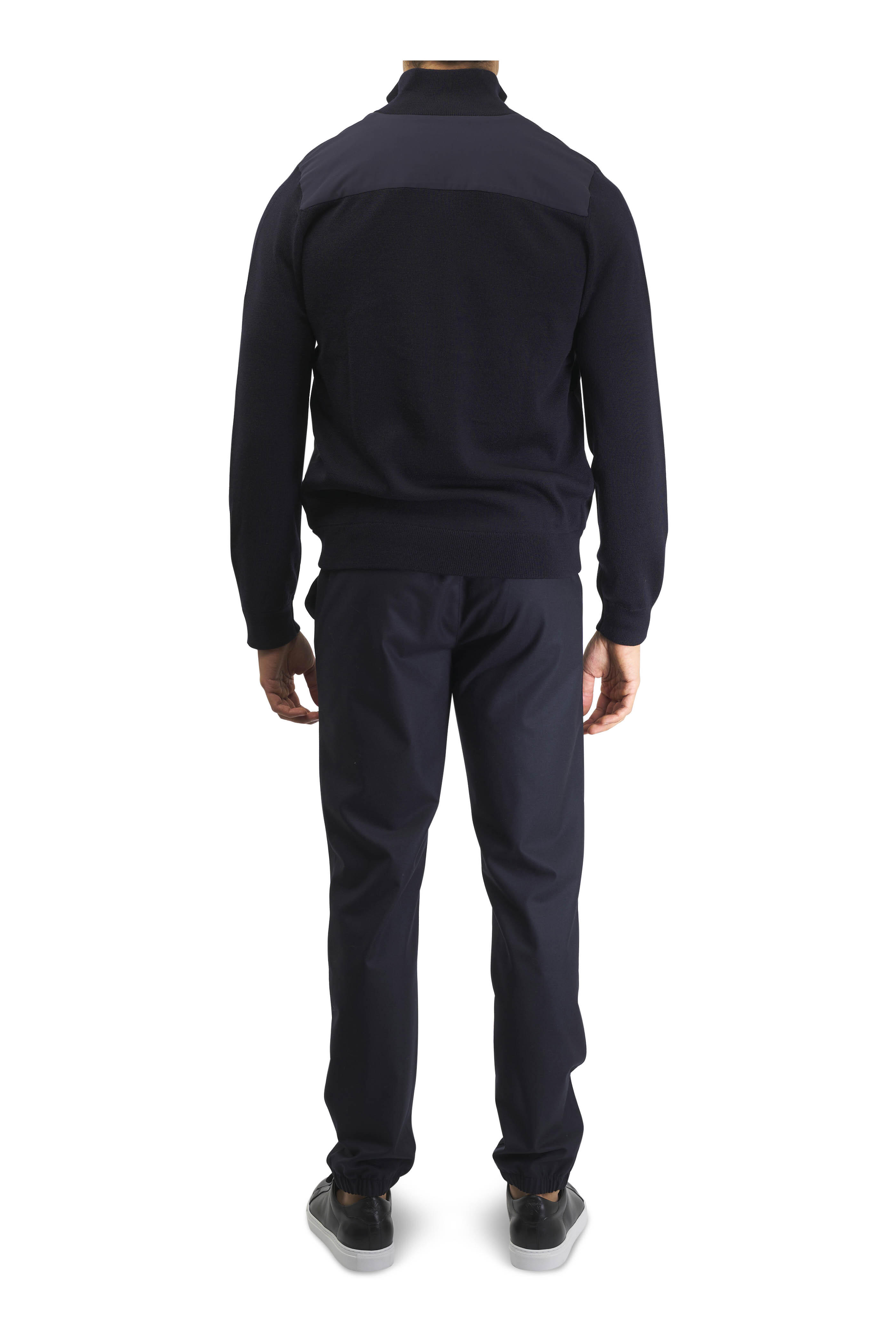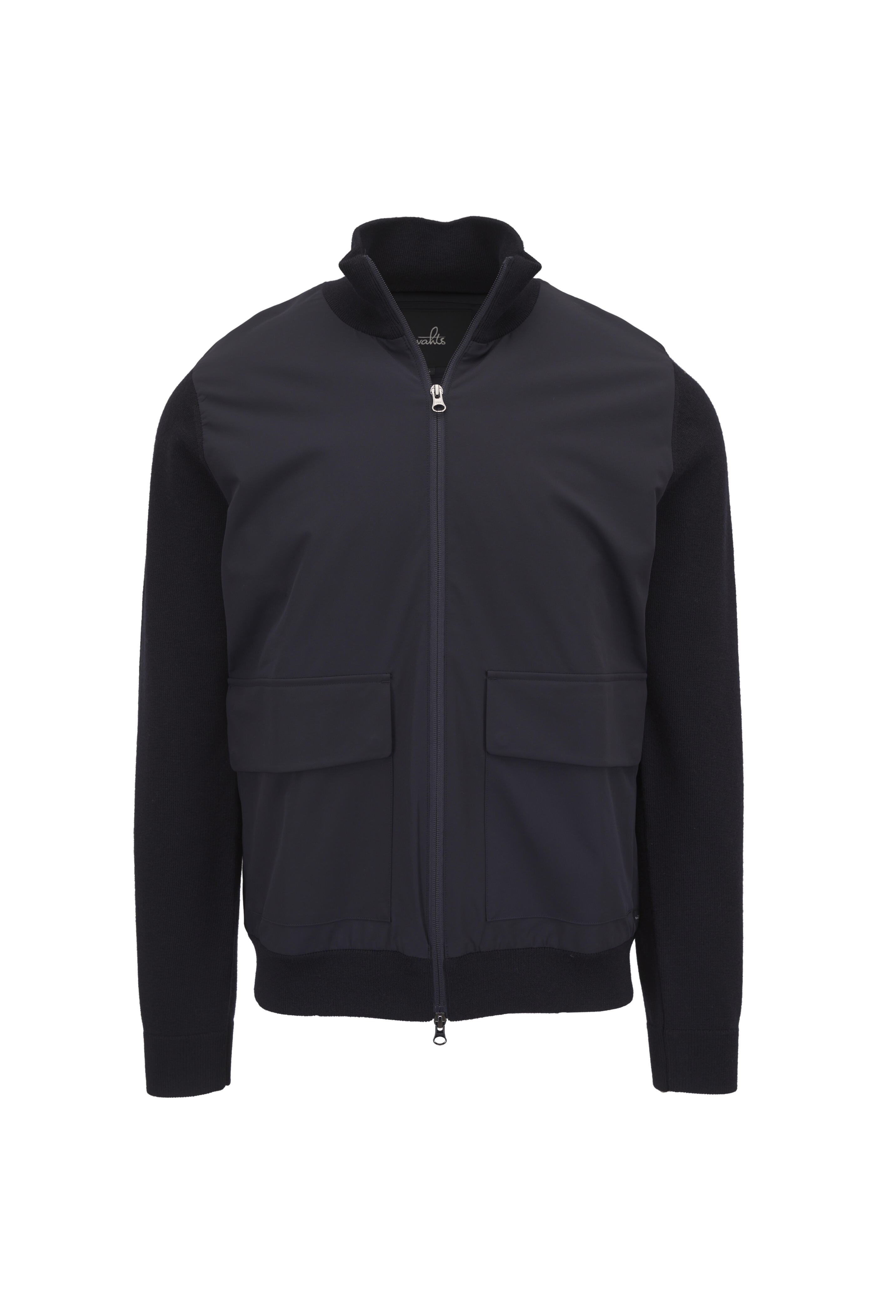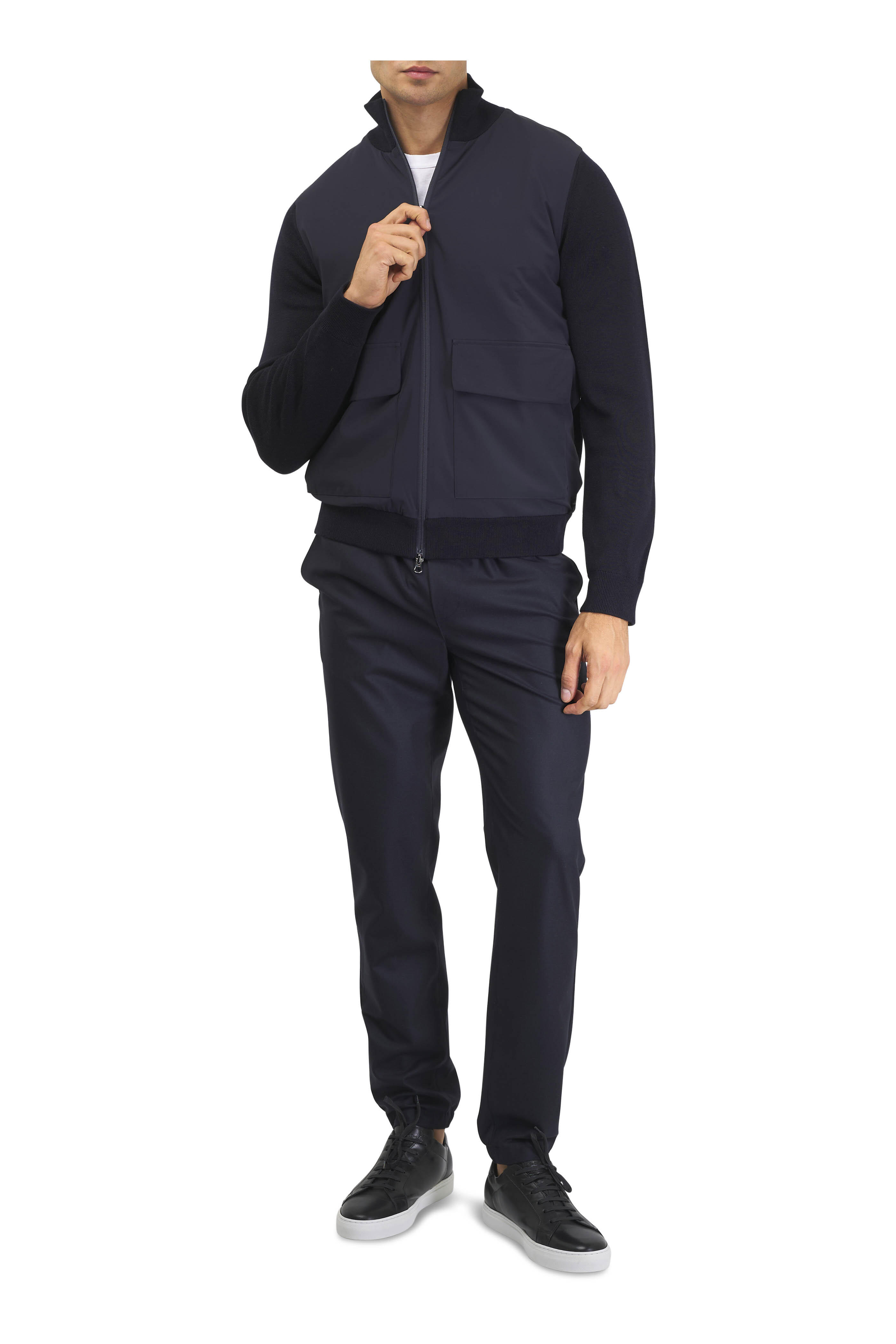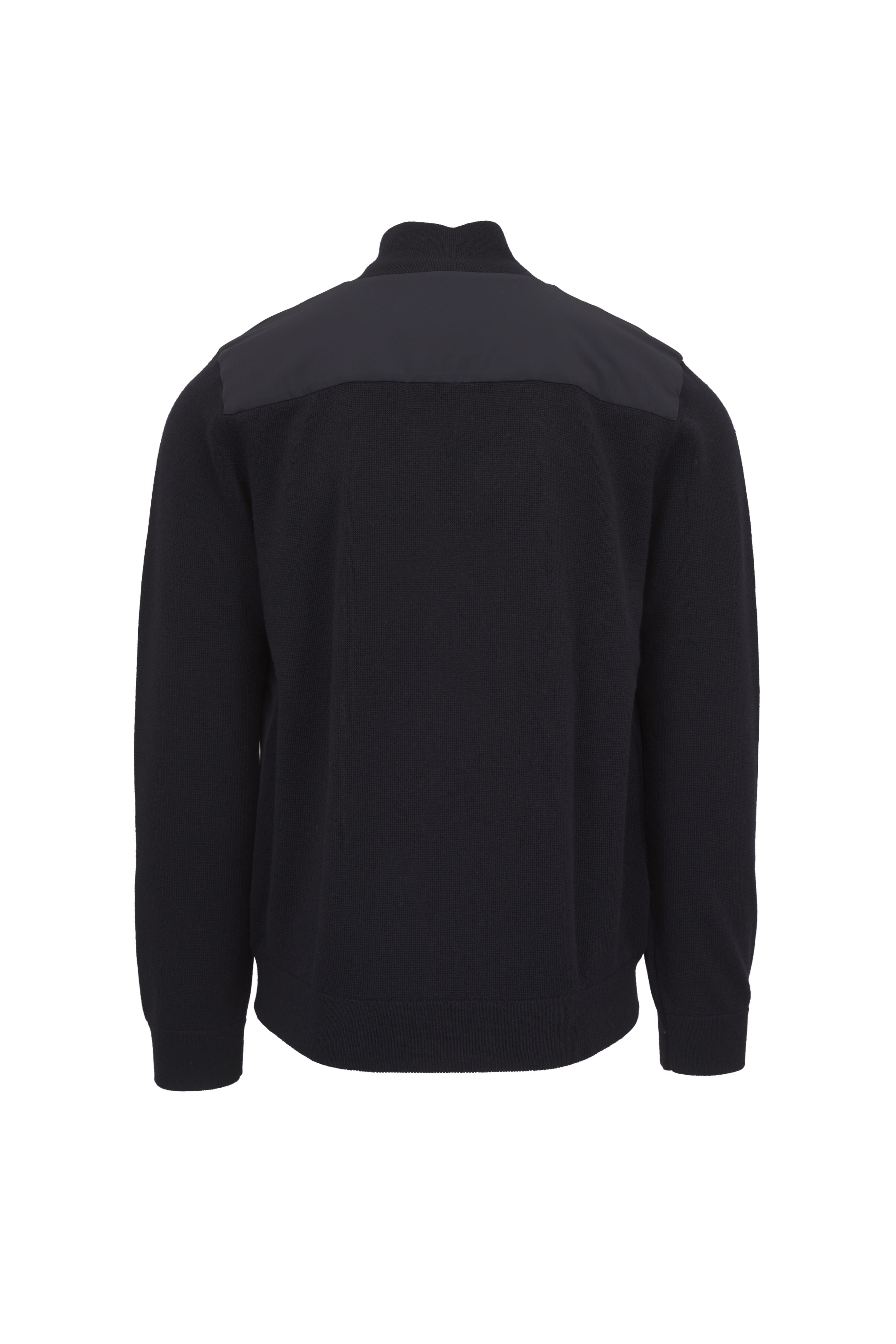 Stand collar. Two-way front zip. Lower flap pockets. Ribbed knit trim. Imported. Shoulder to hem 28" (size L). Back panel/sleeves: 100% merino wool; front panel: 83% polyamide, 17% elastane; fill: 100% polyester. Machine wash.