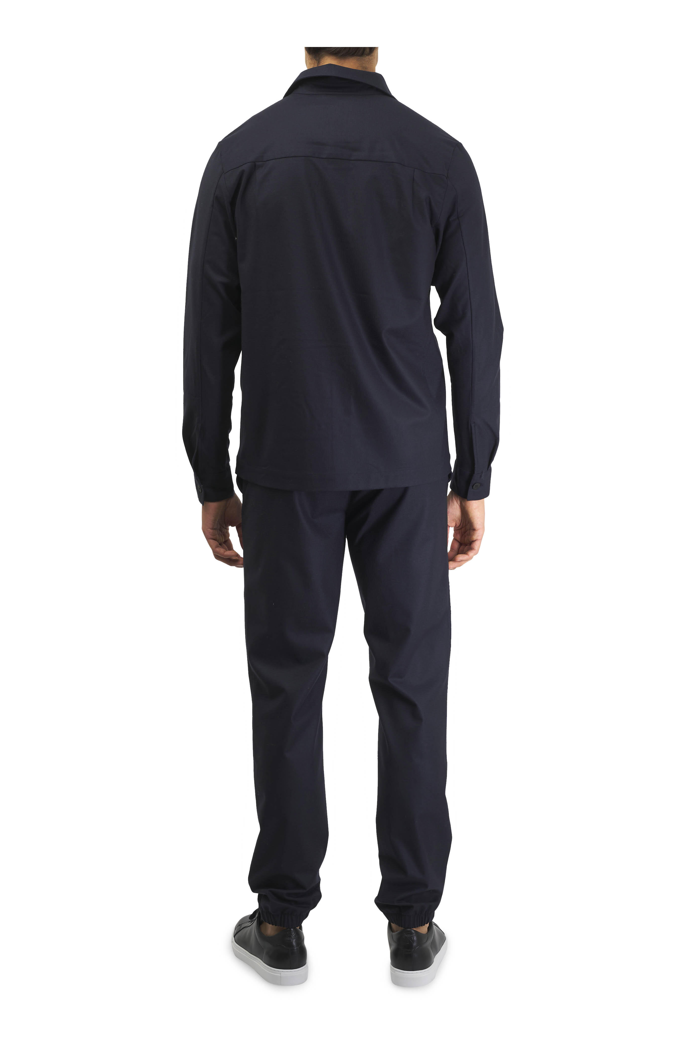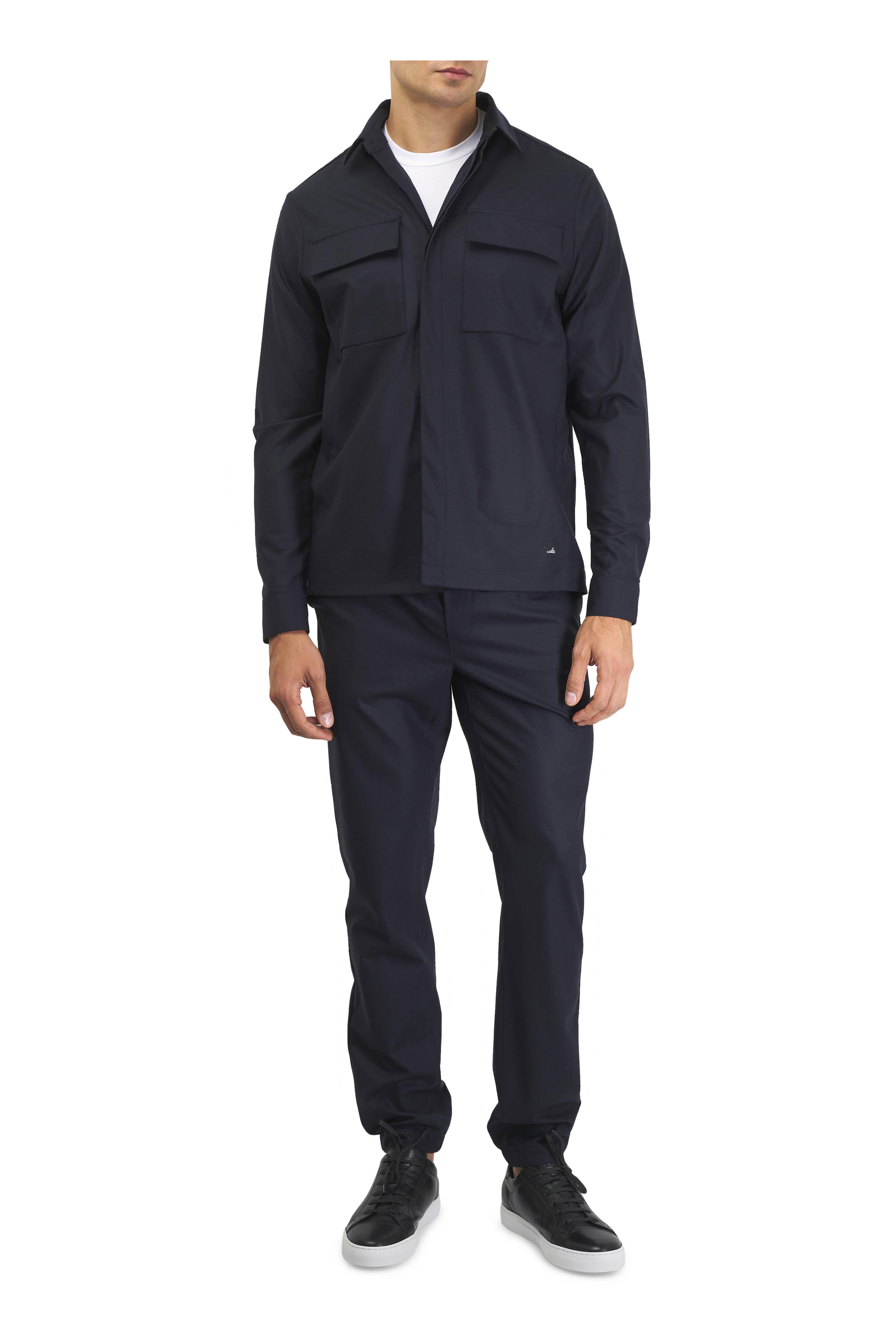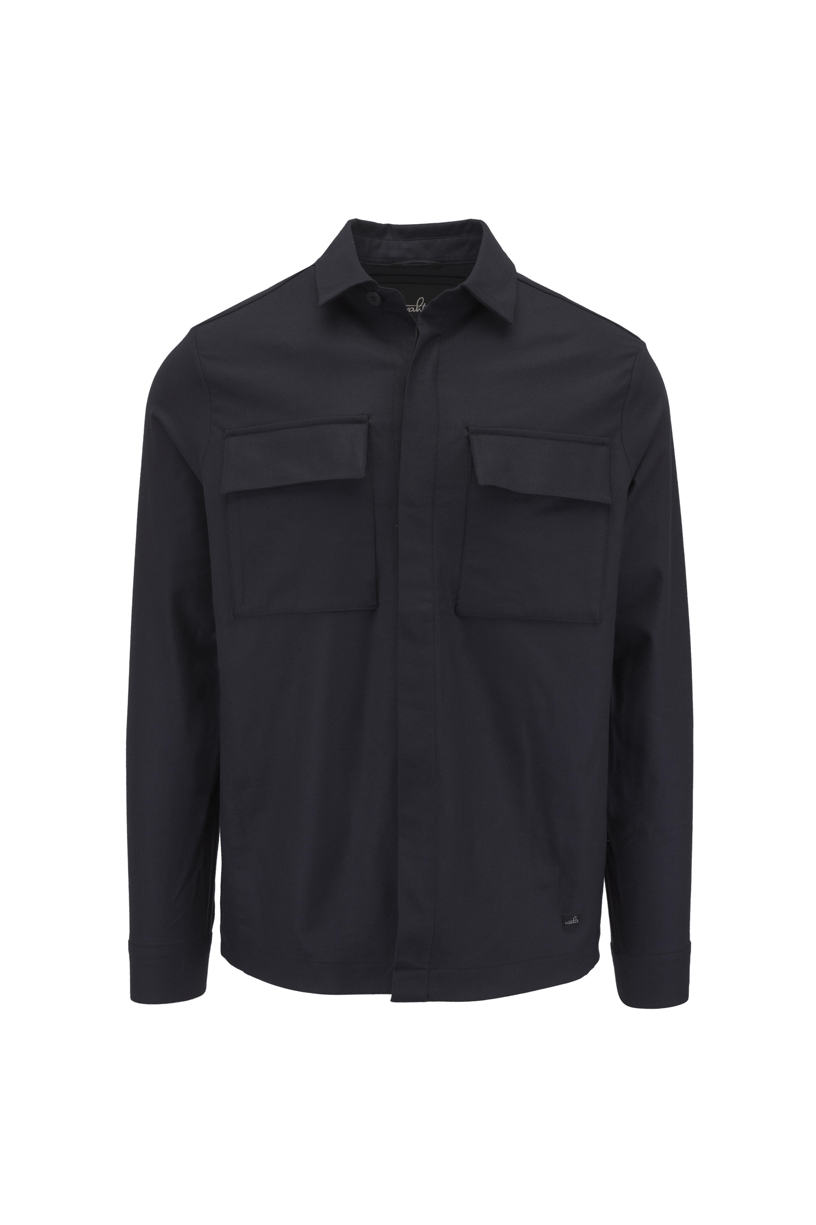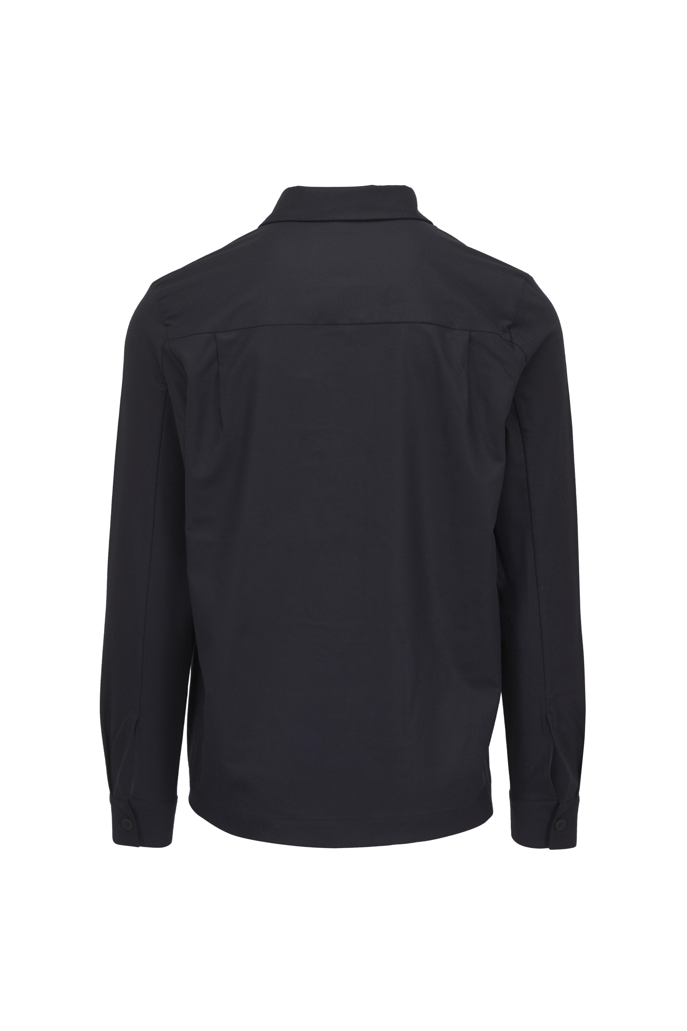 Spread collar. Concealed front button placket. Chest flap patch pockets with concealed button closure. Single button cuffs. Made in Portugal. Approximately 29 ½" shoulder to hem (measurements taken from size L). 95% virgin wool, 5% elastane. Machine wash.