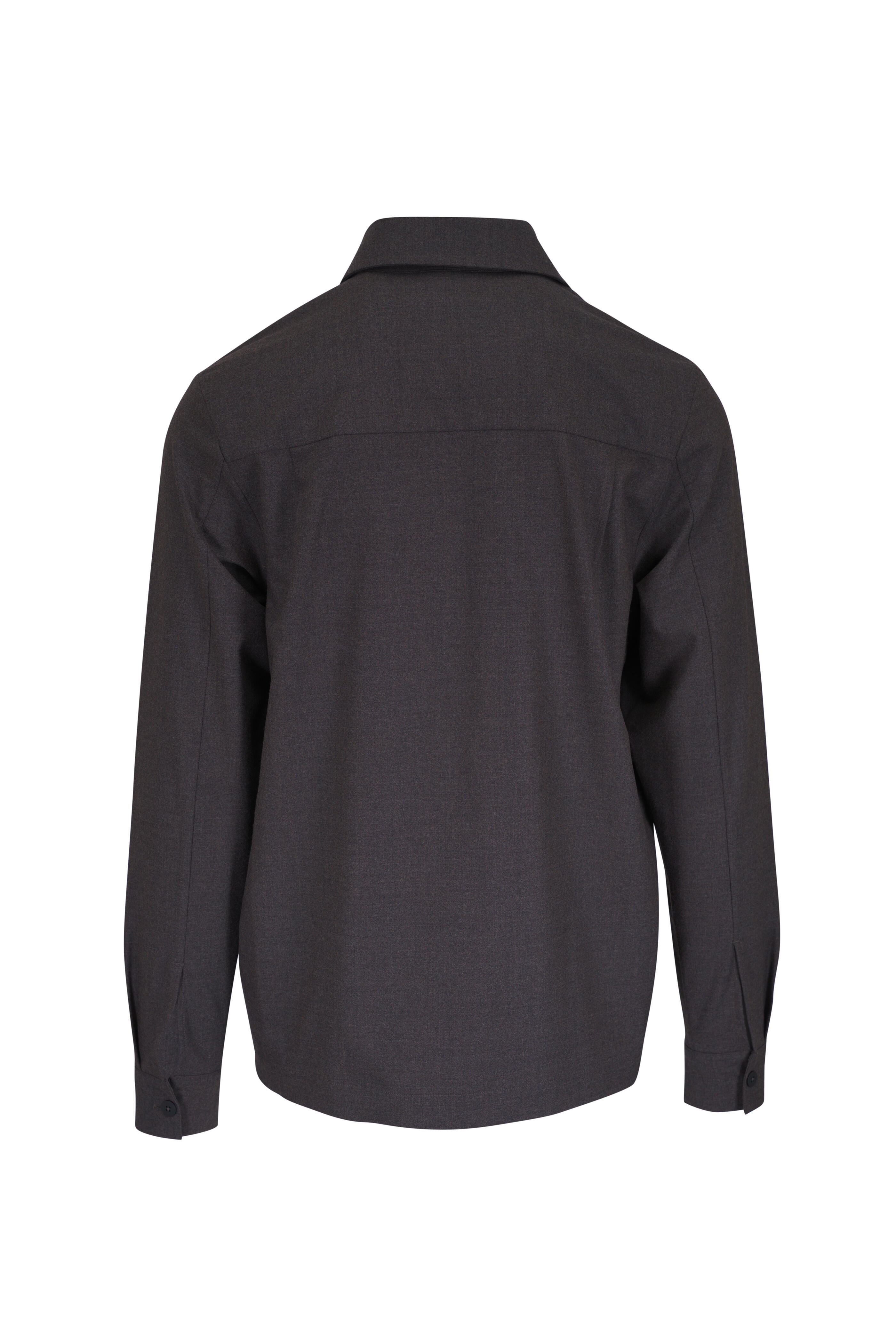 Spread collar. Concealed front button placket. Chest flap patch pockets with concealed button closure. Single button cuffs. Made in Portugal. Approximately 29 ½" shoulder to hem (measurements taken from size L). 95% virgin wool, 5% elastane. Machine wash.