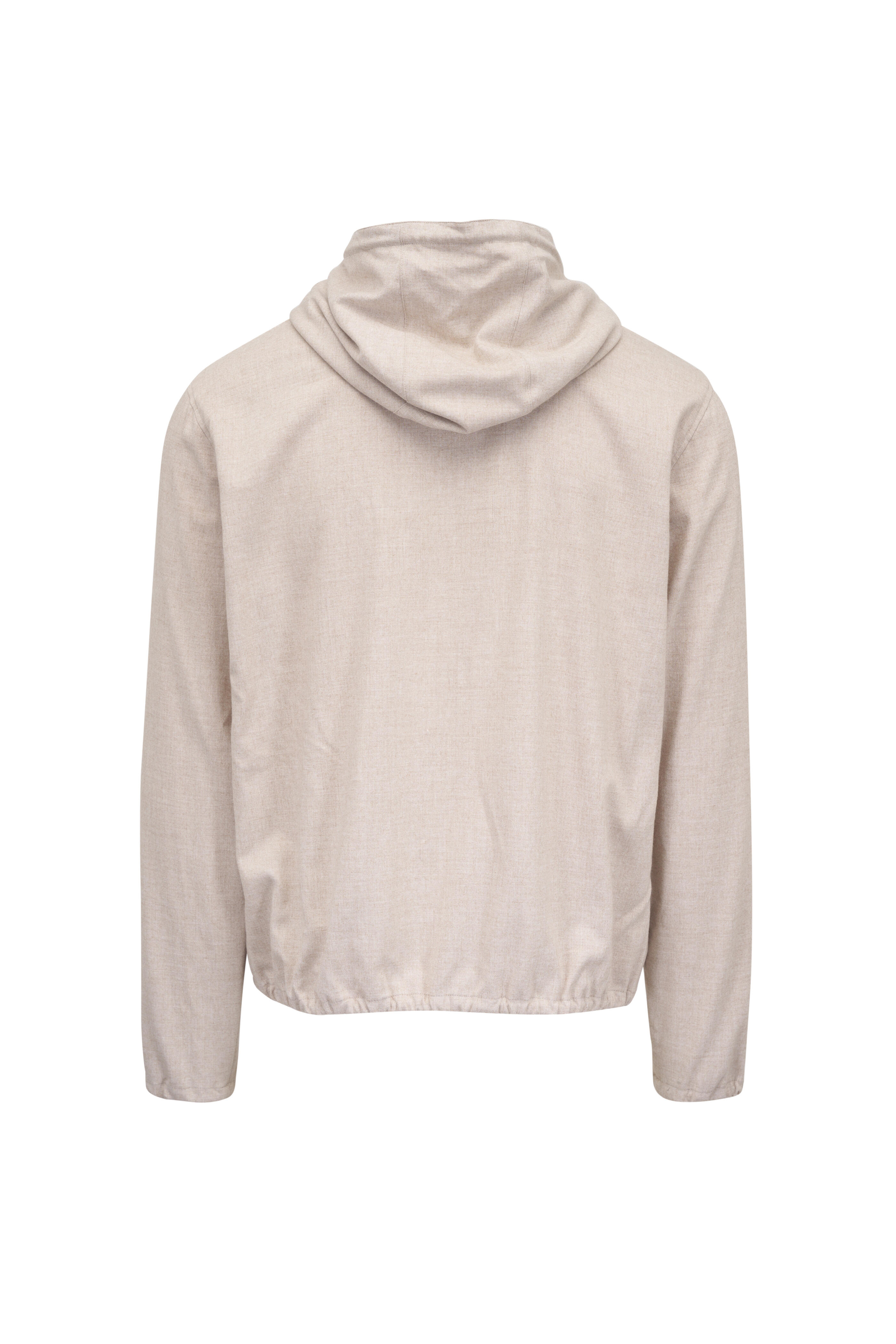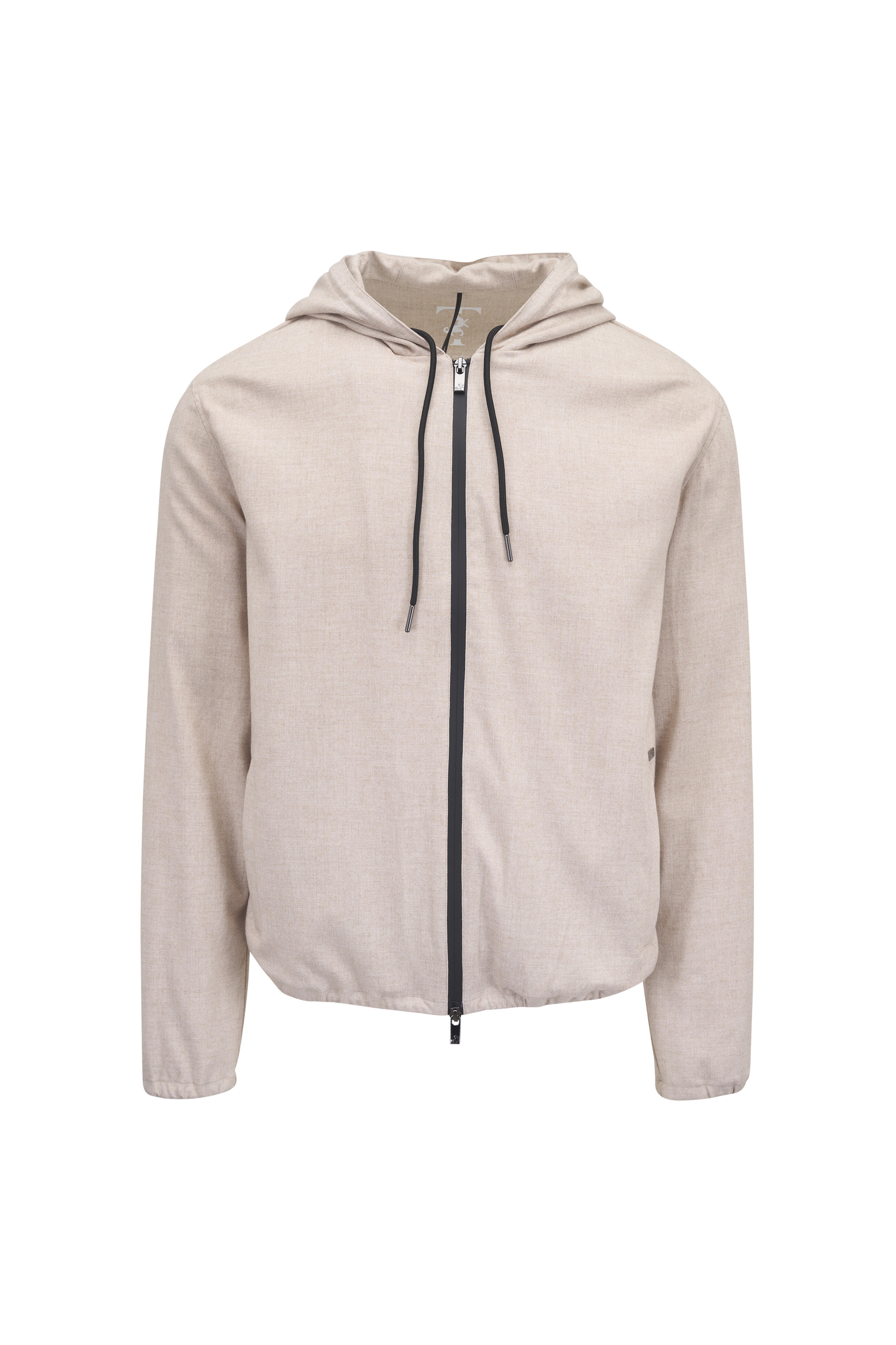 Attached, drawstring hood. Two-way front zip. Side slip pockets. Elasticized trim. Made in Italy. 82% viscose, 15% nylon, 3% elastane. Dry clean.