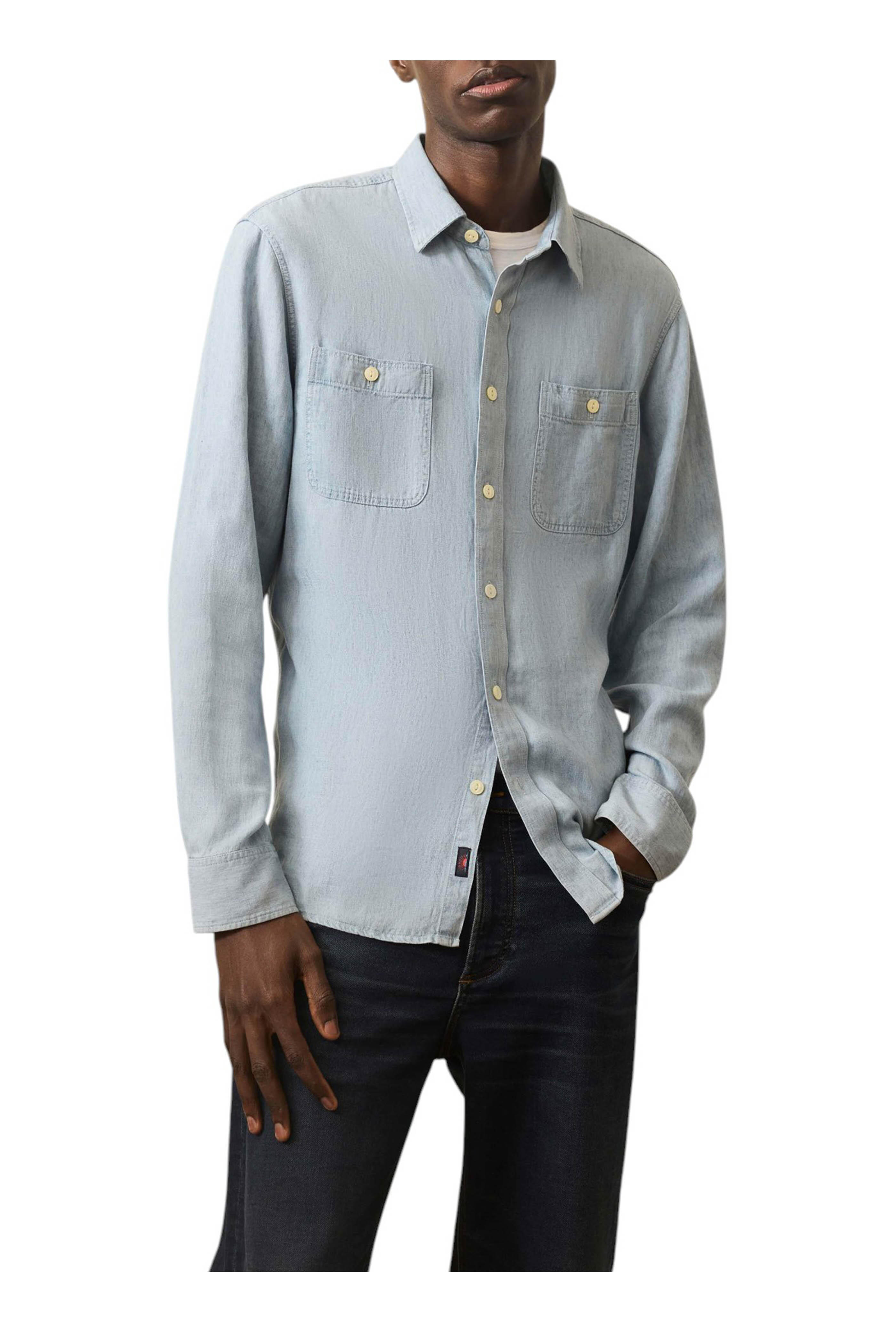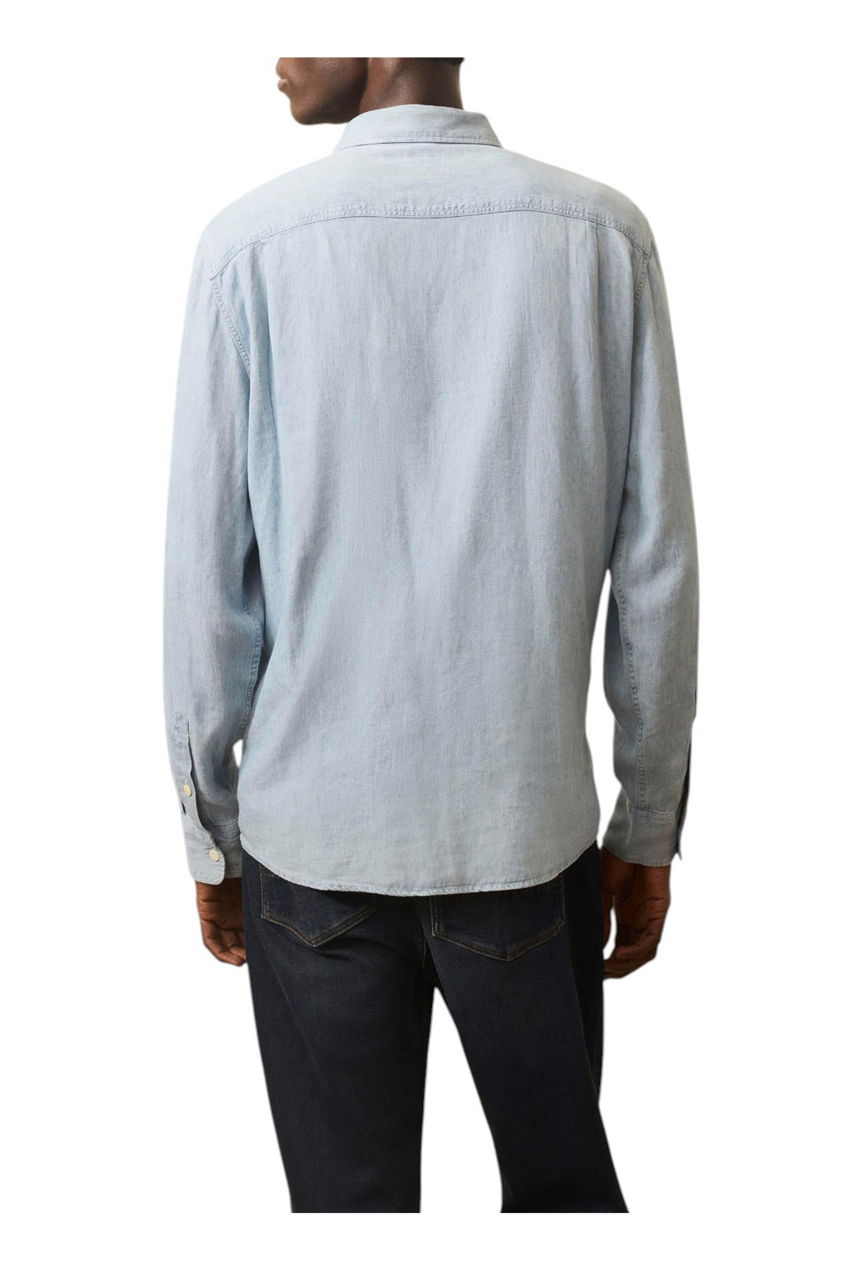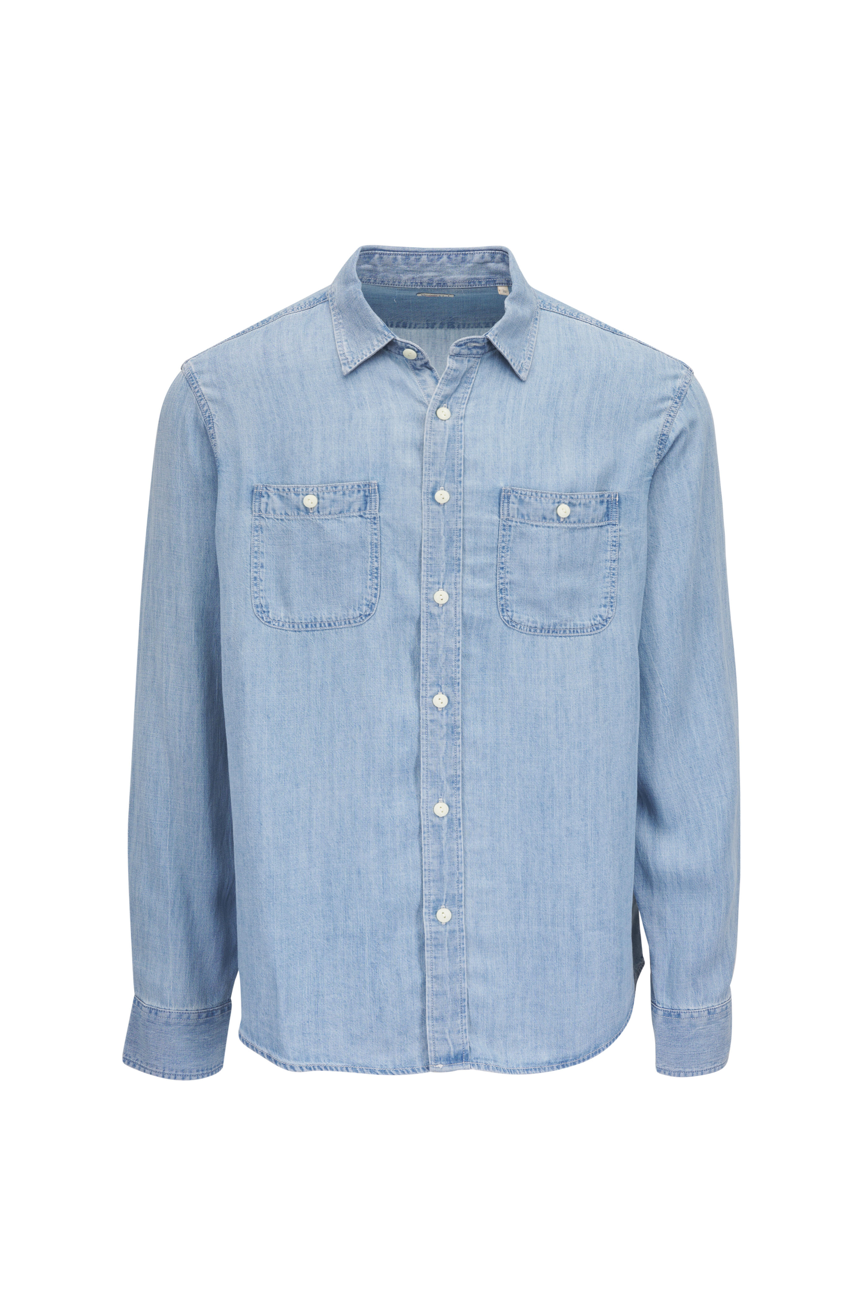 Spread collar. Front button placket. Buttoned chest patch pockets. Double pleated back. Shirttail hem. Woven "Sun & Wave" label at under placket. Imported. 70% TENCEL™ lyocell, 30% linen. Machine wash.