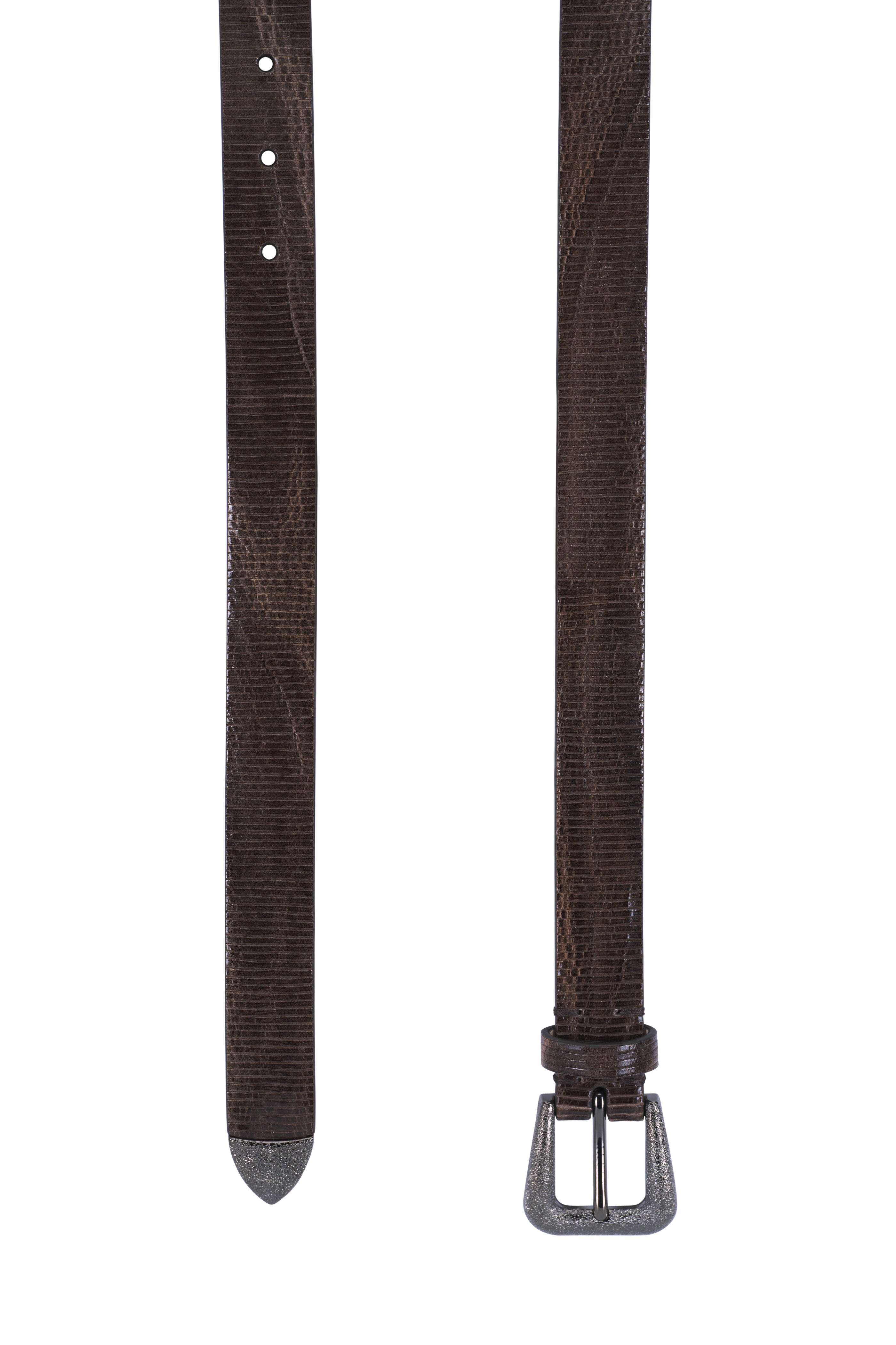 Leather. Rounded square buckle. Single loop keeper. Tapered metal tip. Made in Italy. Width: 25mm.