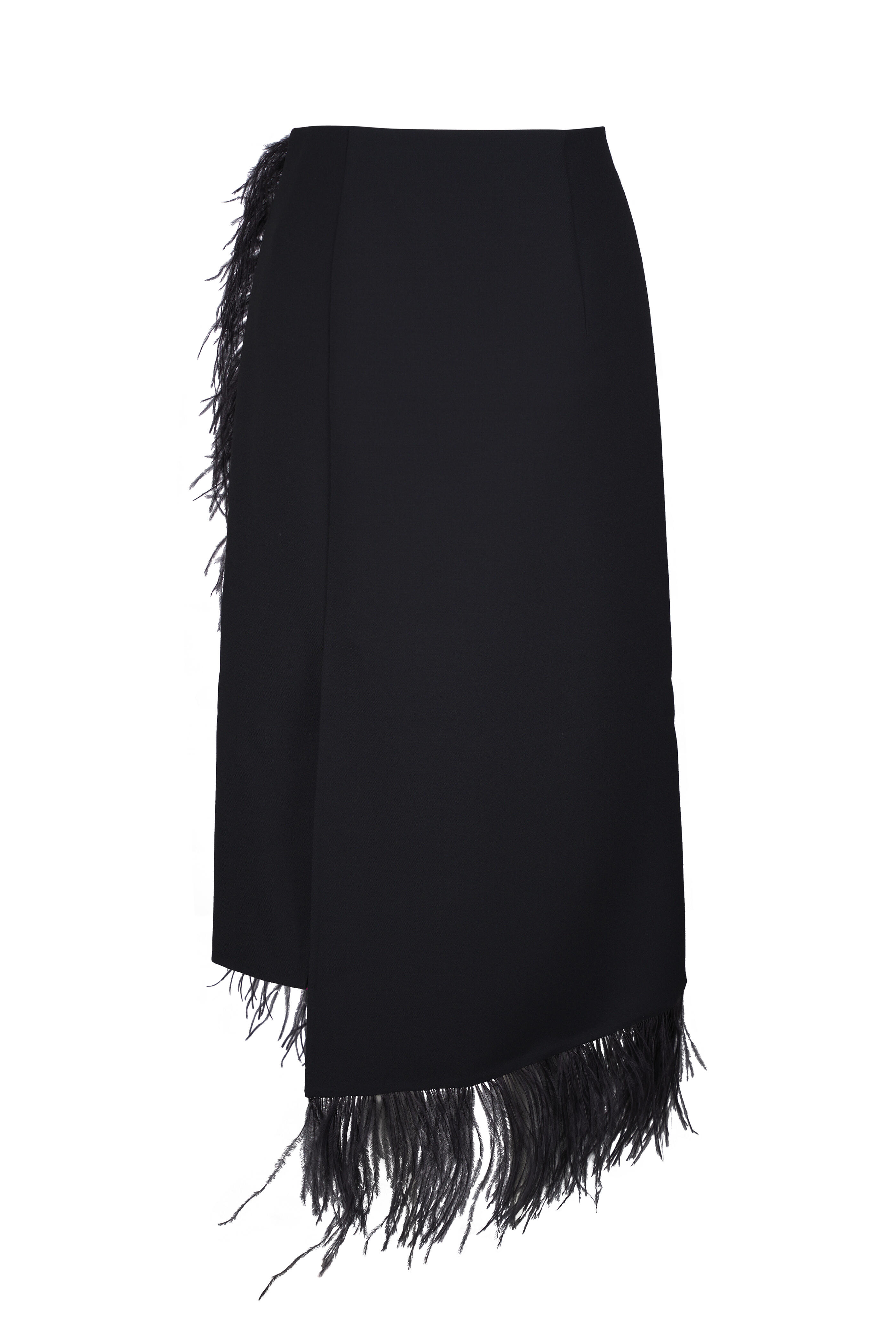 Concealed side zip. Faux wrap detail. Fabric from Italy. About 30" length. 100% virgin wool; lined. Dry clean.