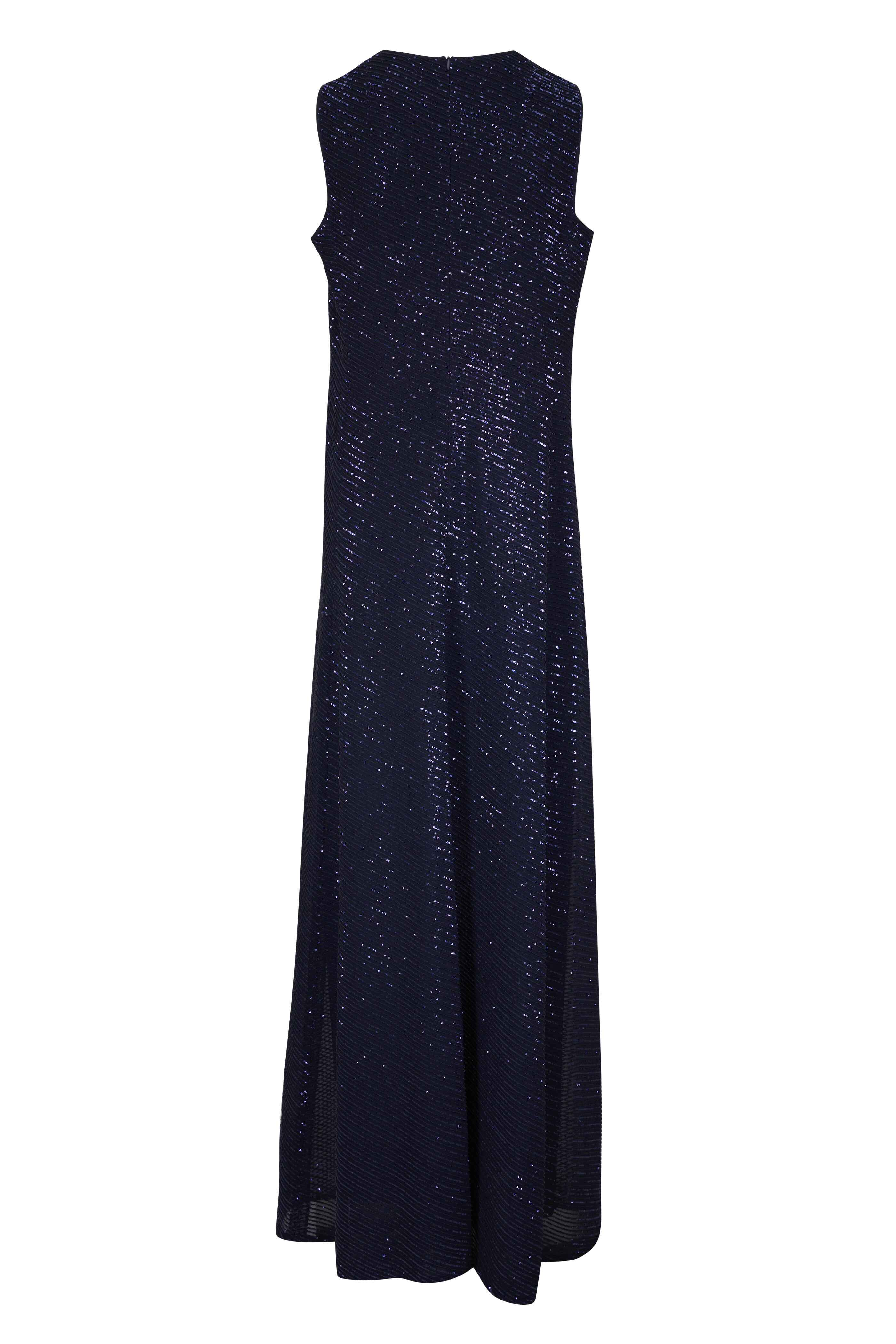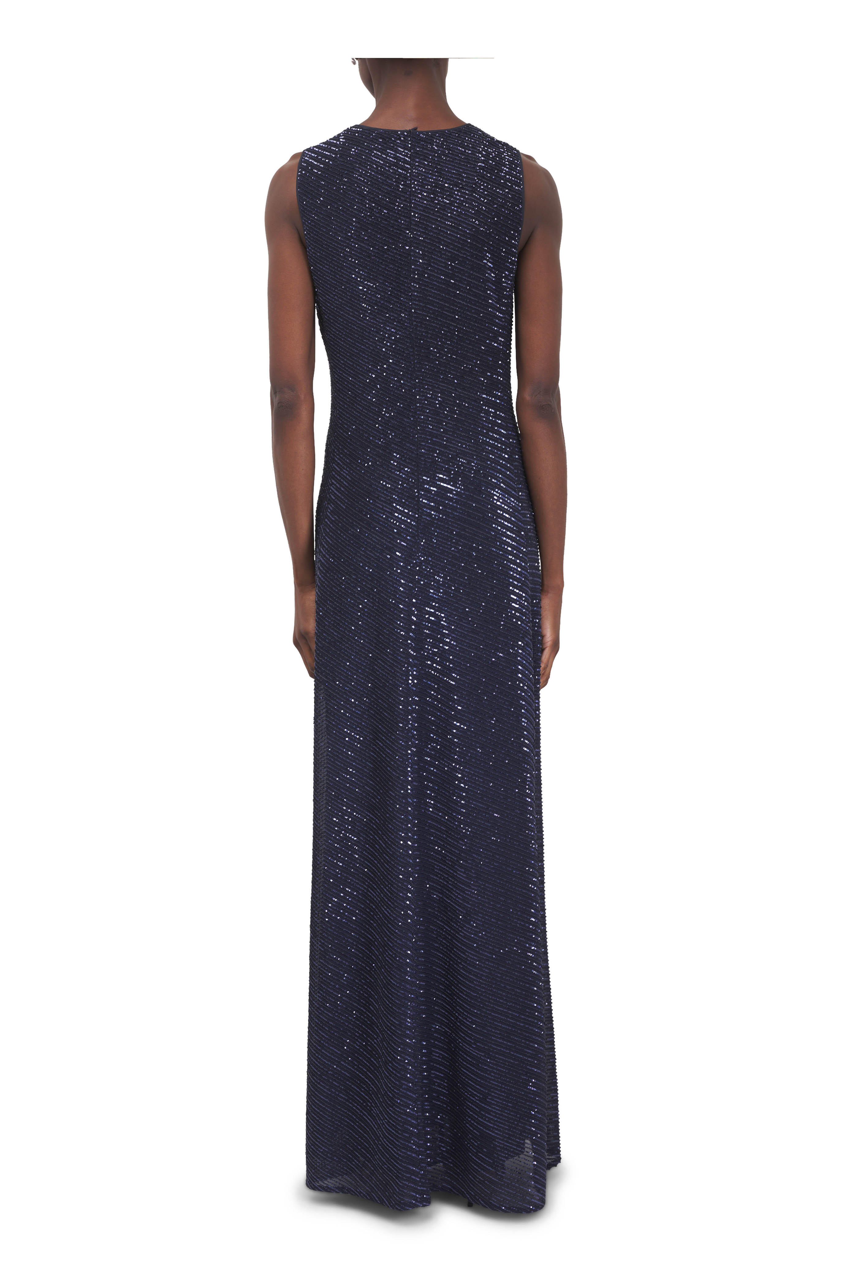 Jewel neckline. Concealed back zip. Front slit. Imported. About 62" shoulder to hem. 100% polyester; lined. Dry clean.