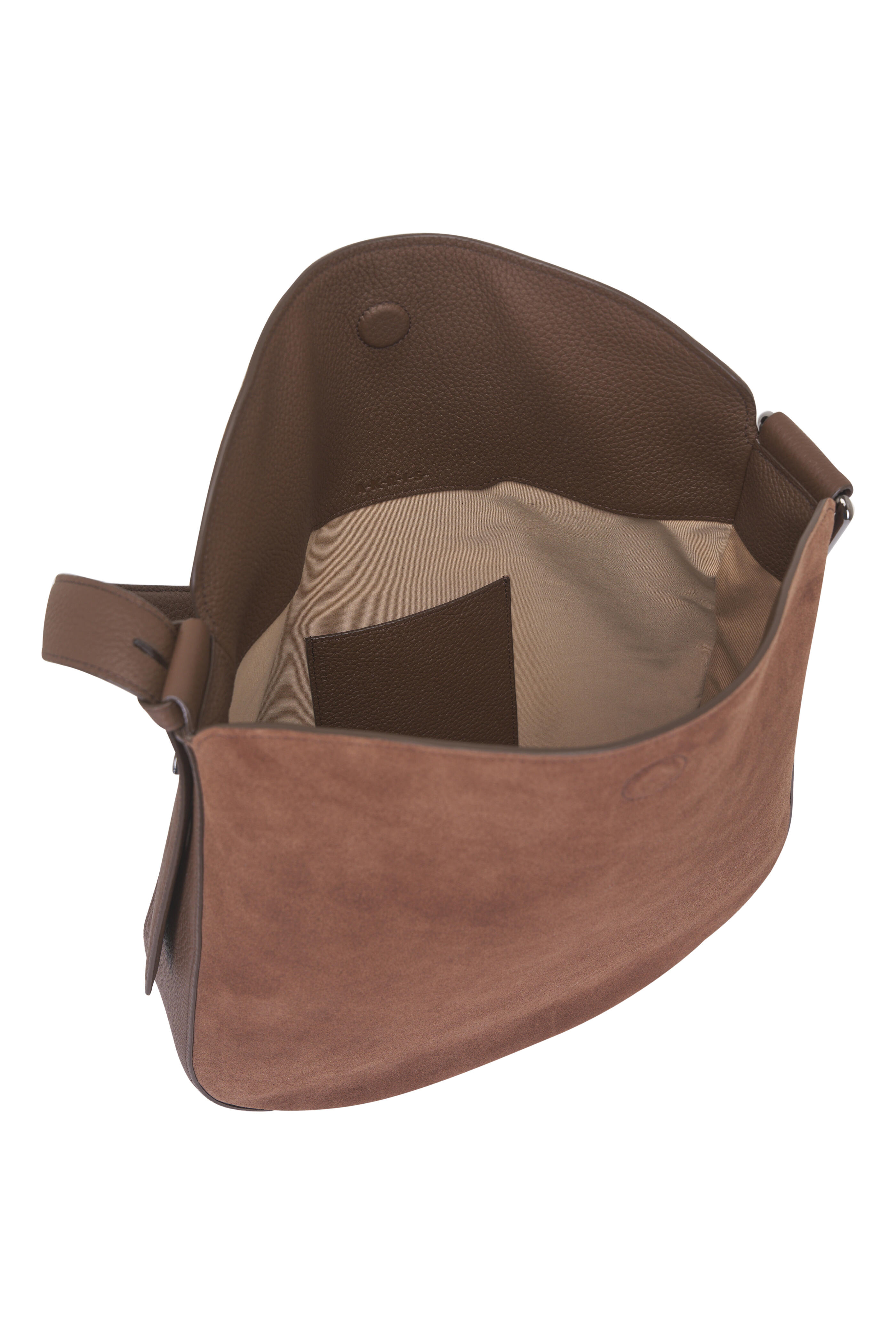 Suede. Adjustable, flat top handle. Magnetic flap top closure. Interior zip and slip pockets. Silver-toned hardware. Grosgrain lining. Made in Italy. Width: 14". Height: 13". Depth: 4". Strap drop: 12-14 ½".