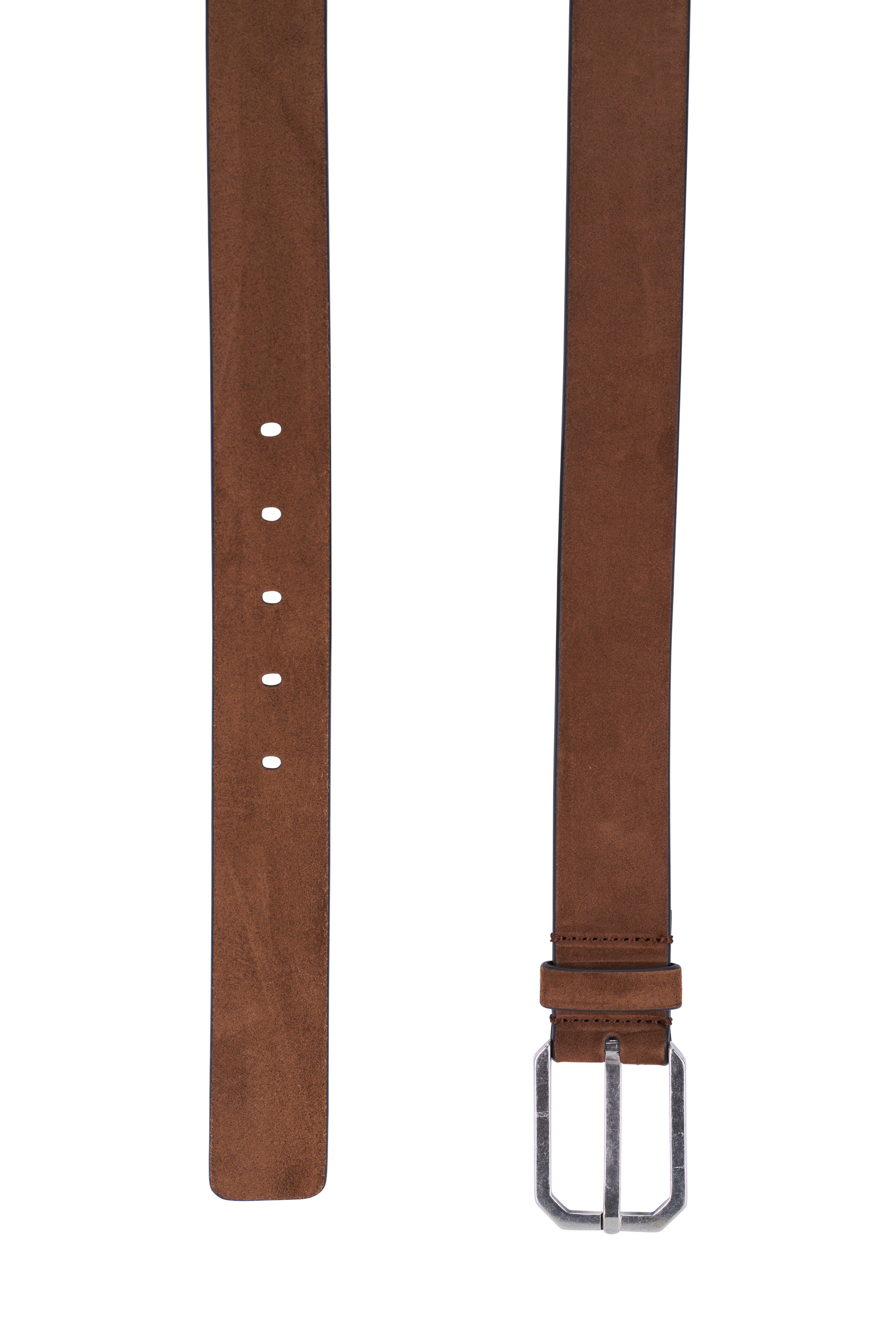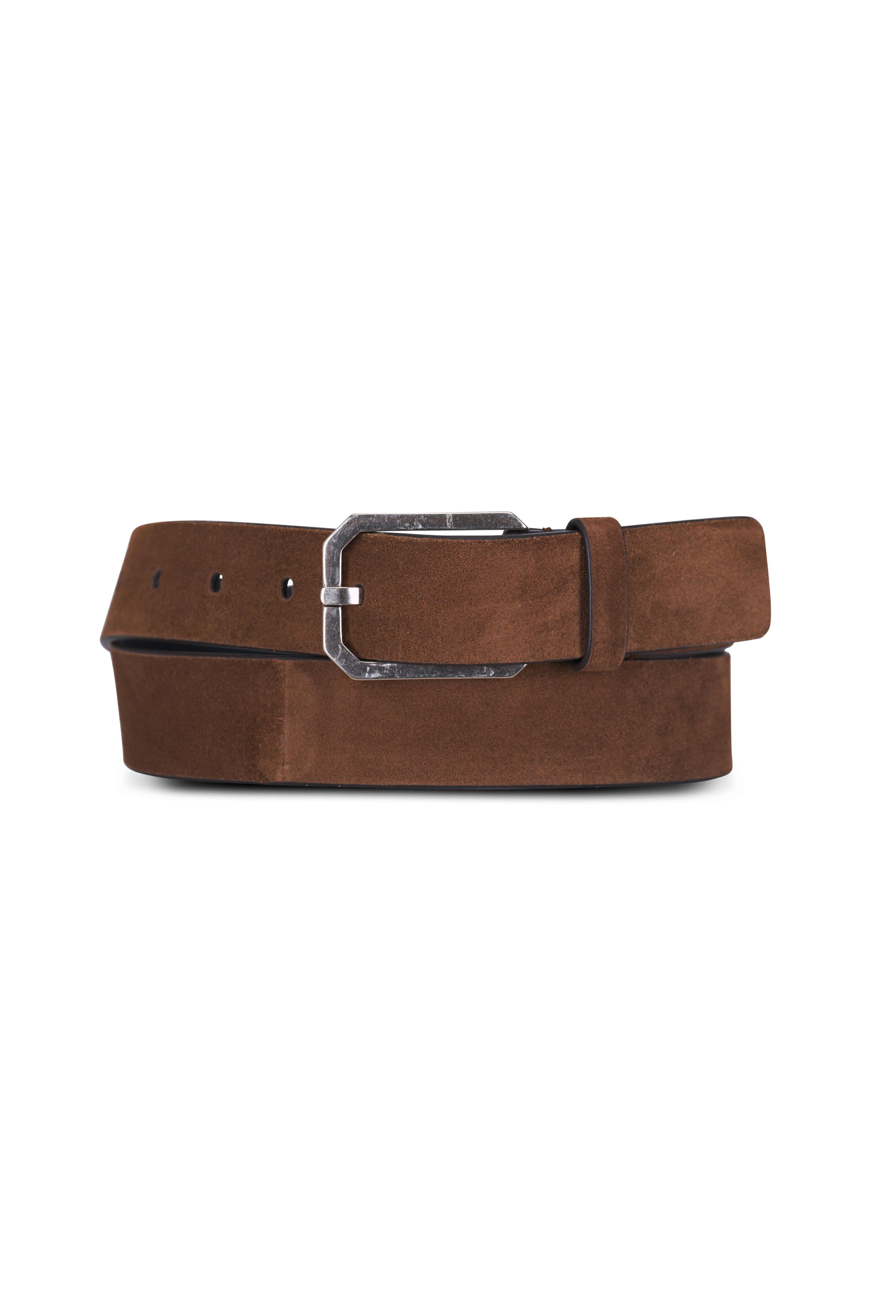 Suede. Single belt loop keeper. Silver-tone square buckle. Made in Italy. 1.5" width.