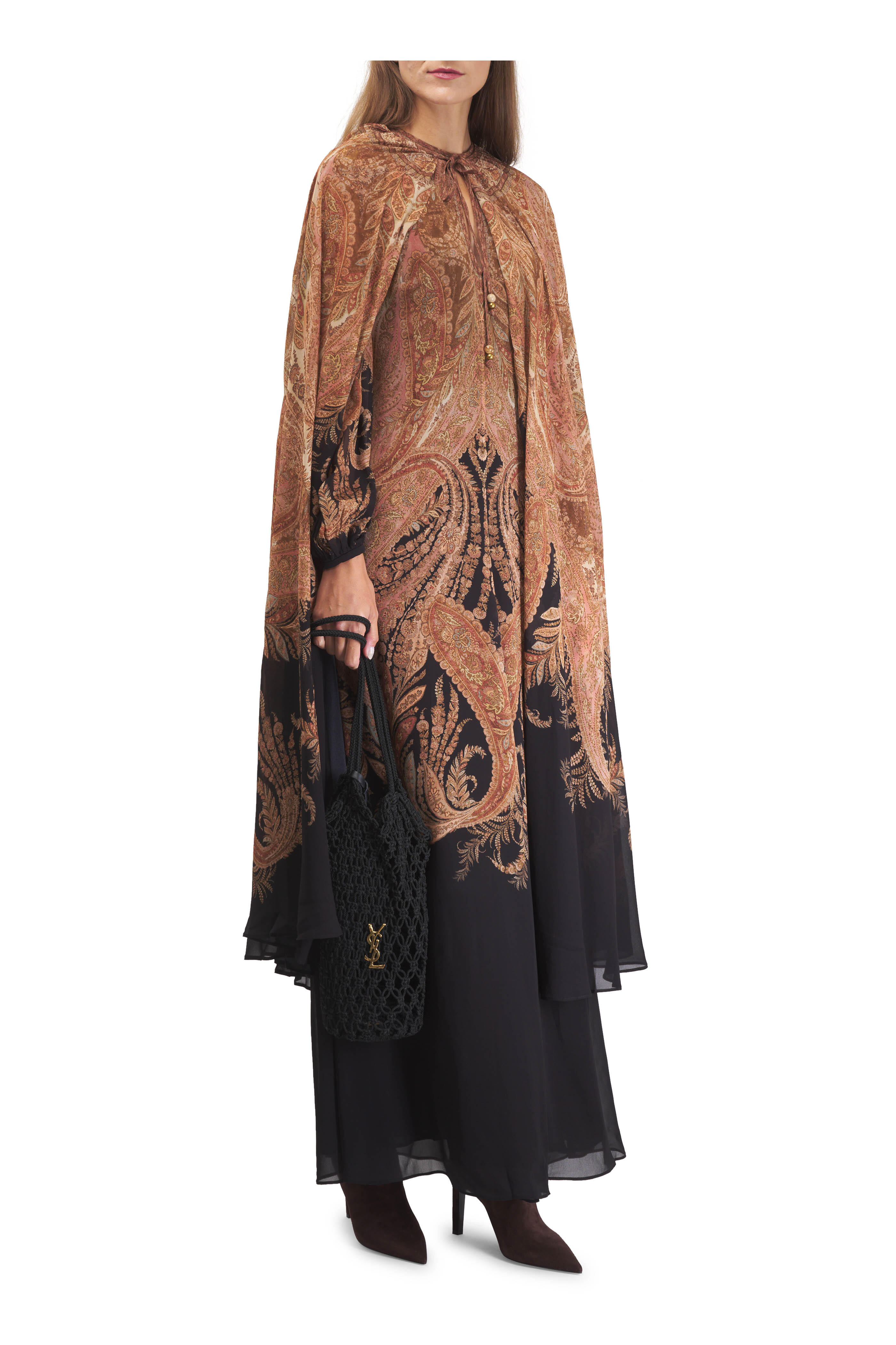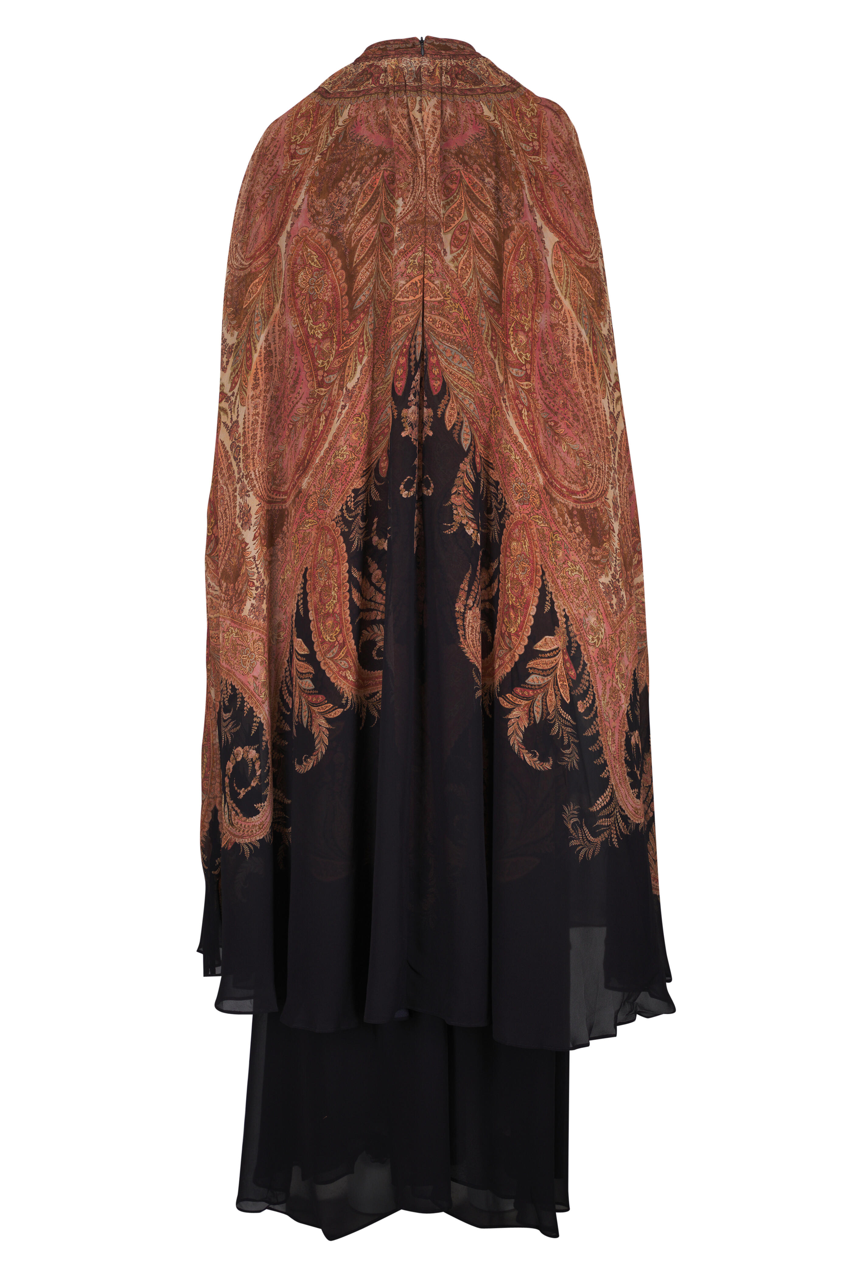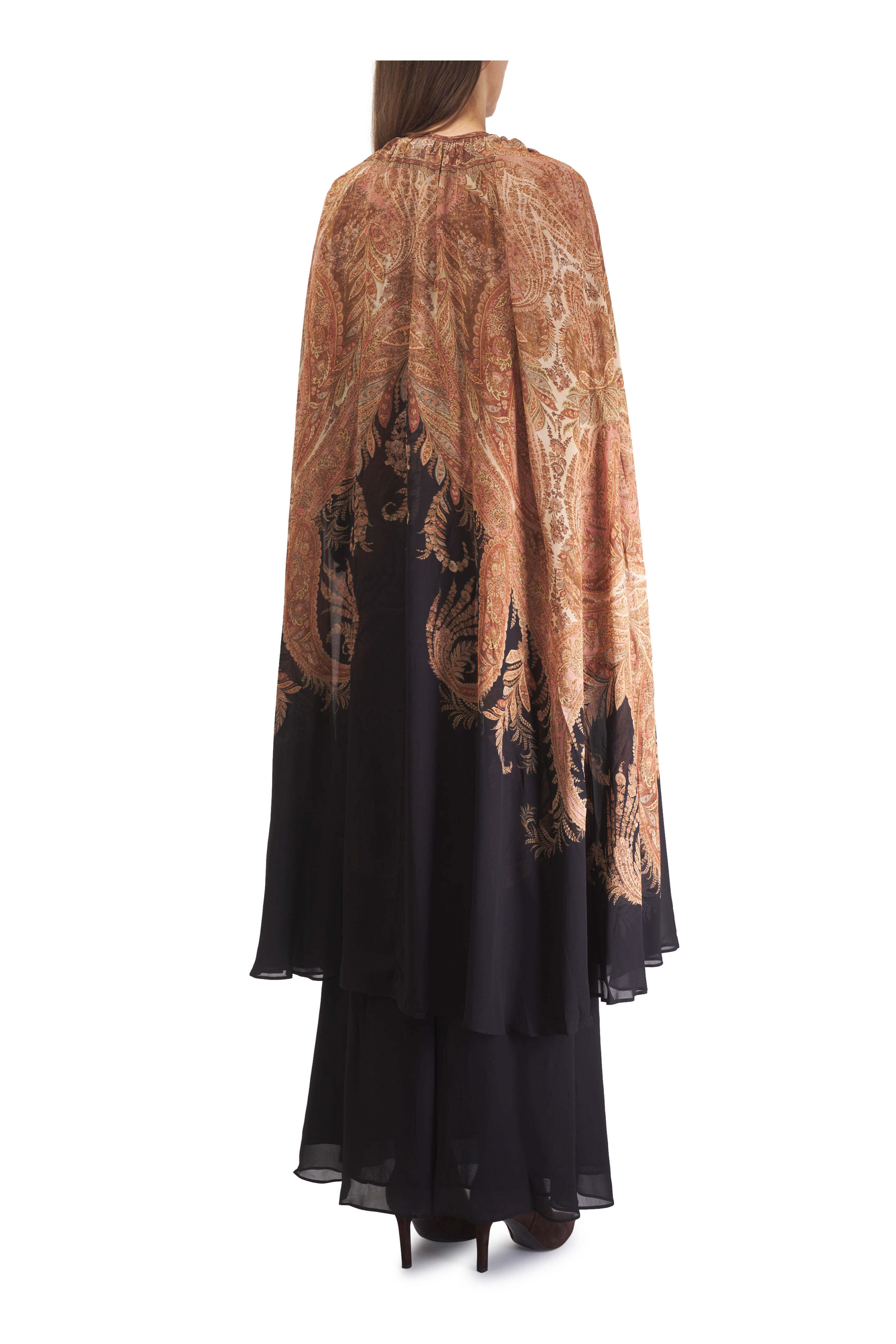 Crew neckline; keyhole detail. Concealed back zip. Removable cape. Elasticized sleeves. Imported. About 59" shoulder to hem. 100% viscose, lined. Dry clean.
