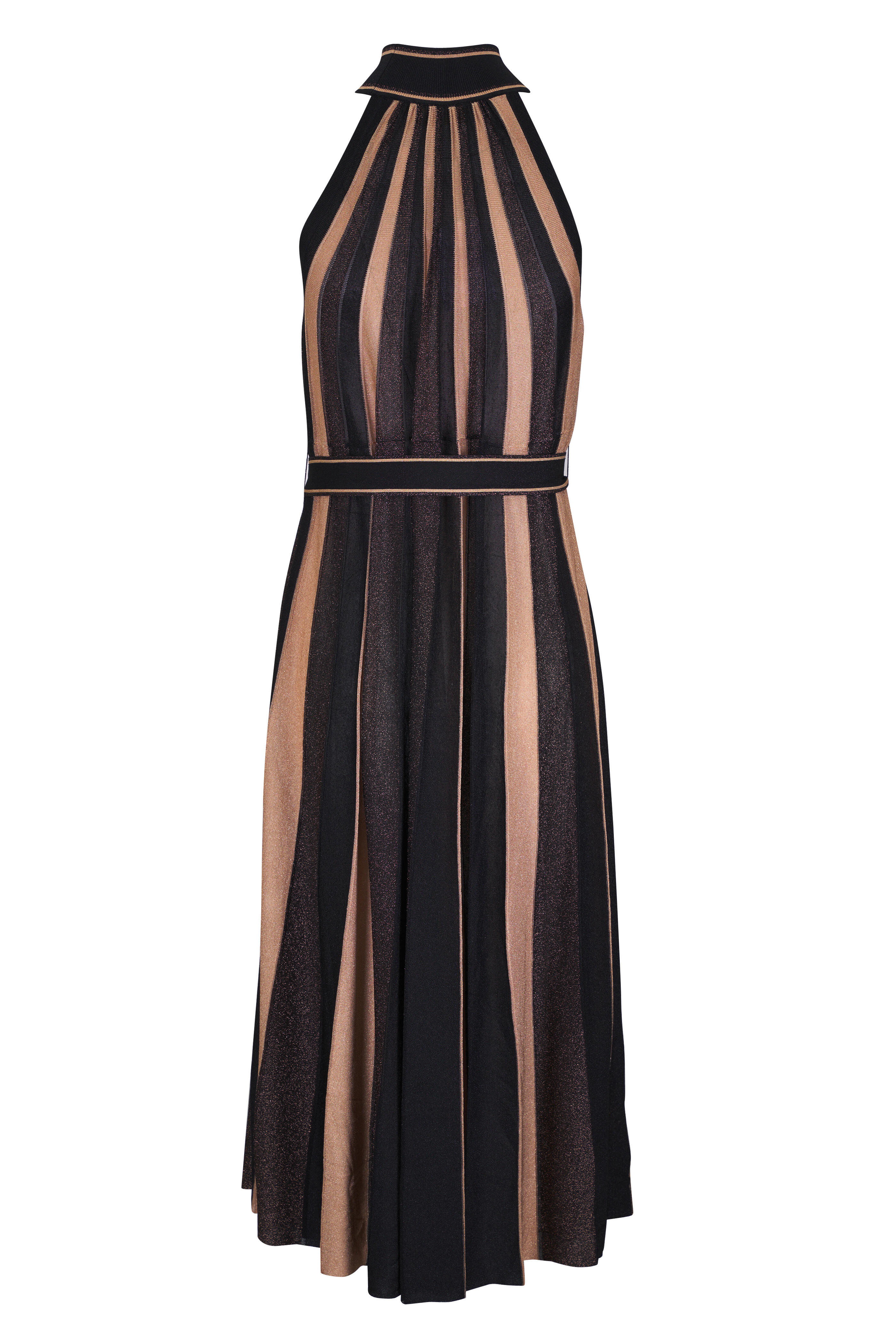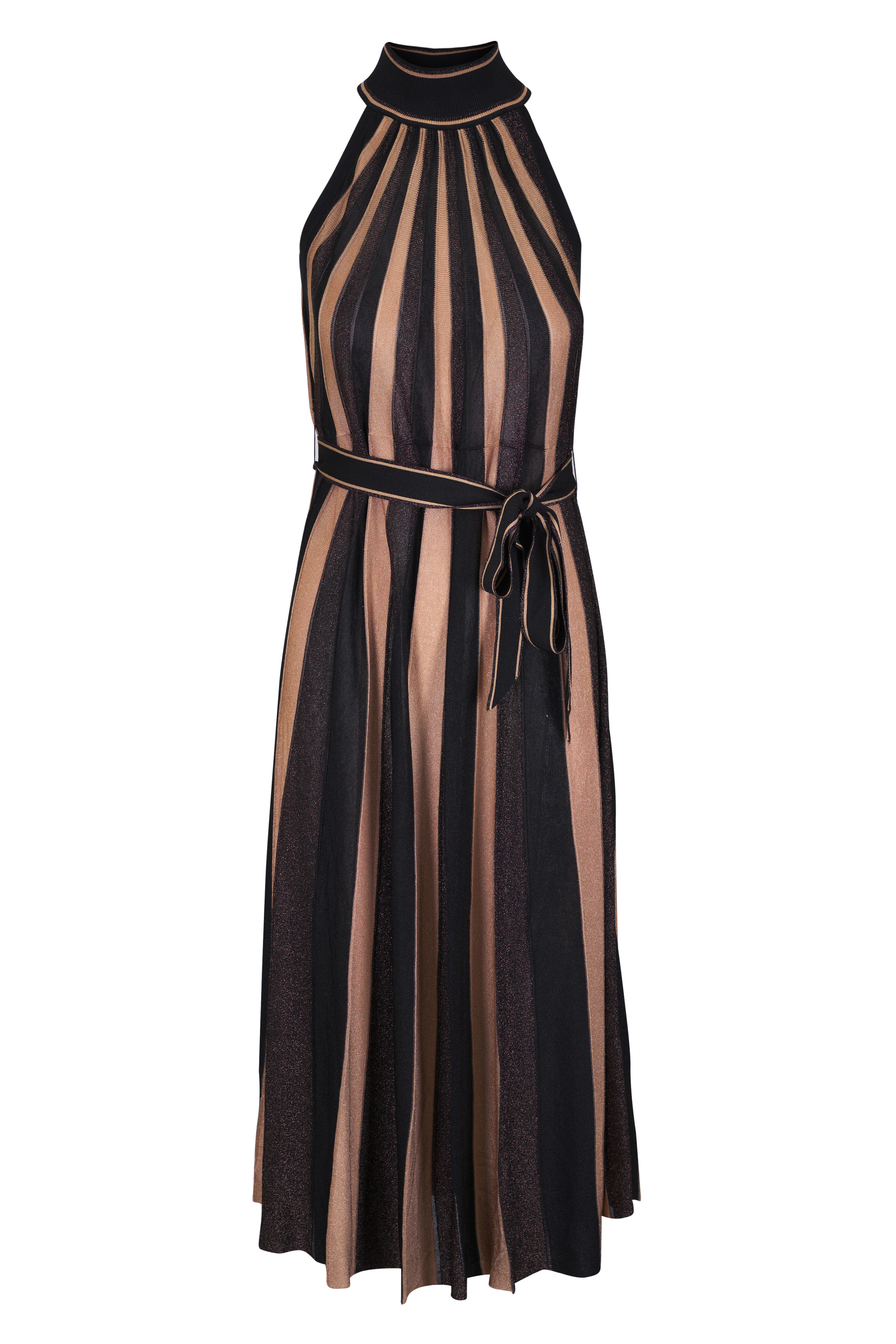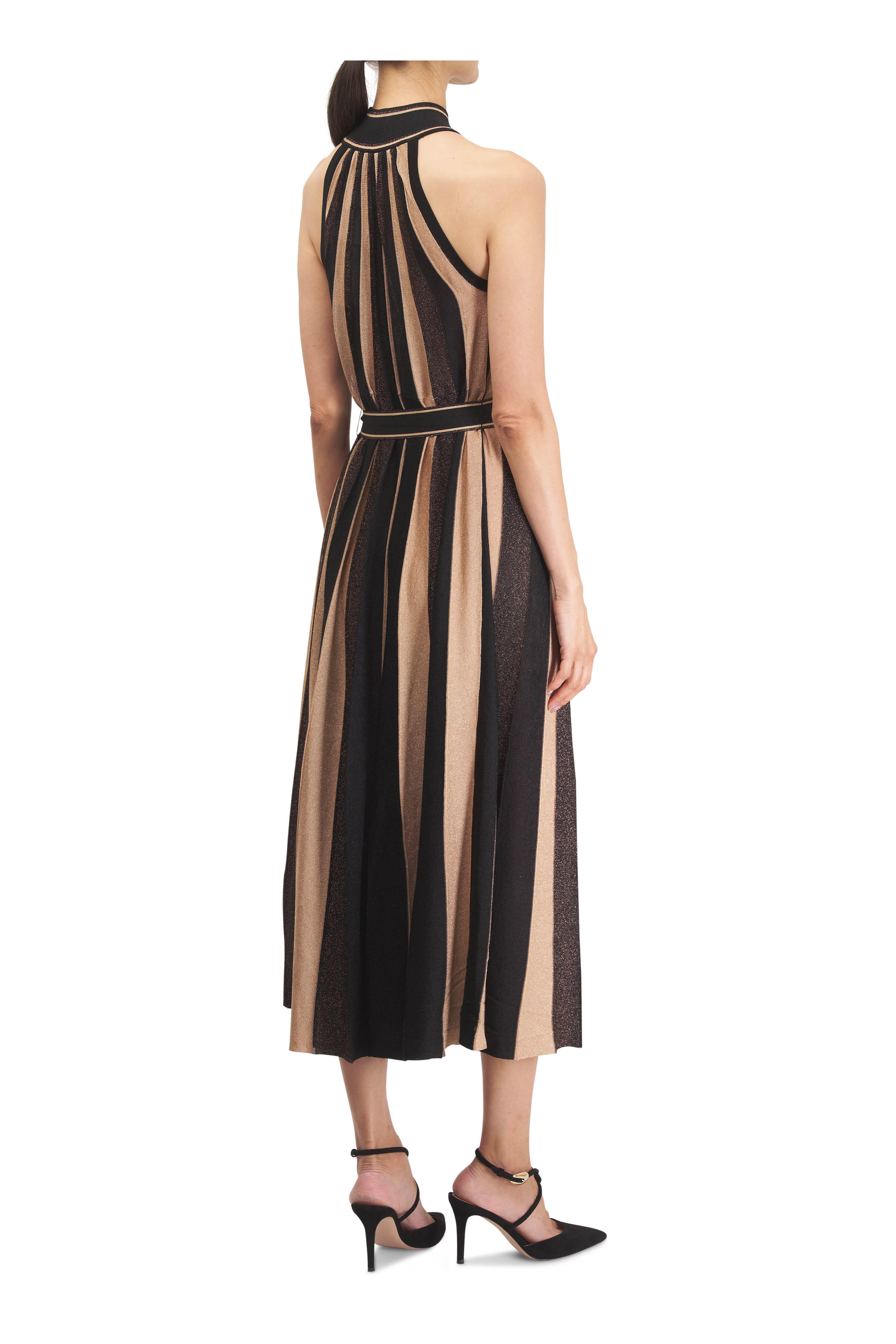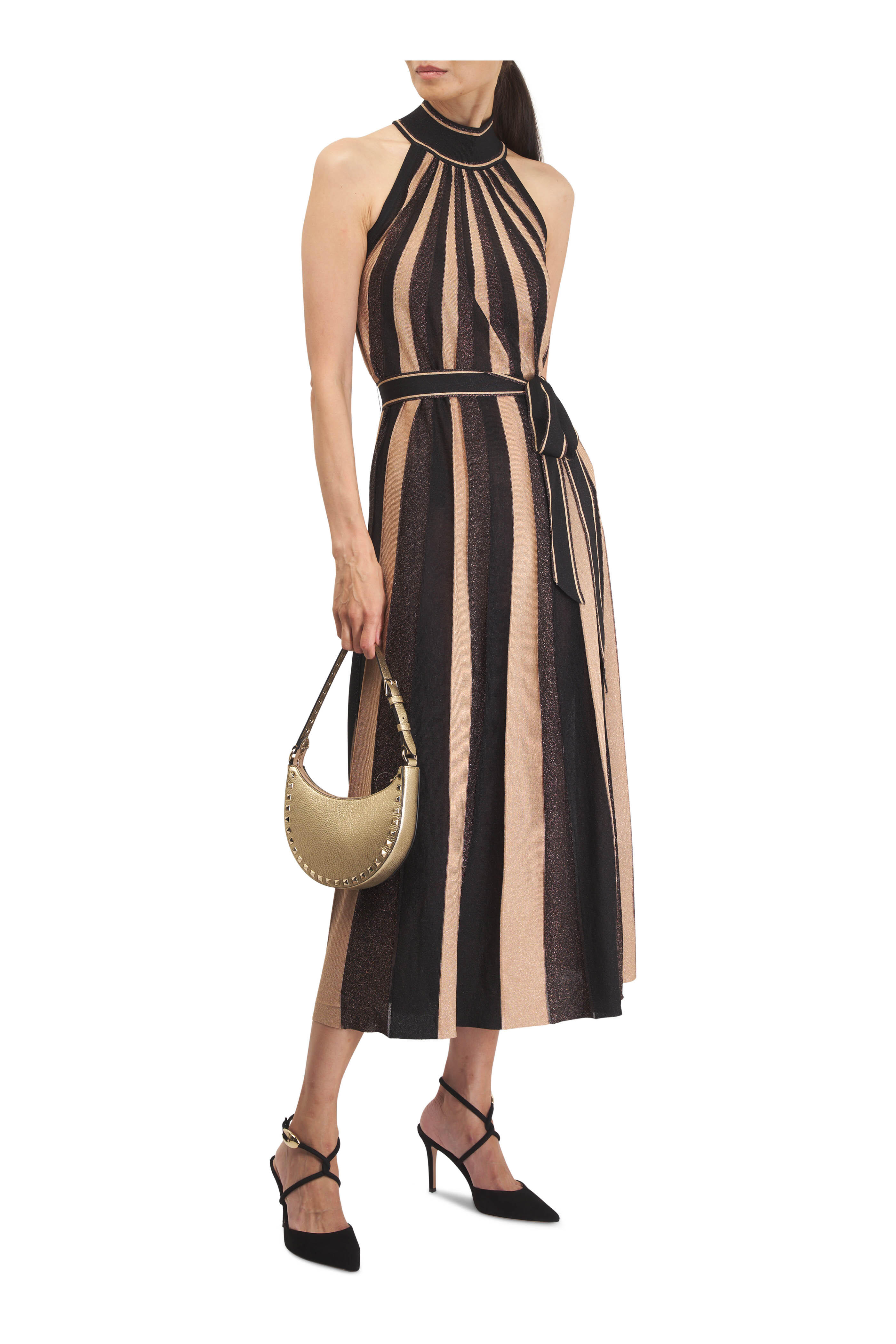 Halter neckline. Removable self-tie belt. Drop skirt. Imported. About 51" shoulder to hem. 88% viscose 7% metallized fibers 5% polyamide. Dry clean.