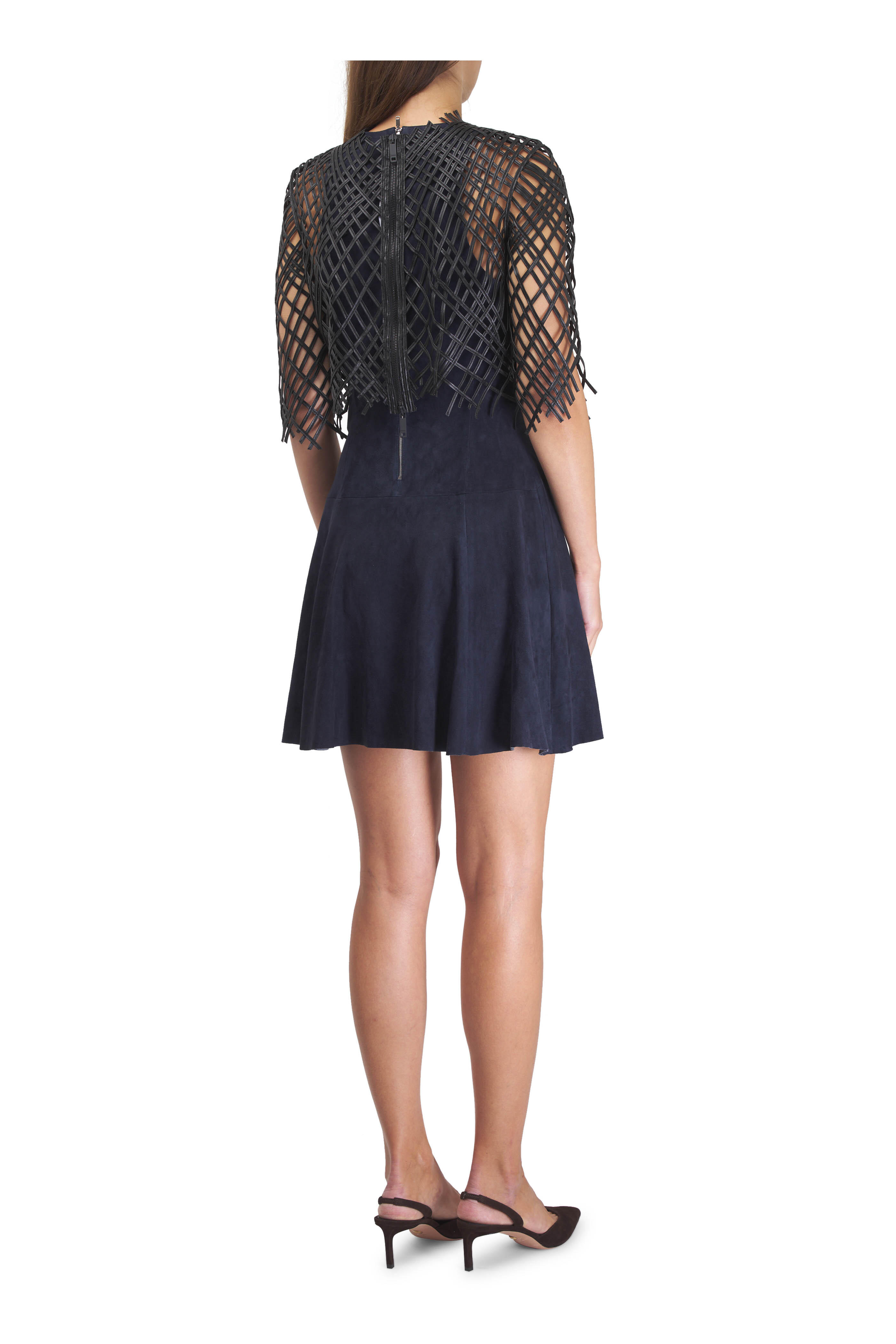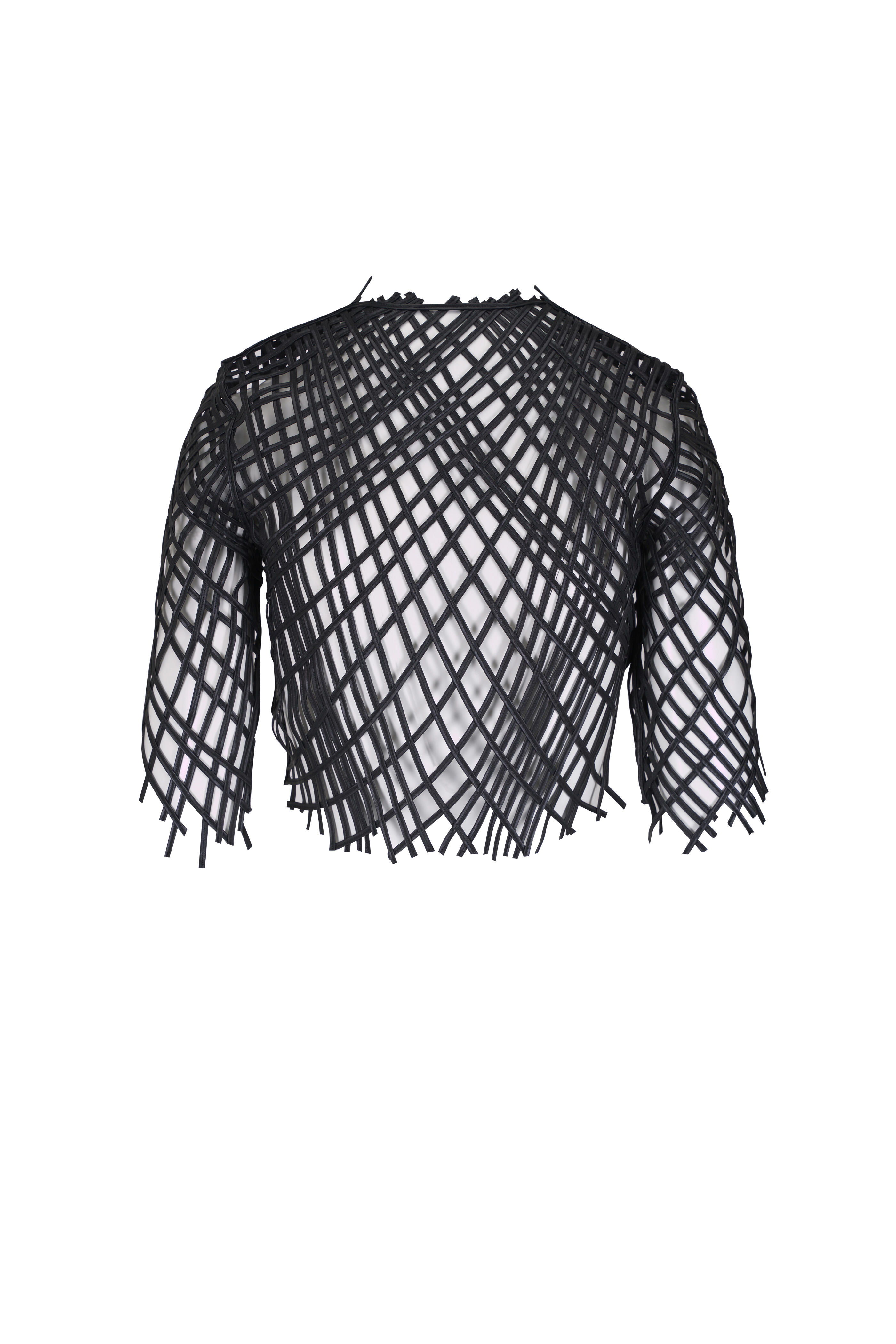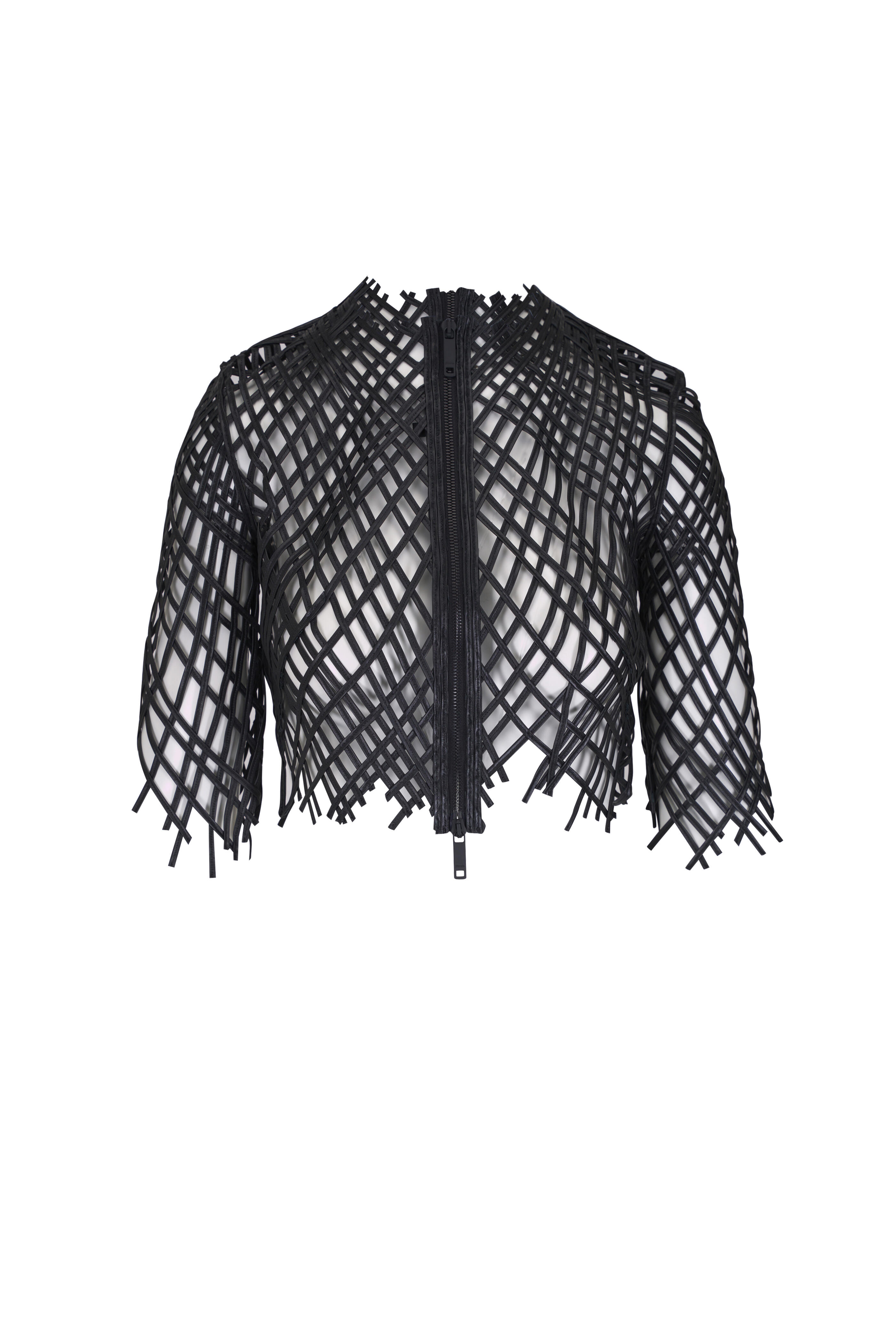 Lambskin leather. Specialist clean. Stand collar. Two-way front zip placket; mat zip closure. Three quarter sleeves. Made in France. Shoulder to hem 17" (size 4).