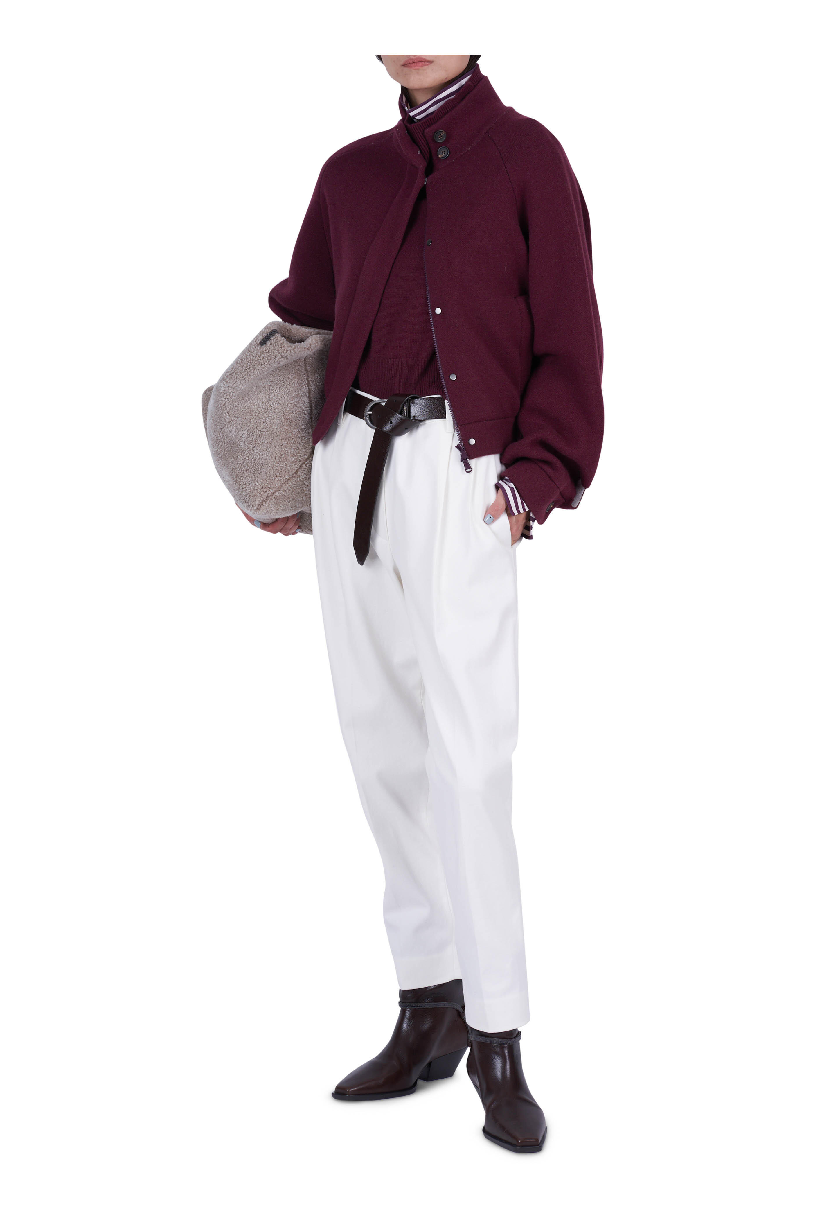 Mockneck. Shoulder button detail. Ribbed trims. Made in Italy. 100% cashmere. Dry clean.