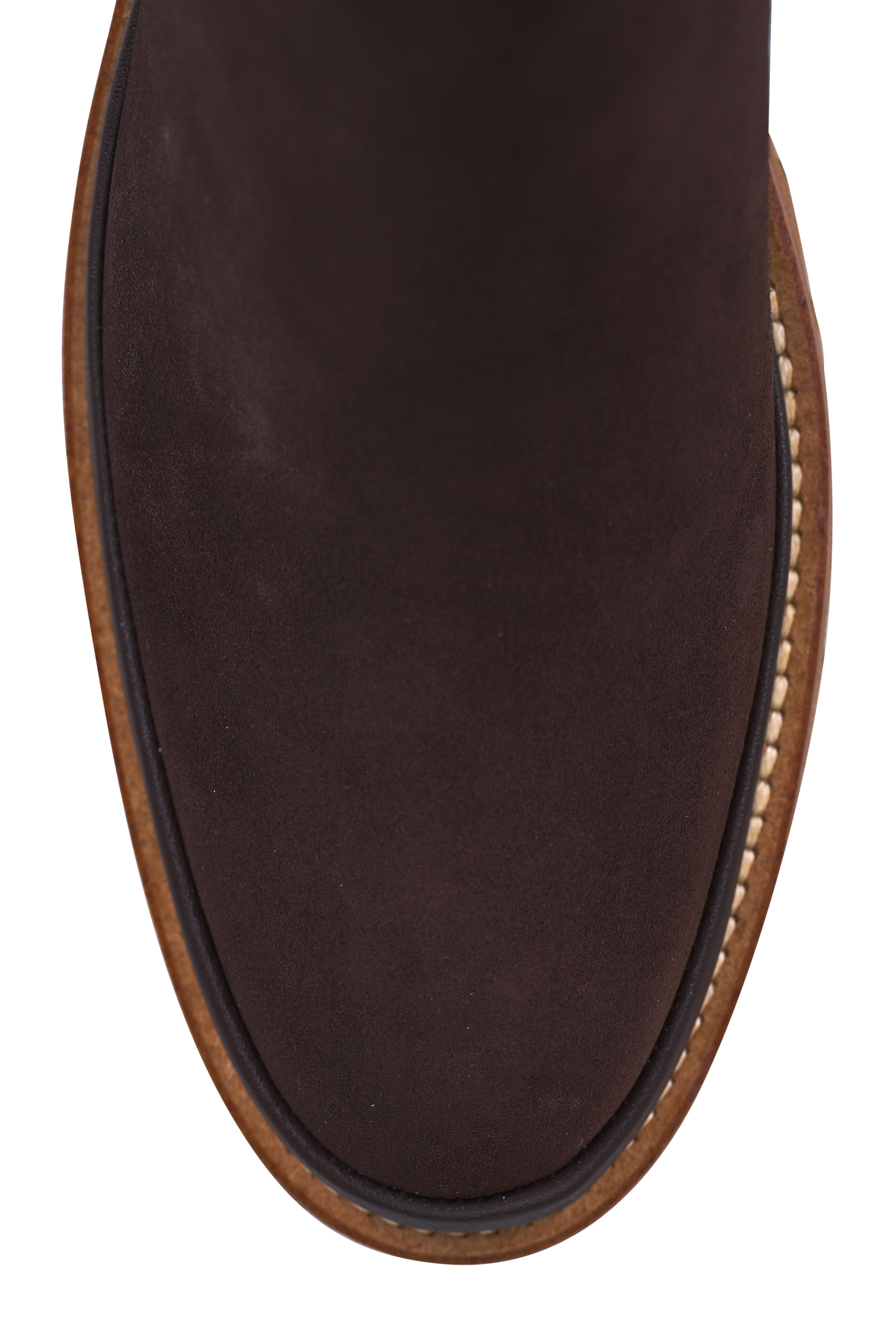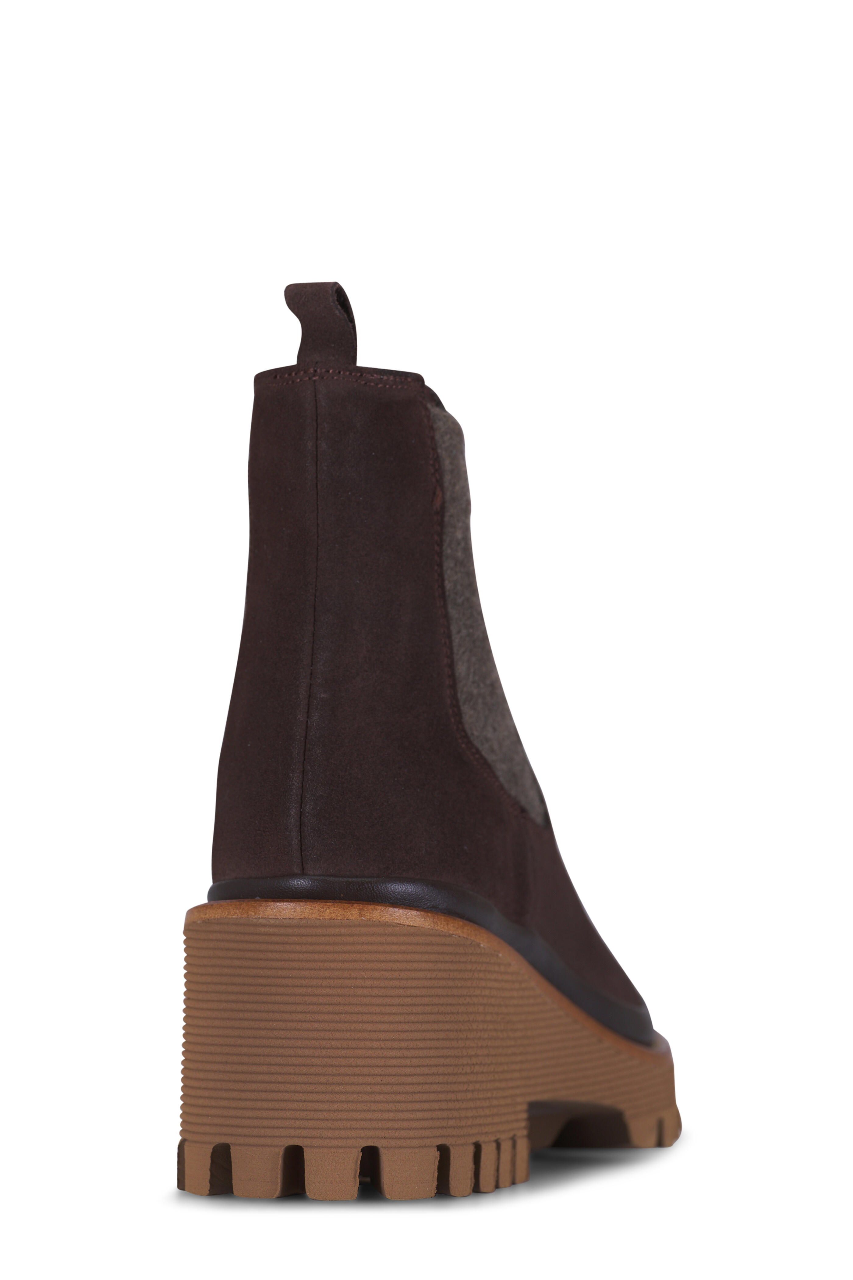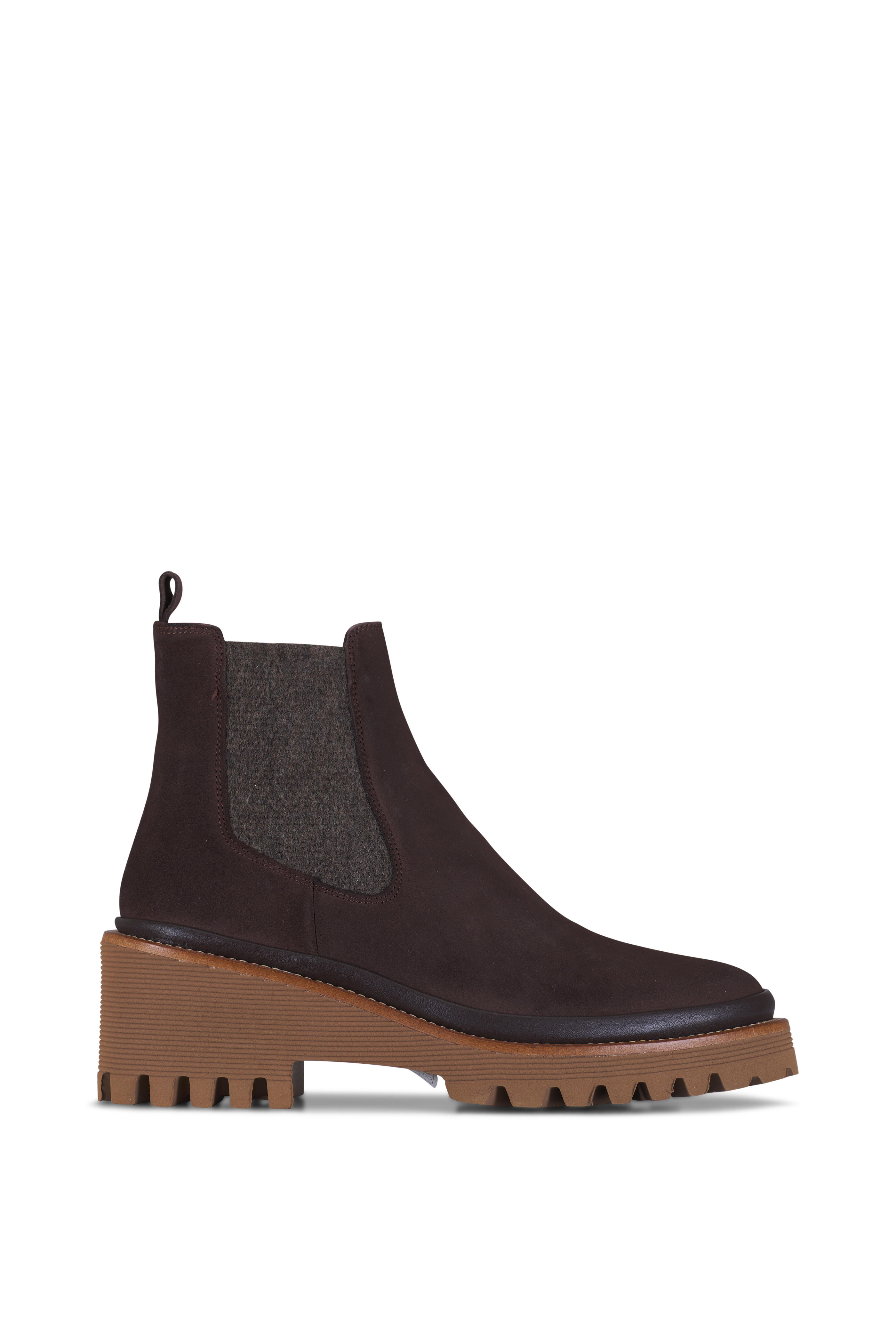 Suede upper. Almond toe. Pull-on style. Back cotton pull tab. Side elastic panels. Leather lining and insole. Rubber sole. Made in Italy. Runs small, size up. Heel measurement: 50mm.
