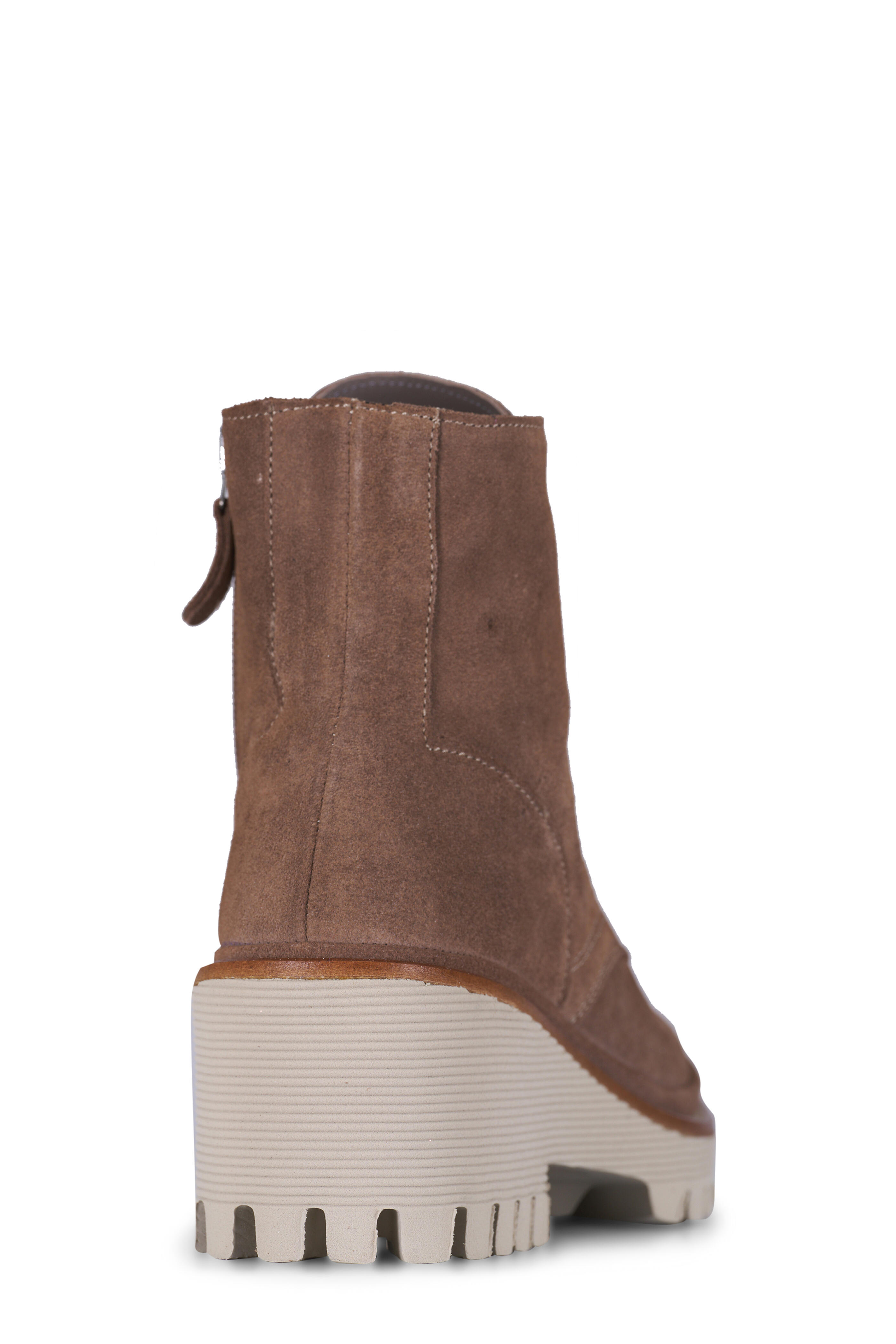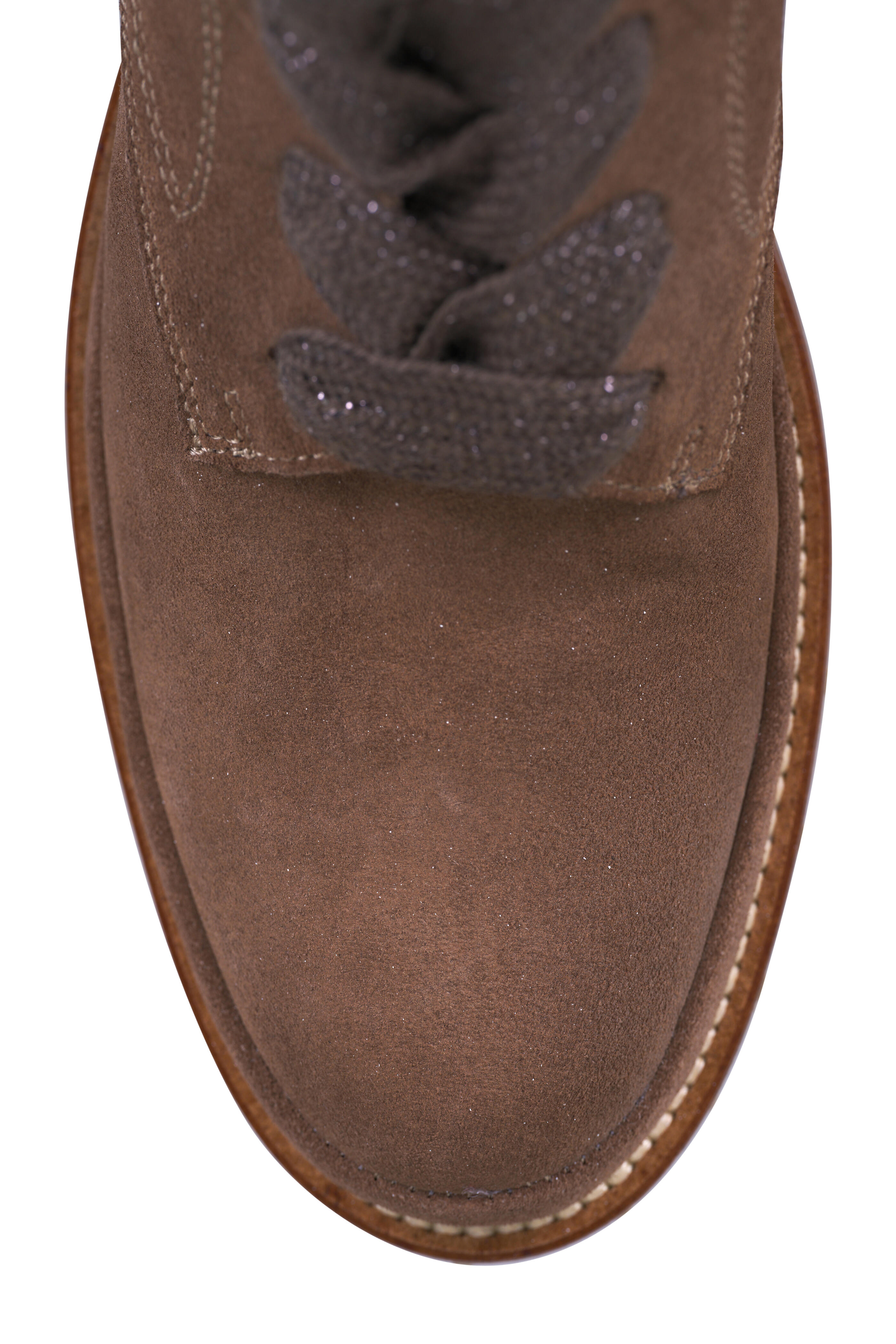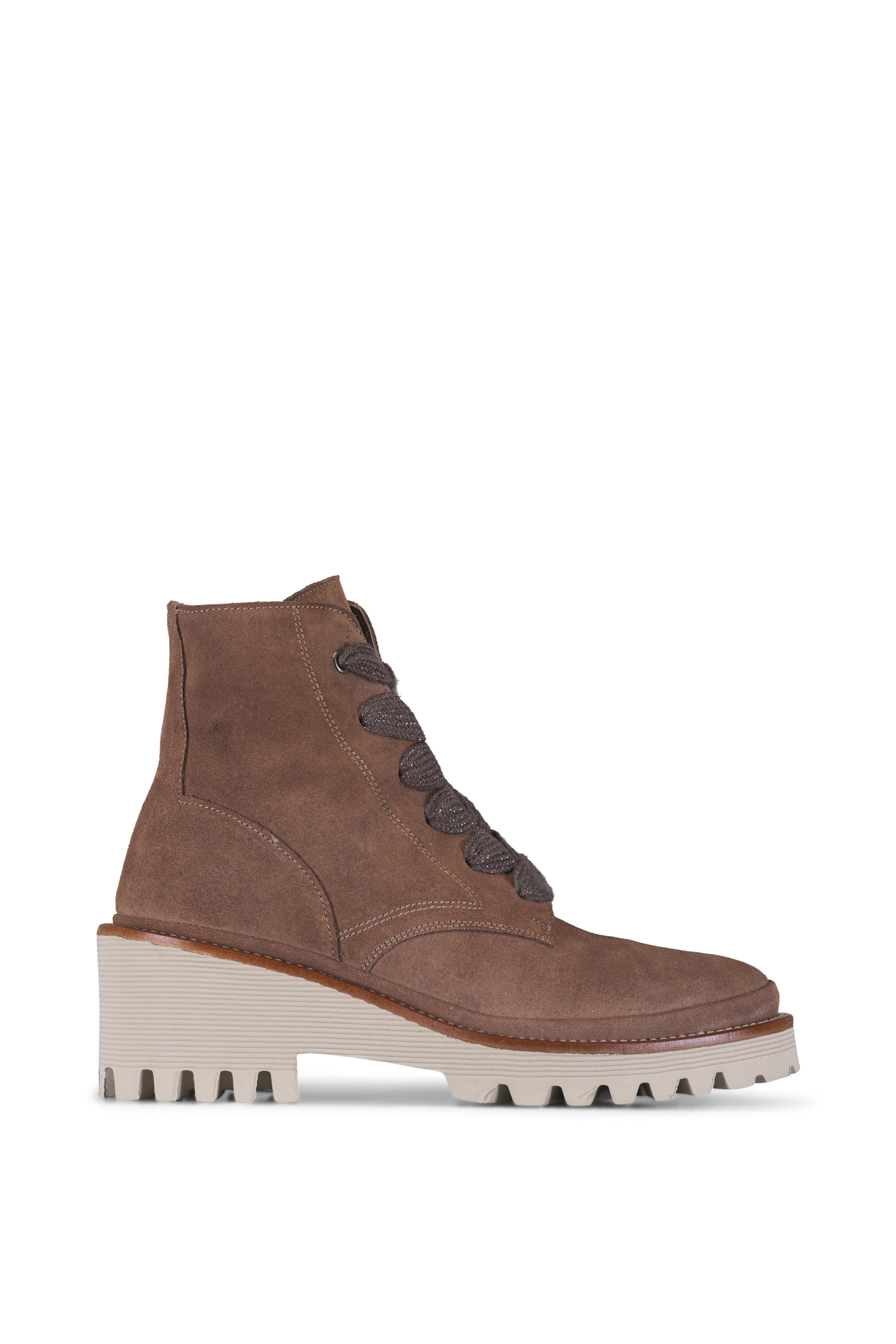 Suede upper. Round toe. Lace-up. Leather lining and insole. Rubber sole. Made in Italy. Runs small, size up. Heel measurement: 50mm.