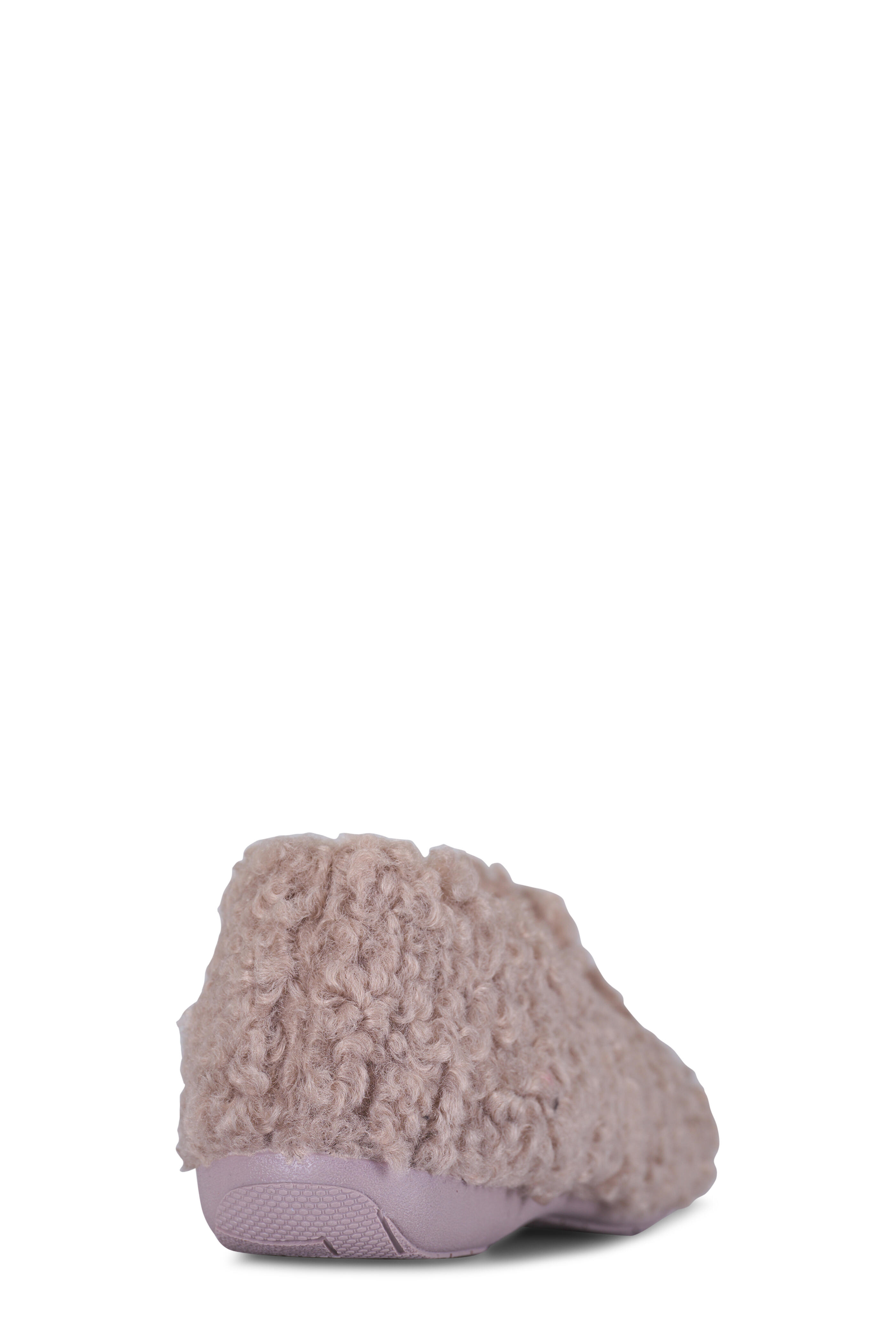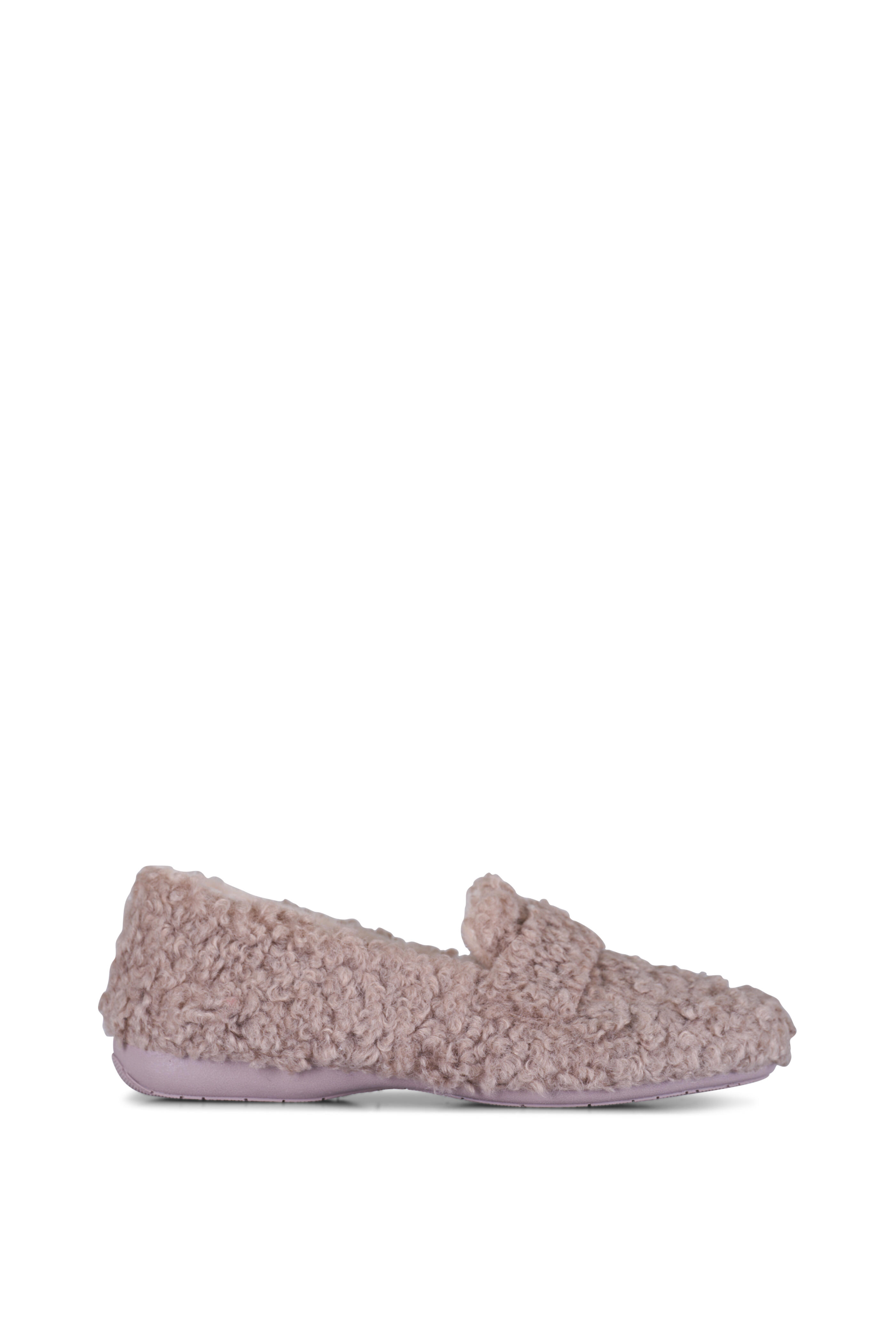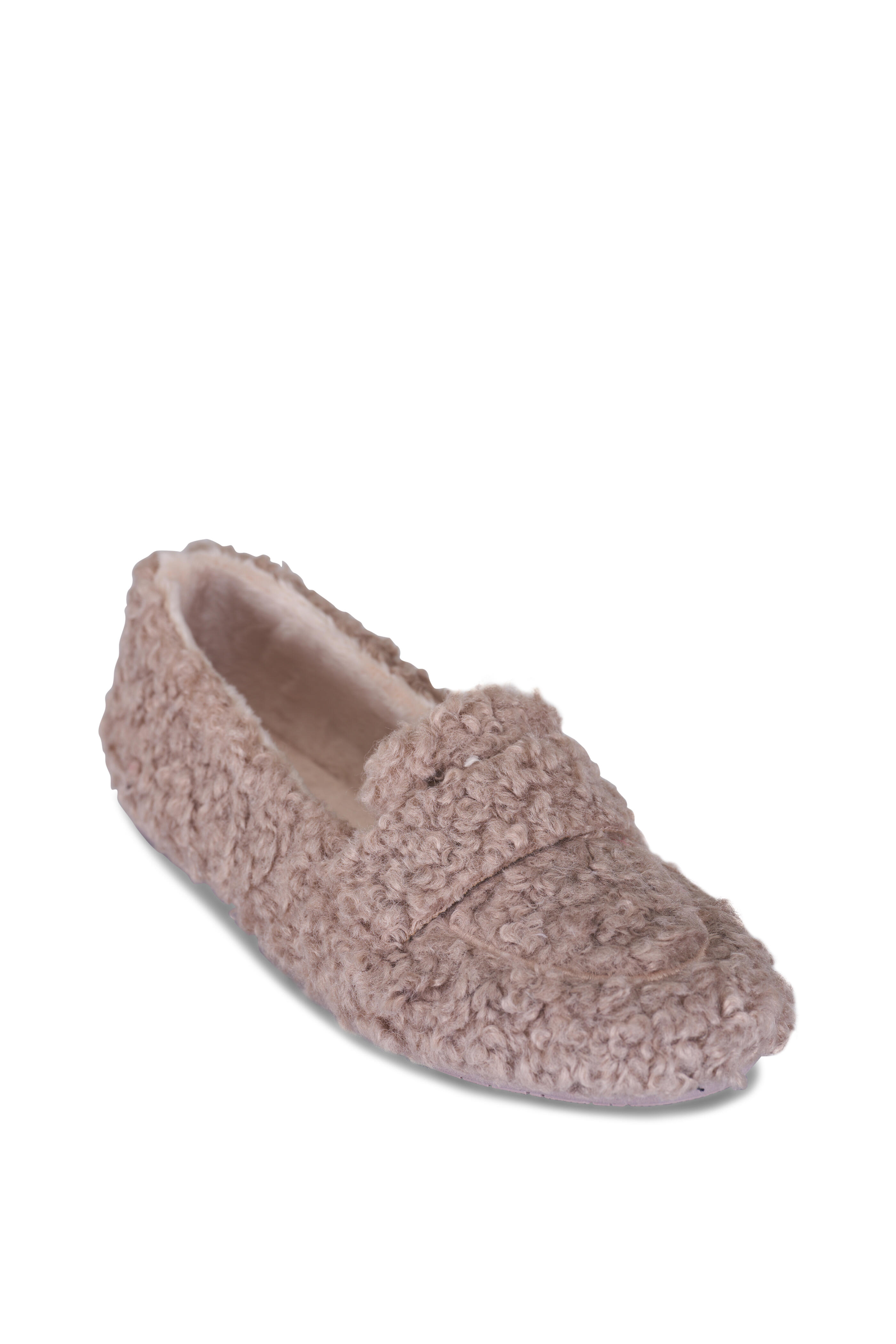Wool boucle upper. Slip on style. Plush lining; pillow cushioning. Anti-slip rubber sole. Made in Italy. Runs small, size up.