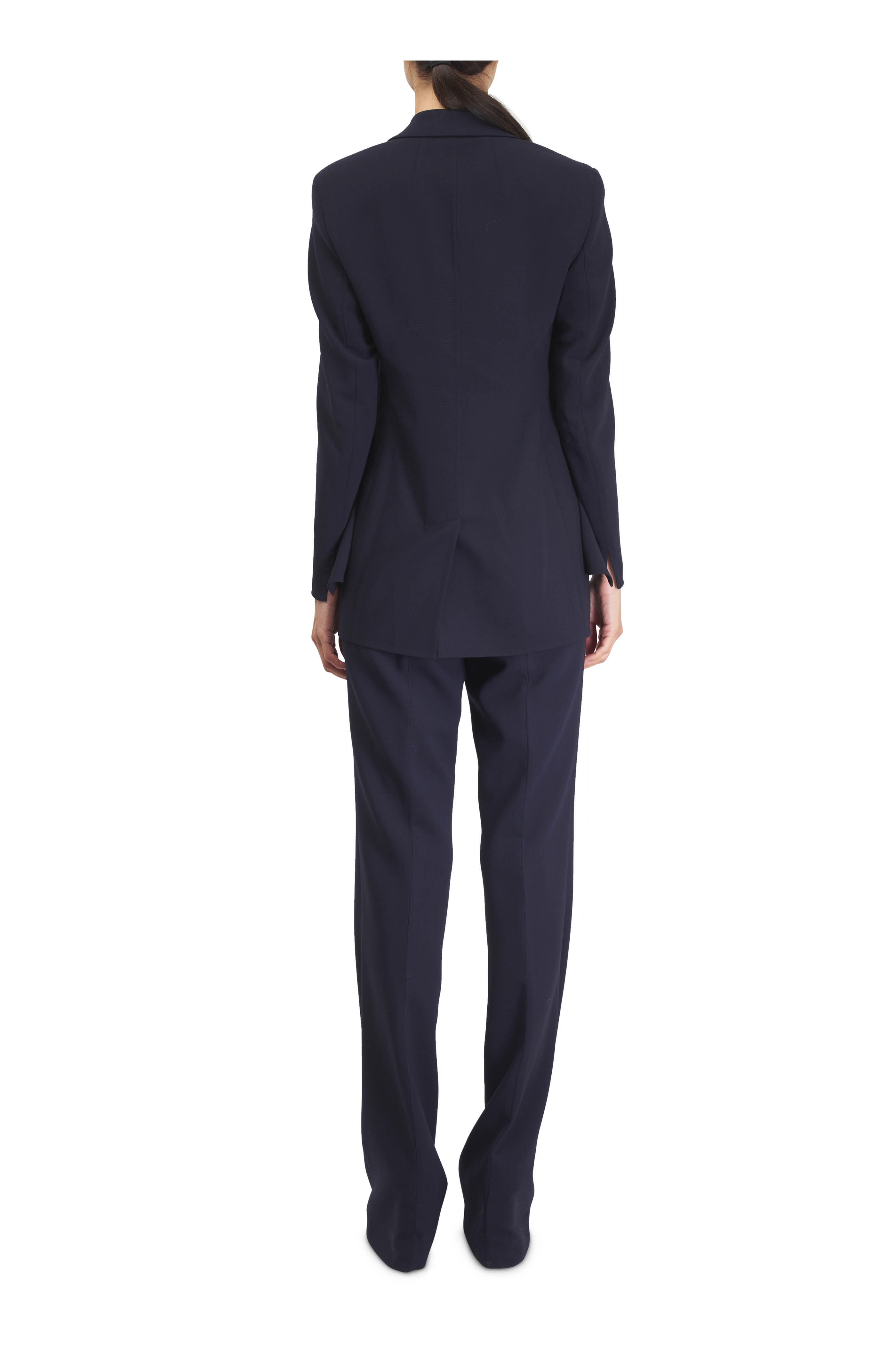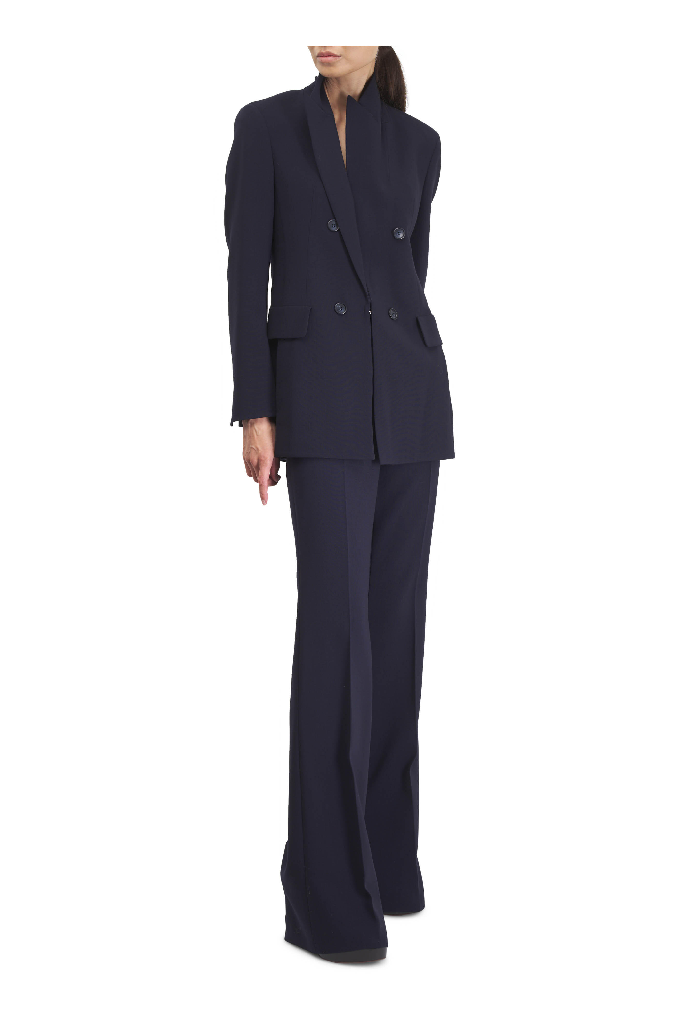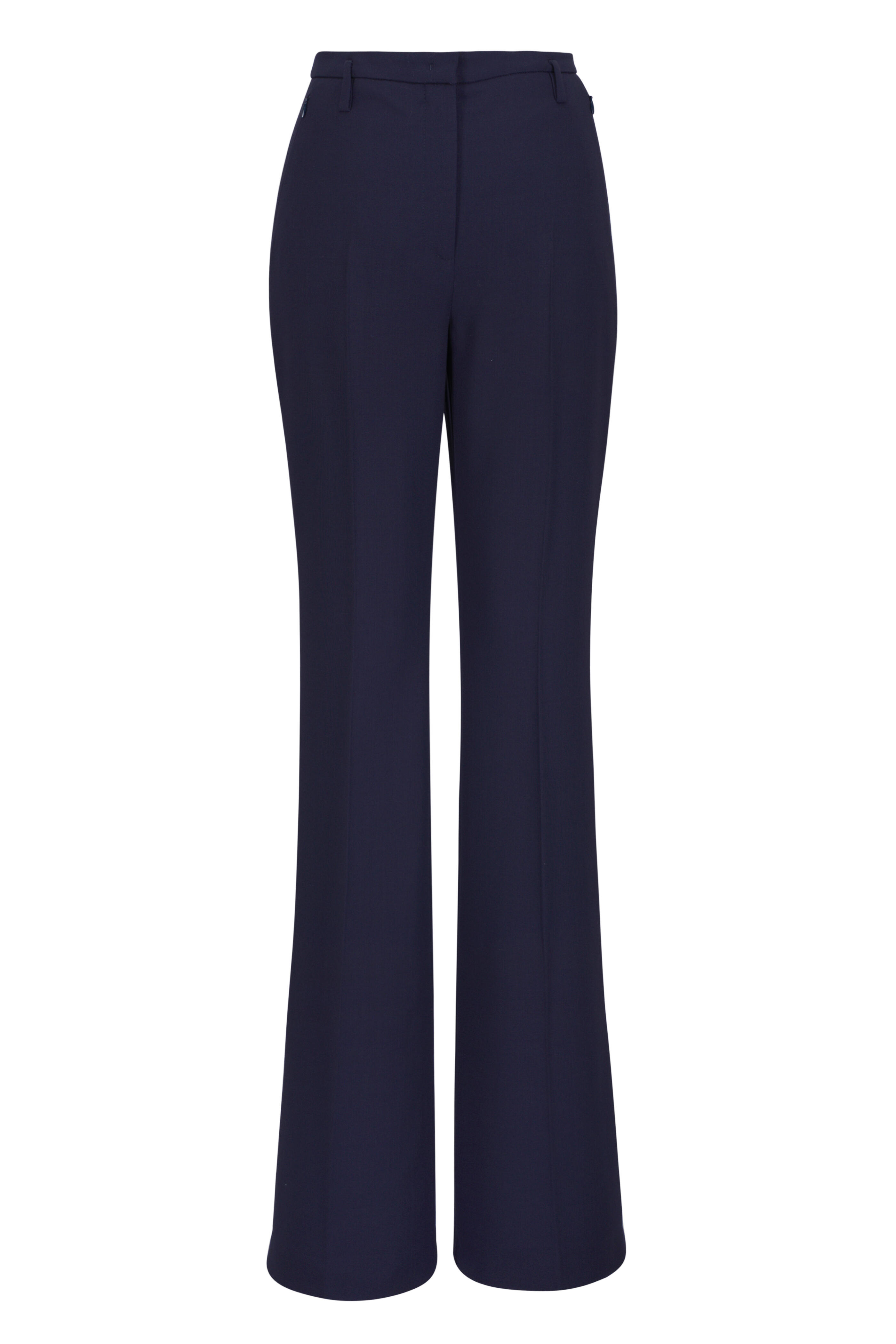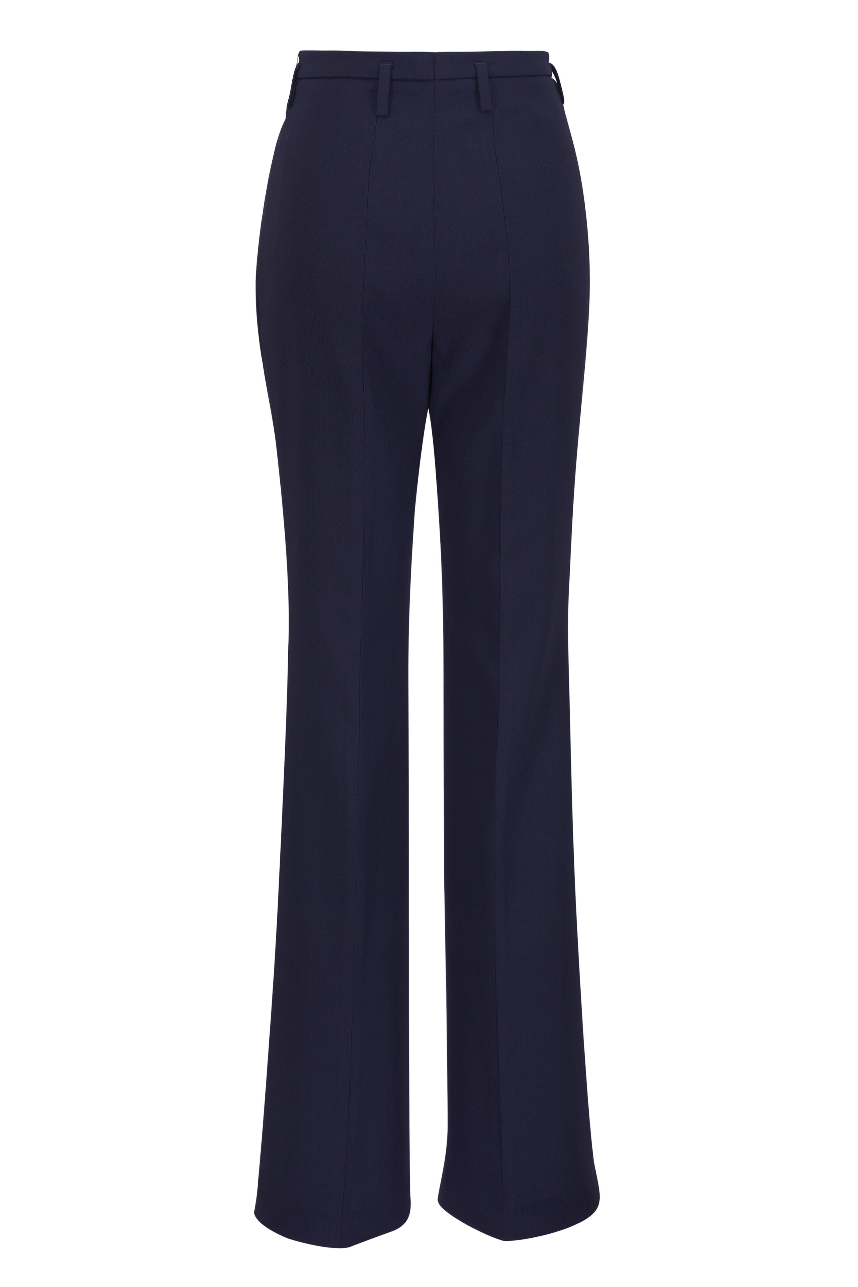 Zip fly; hook-and-eye closure. Banded waist; belt loops. Side zip pockets. Pleated front. Fabric from Italy. Inseam: 37". 99% wool, 1% polyamide; lined. Dry clean.