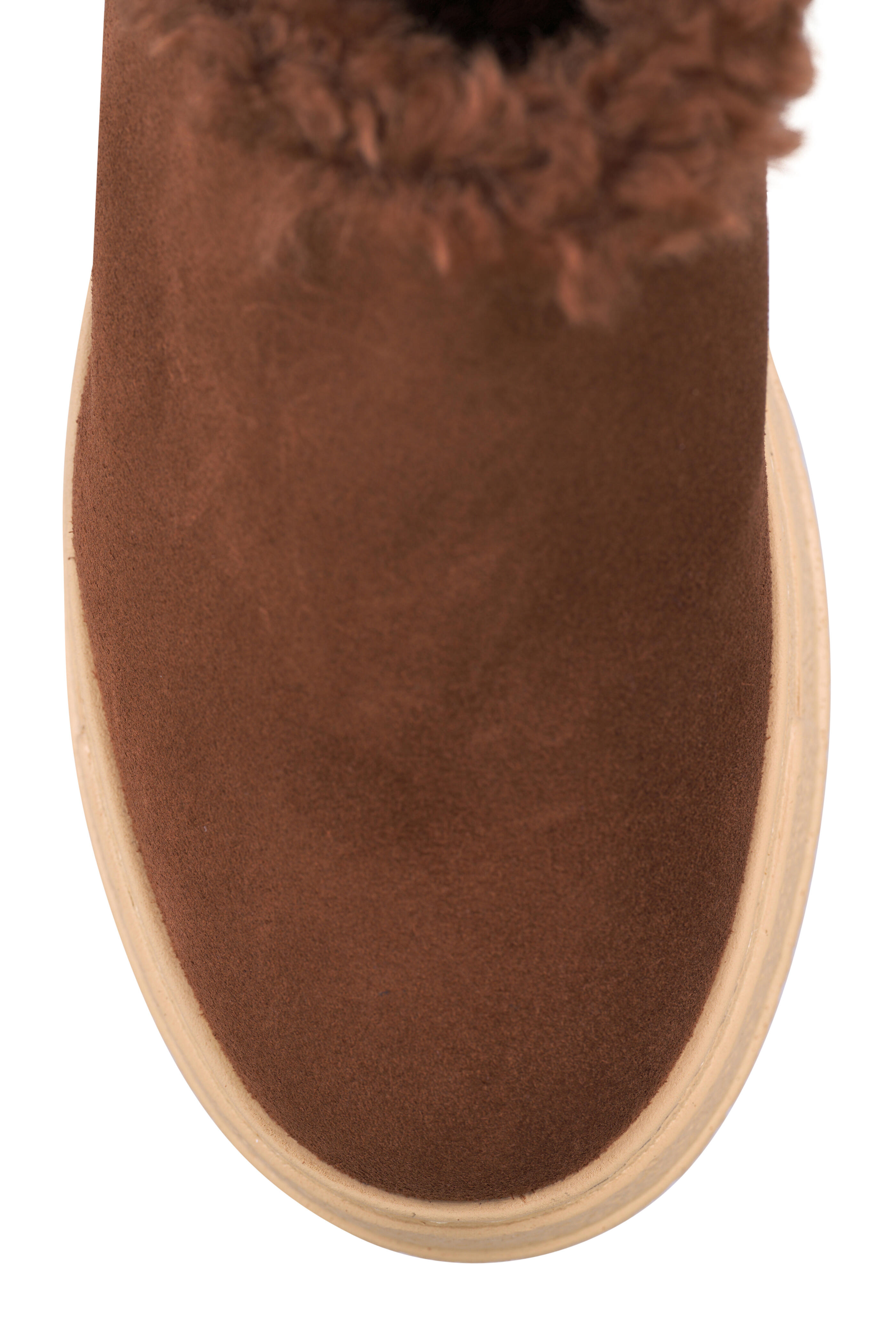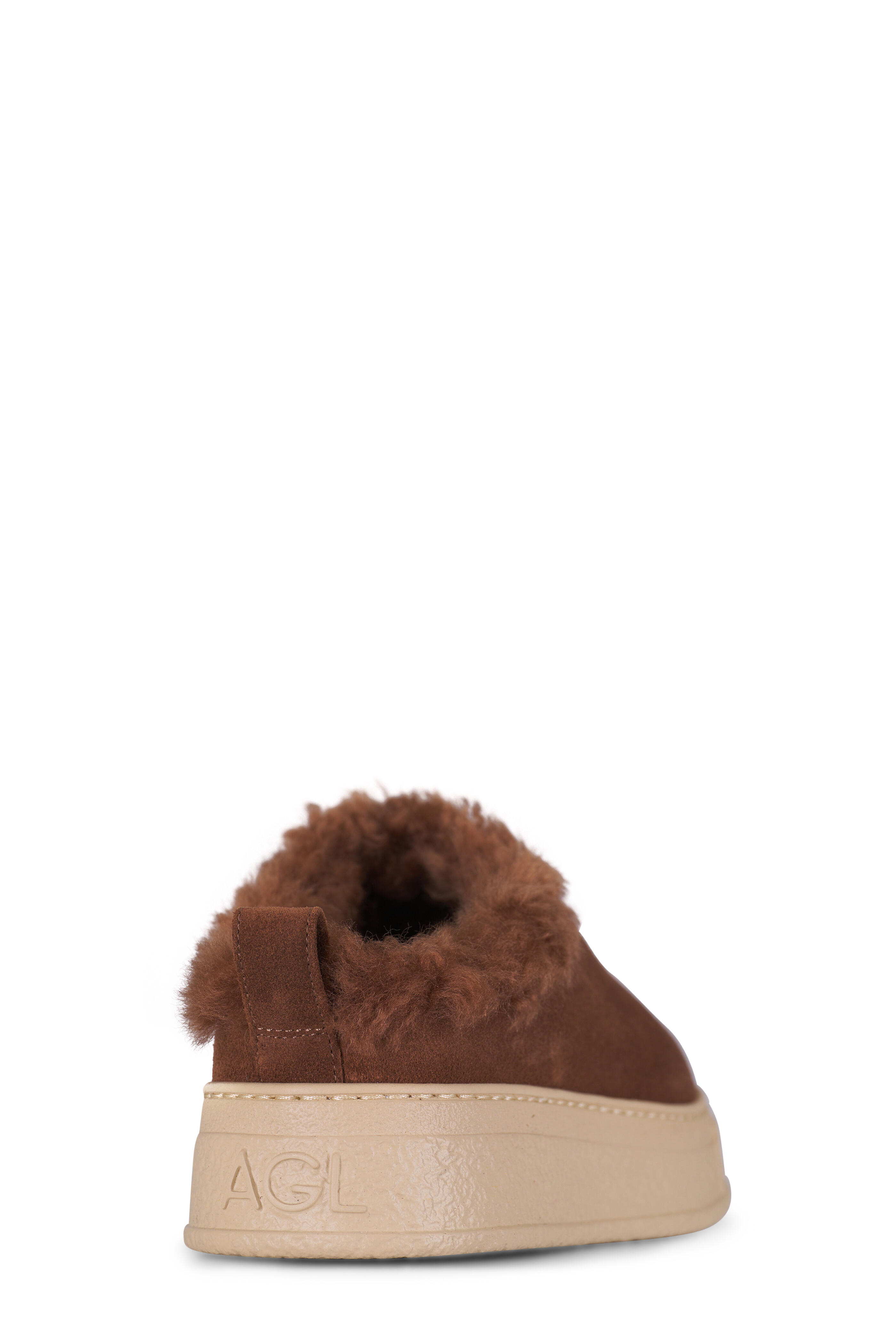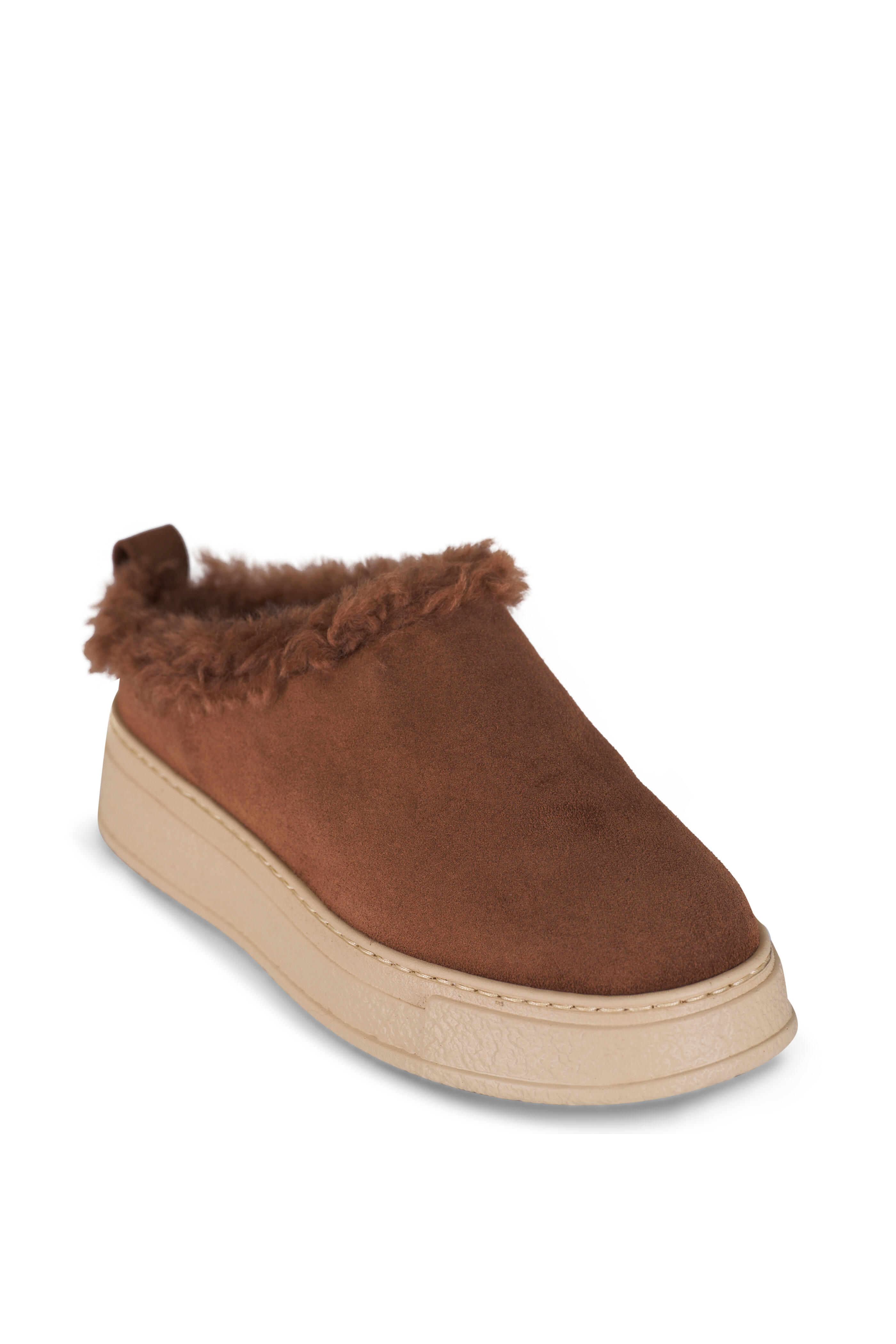Suede upper. Round toe. Slip on style. Molded footbed; fur lined. Rubber sole. Made in Italy. Color: Cognac.
