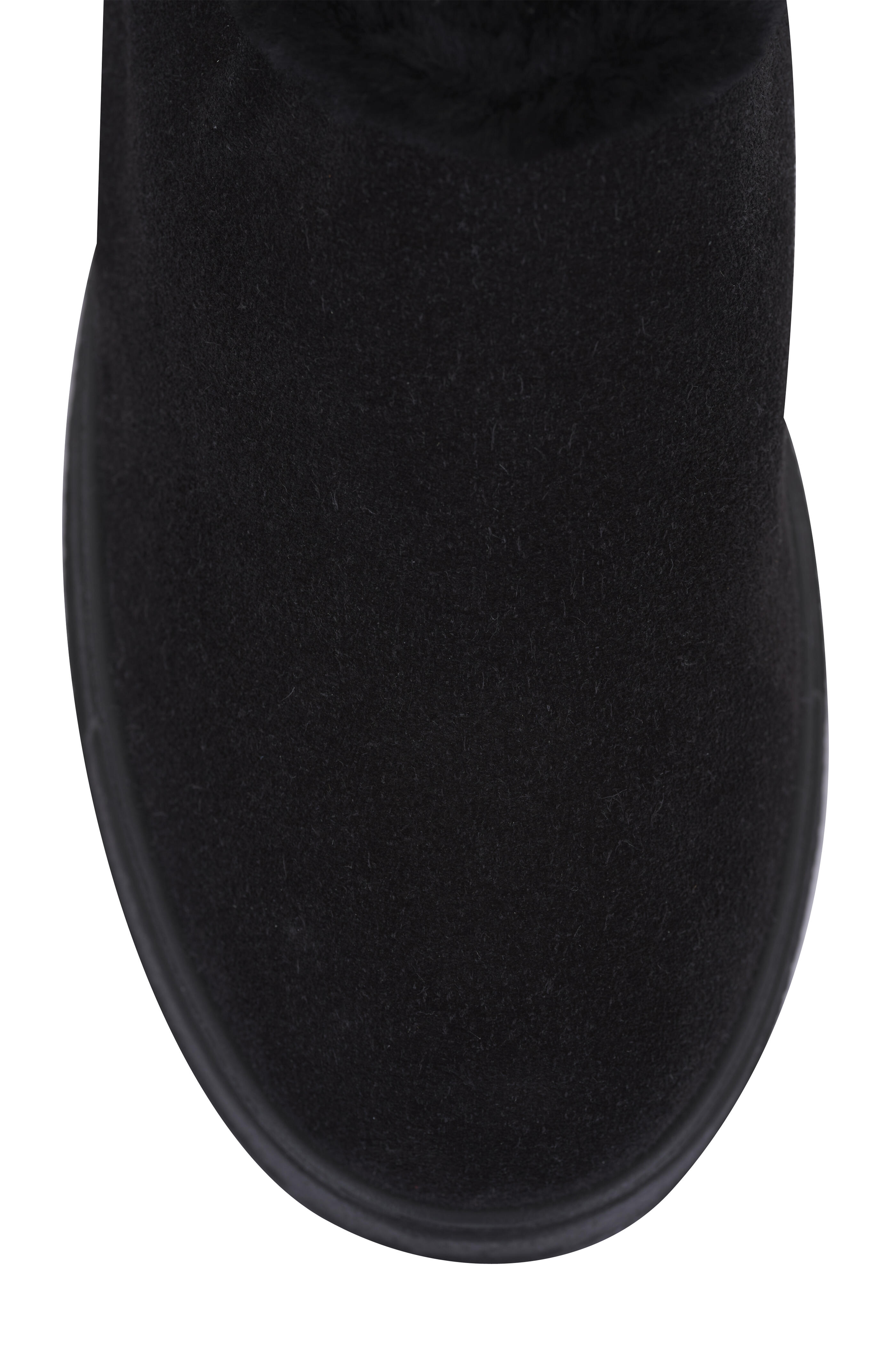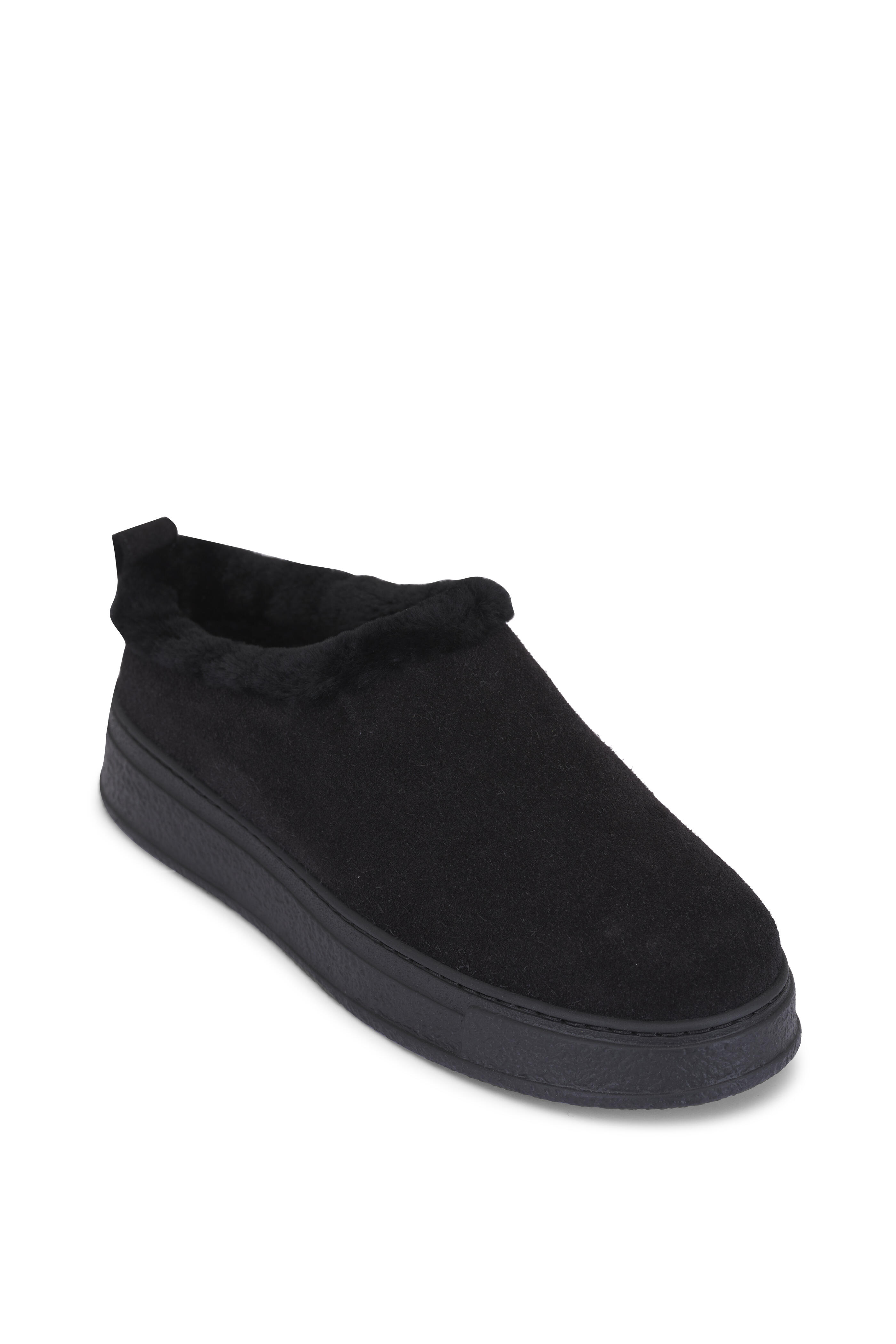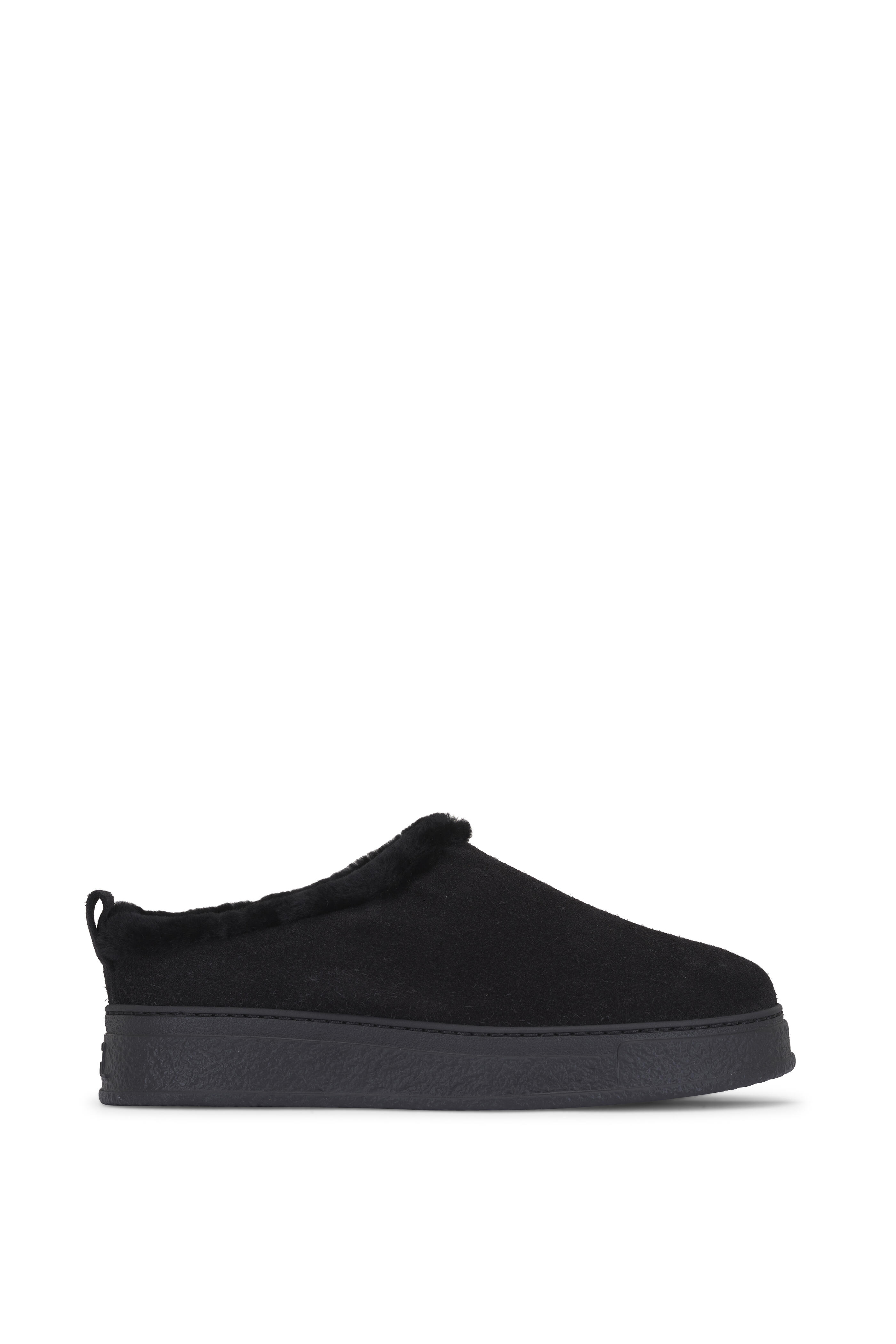 Suede upper. Round toe. Slip on style. Molded footbed; fur lined. Rubber sole. Made in Italy.