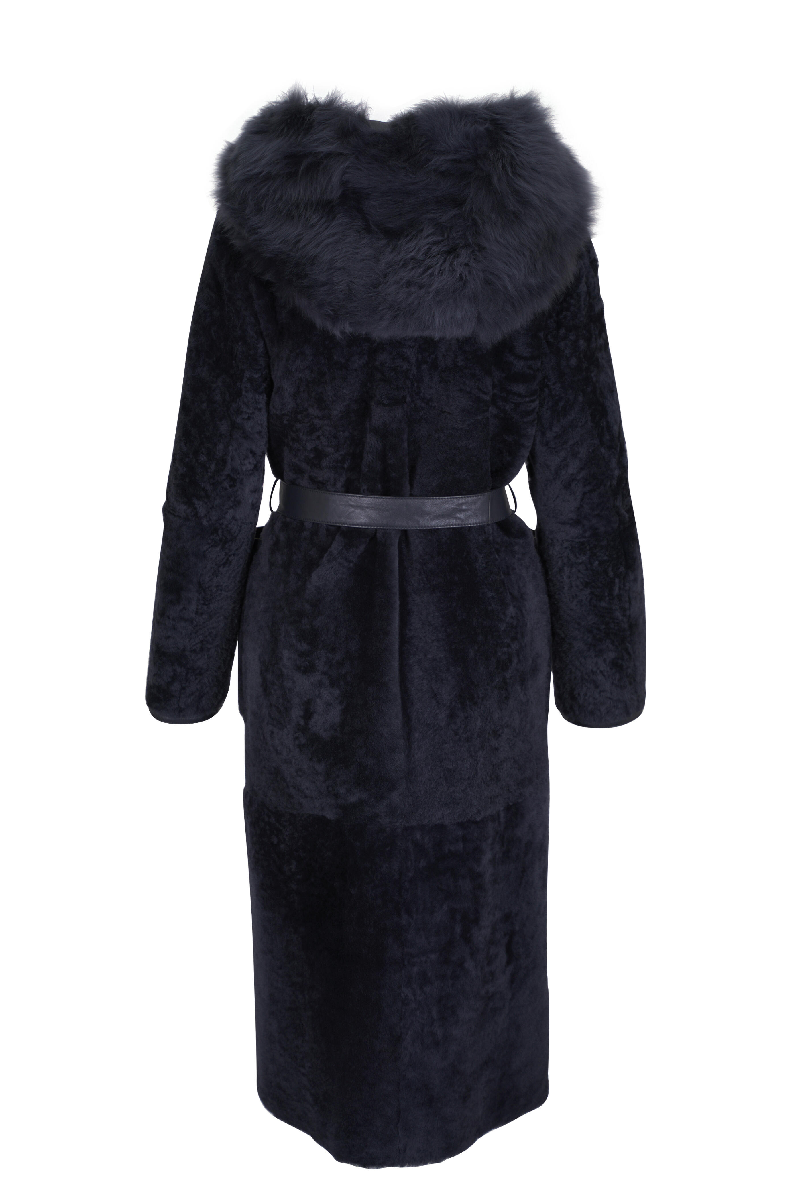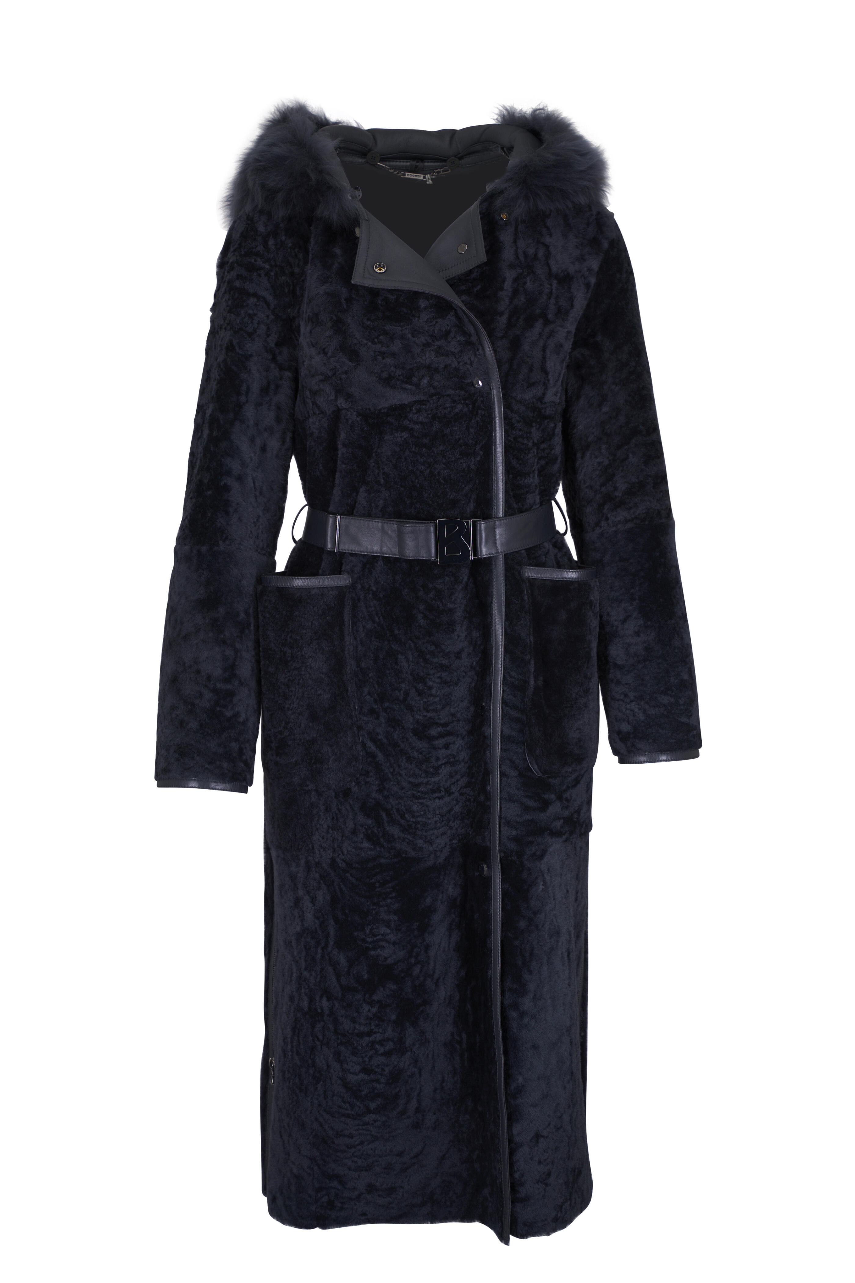 Round neckline, detachable hood. Press-stud closure. Removable self belt. Front patch pockets. Imported. 100% lambskin. Dry clean.