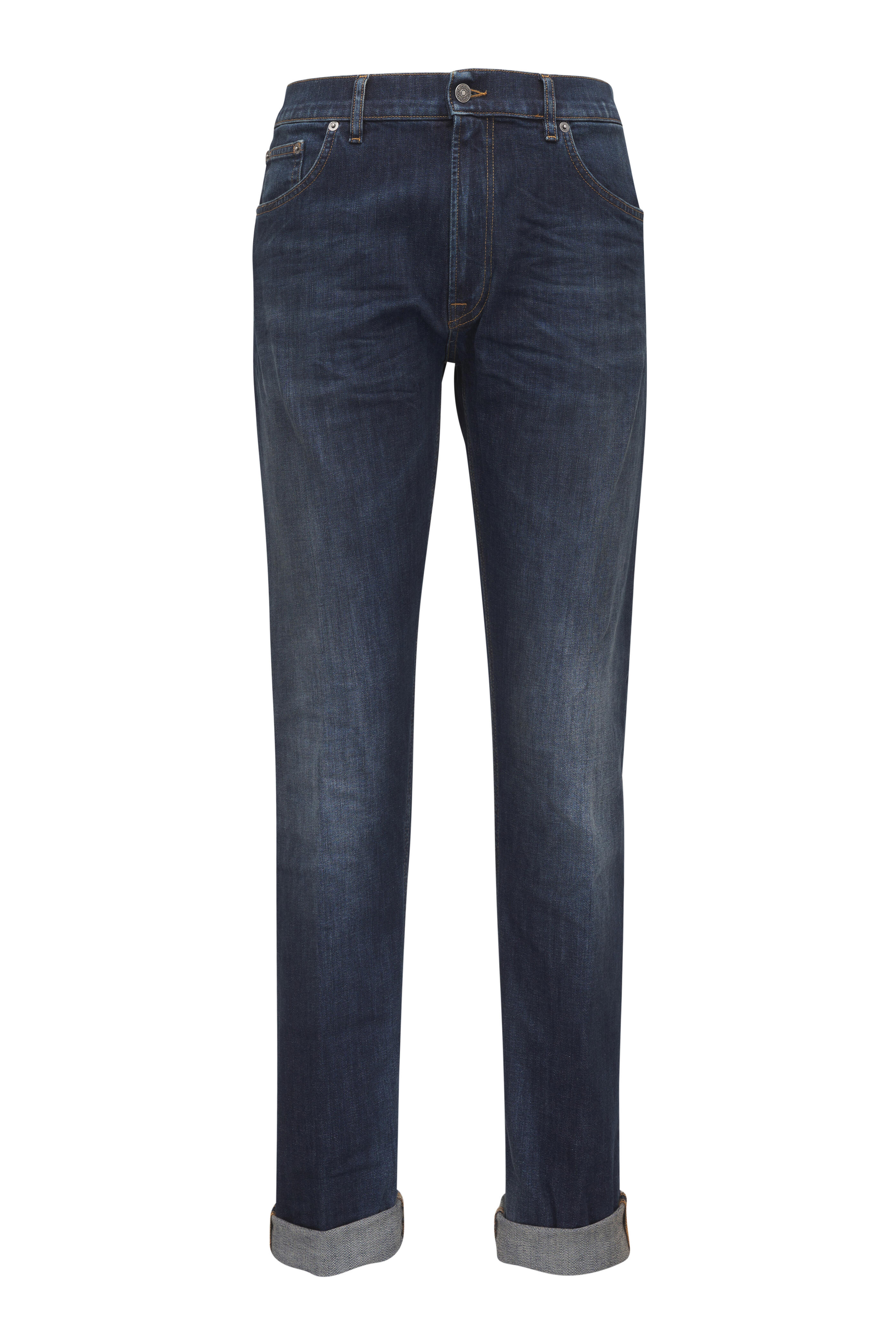 Zip fly; button closure. Banded waist; belt loops. Five pocket styling. Rolled hem. Made in Italy. Inseam: 28" (when hem is cuffed). 98% cotton, 2% elastane. Machine wash.