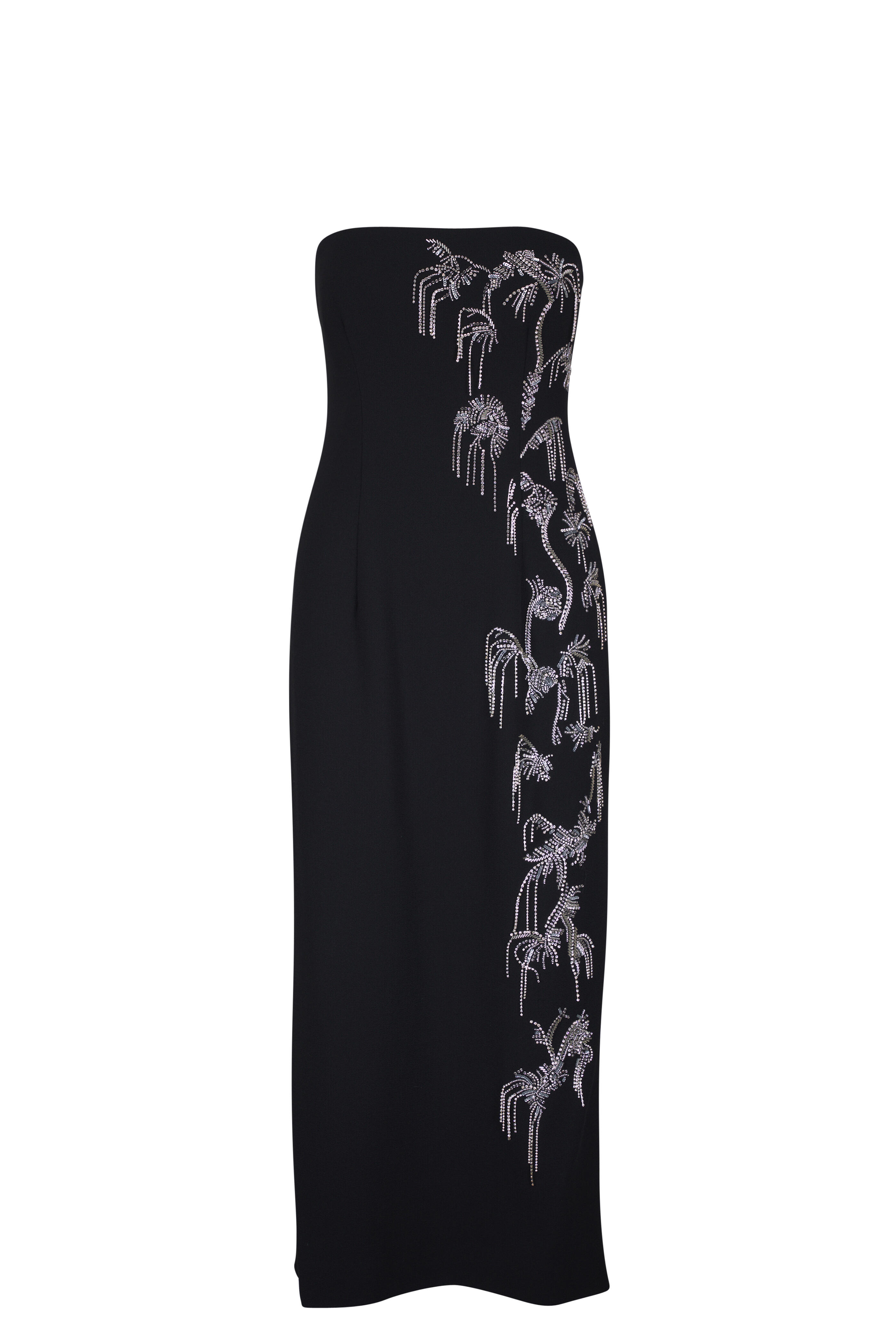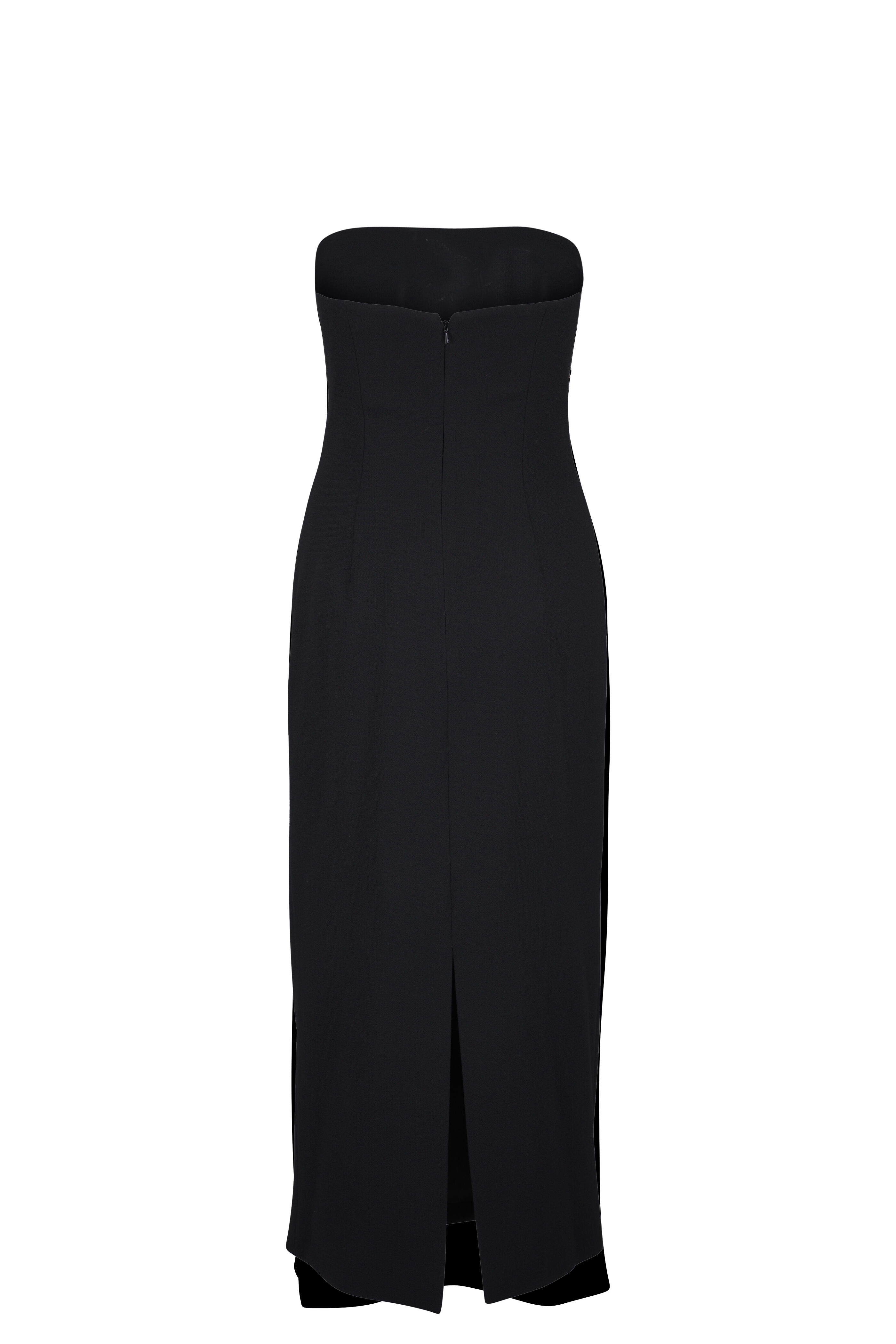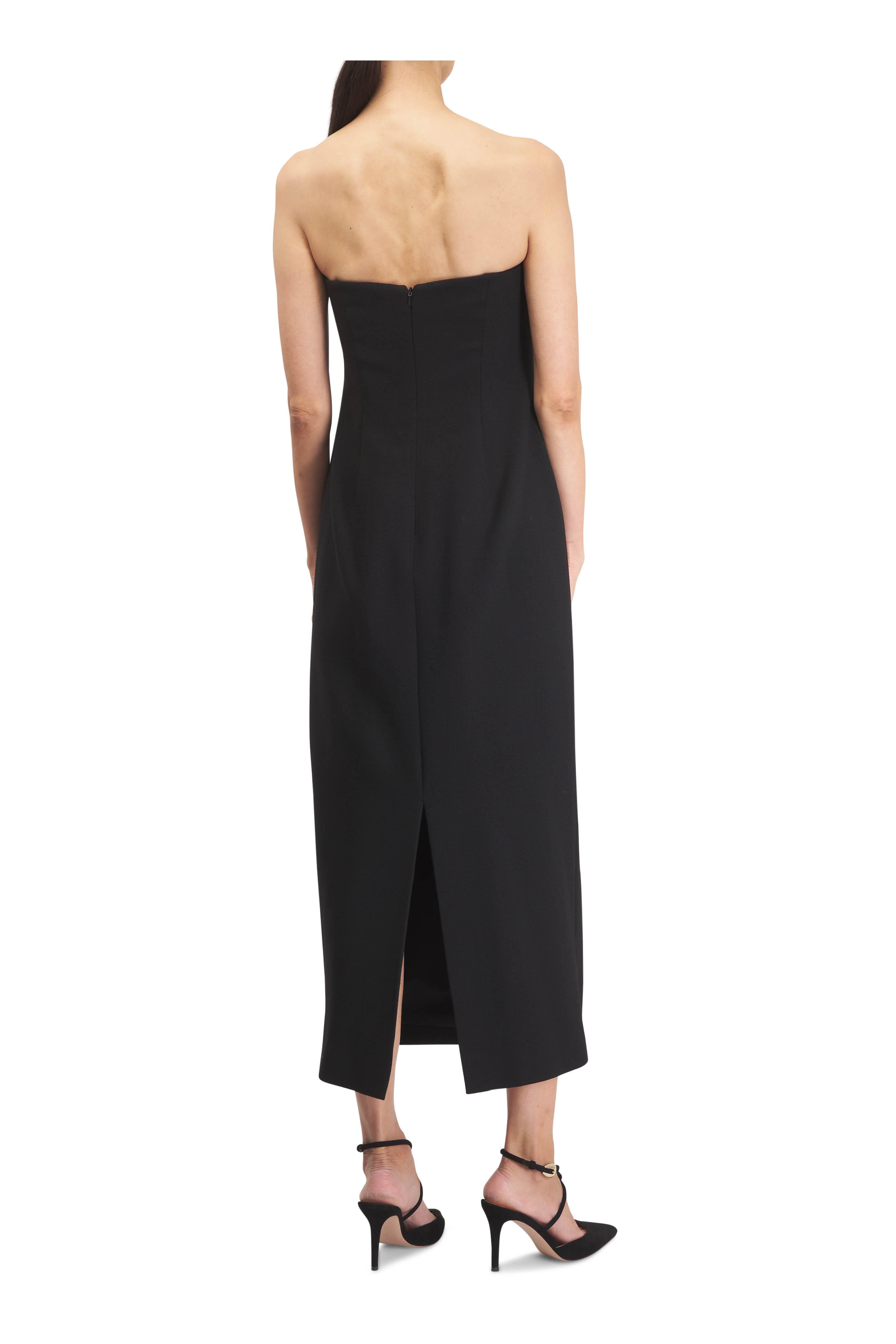 Strapless. Concealed back zip. Interior bustier with hook & eye closure. Interior grosgrain waist belt. Made in USA. 46" length. 93% wool, 5% nylon, 2% elastane; fully lined. Dry clean.