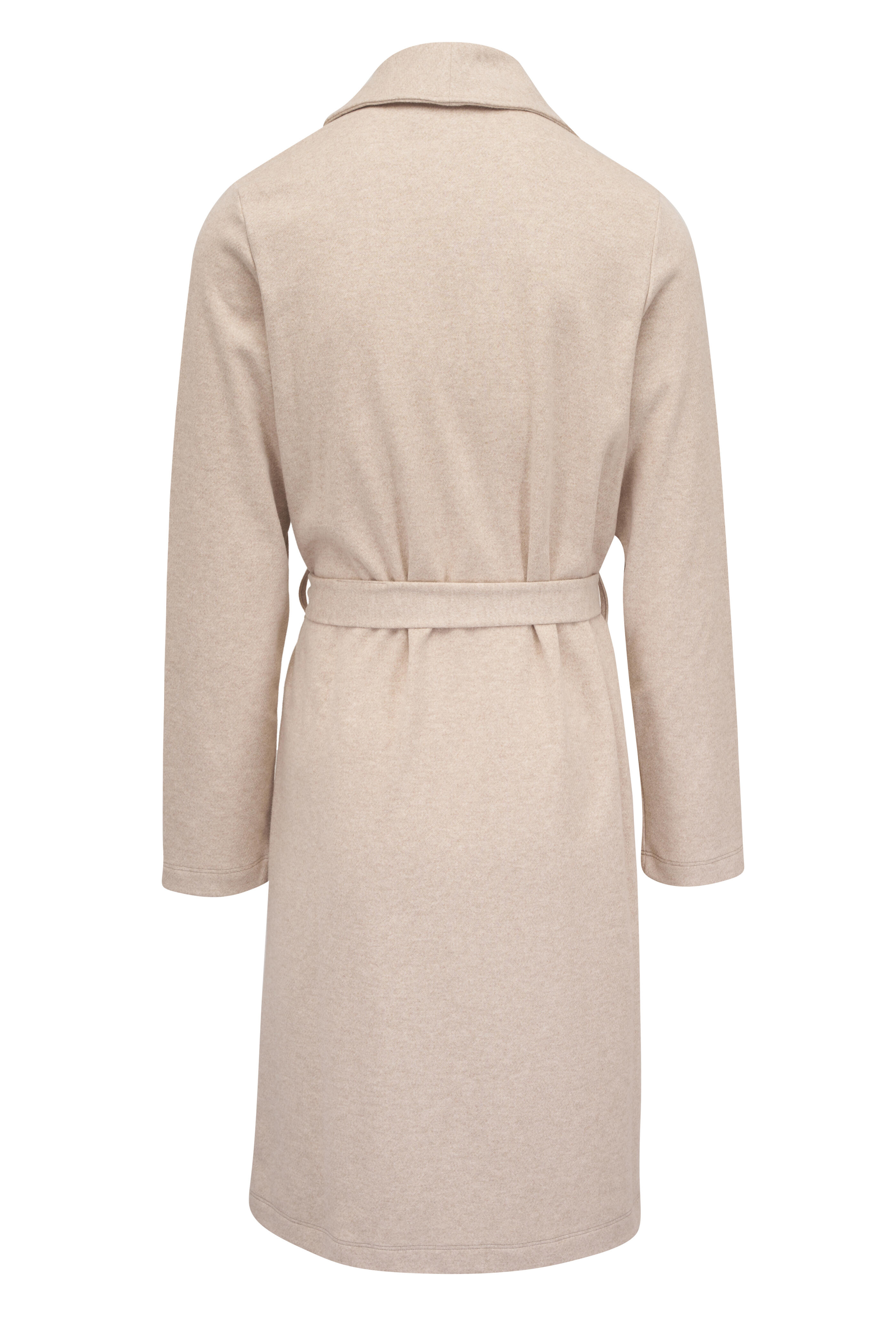 Shawl collar. Self tie closure. Lower patch pockets. Made in Portugal. 83% cotton, 17% polyester. Machine wash.