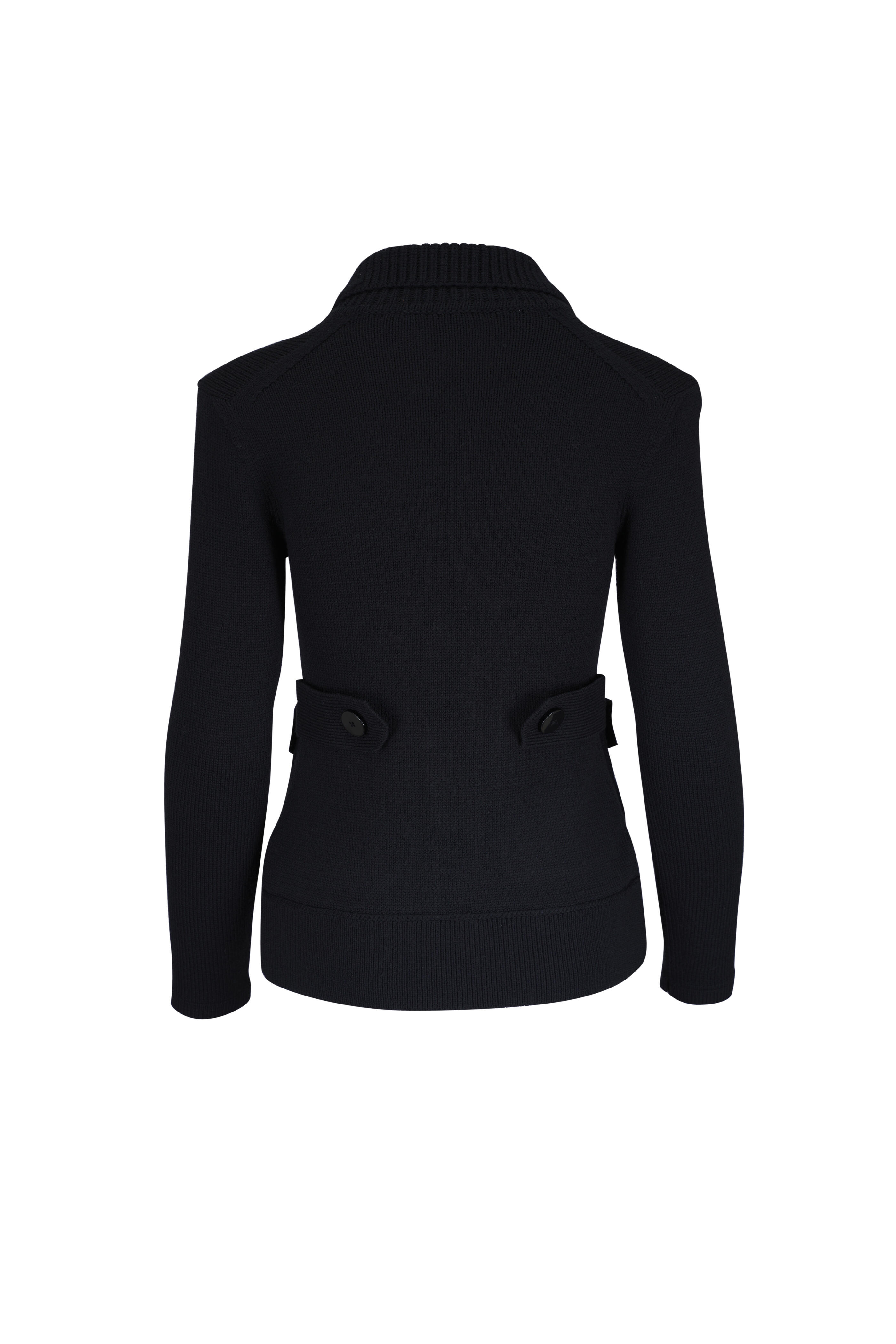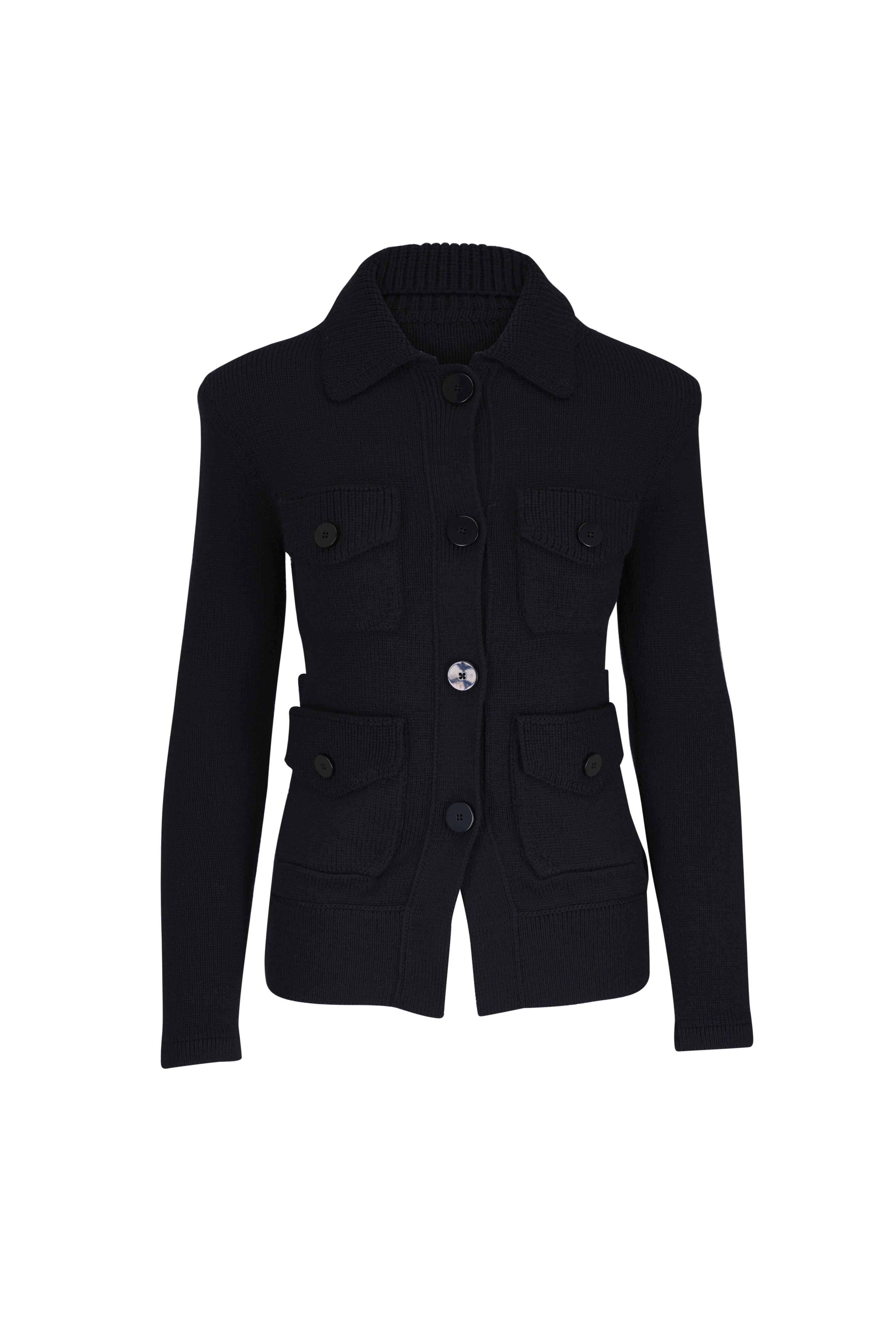 Spread collar. Front button placket. Chest & lower pouch pockets. Imported. 100% virgin wool. Dry clean.