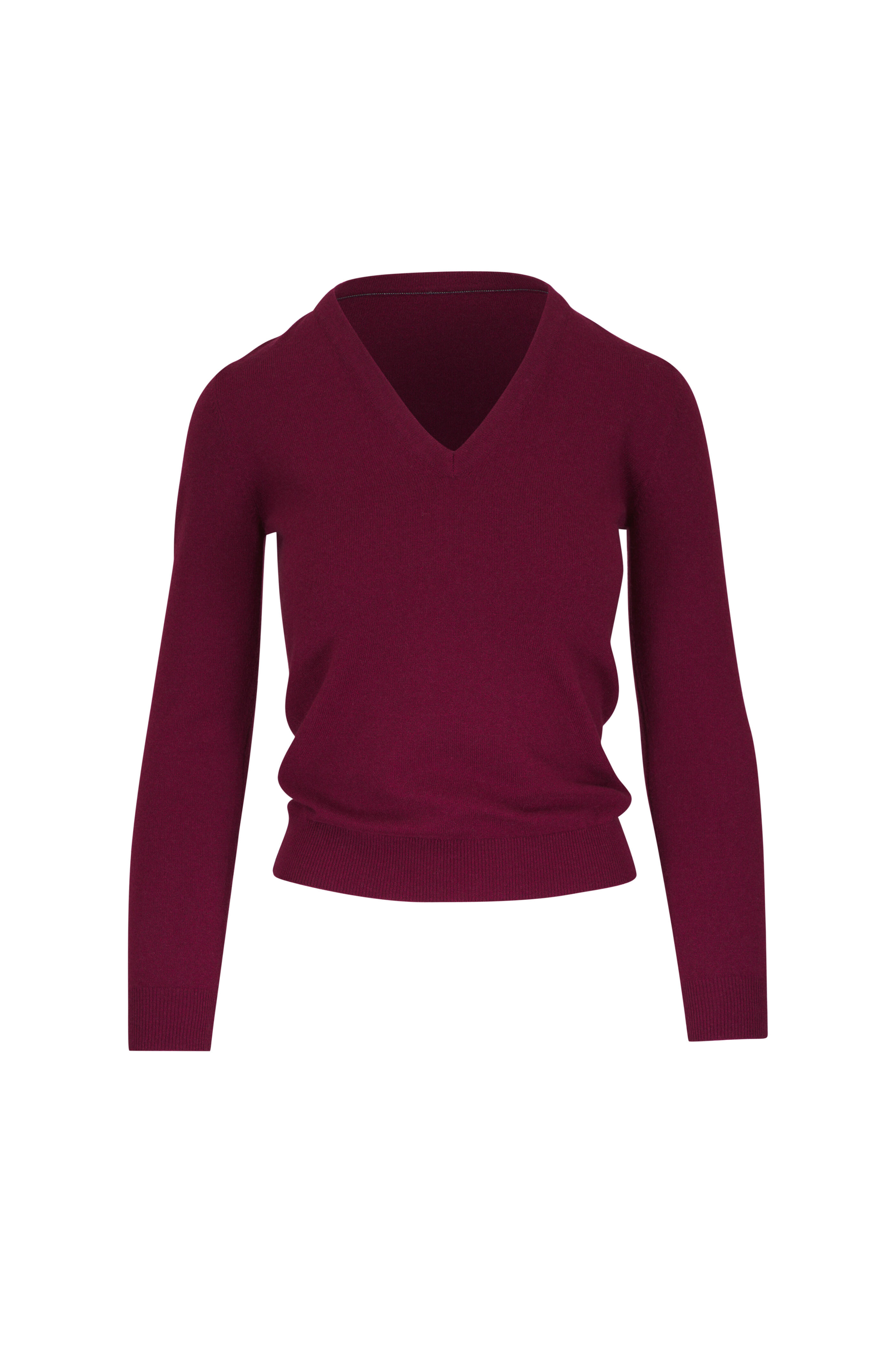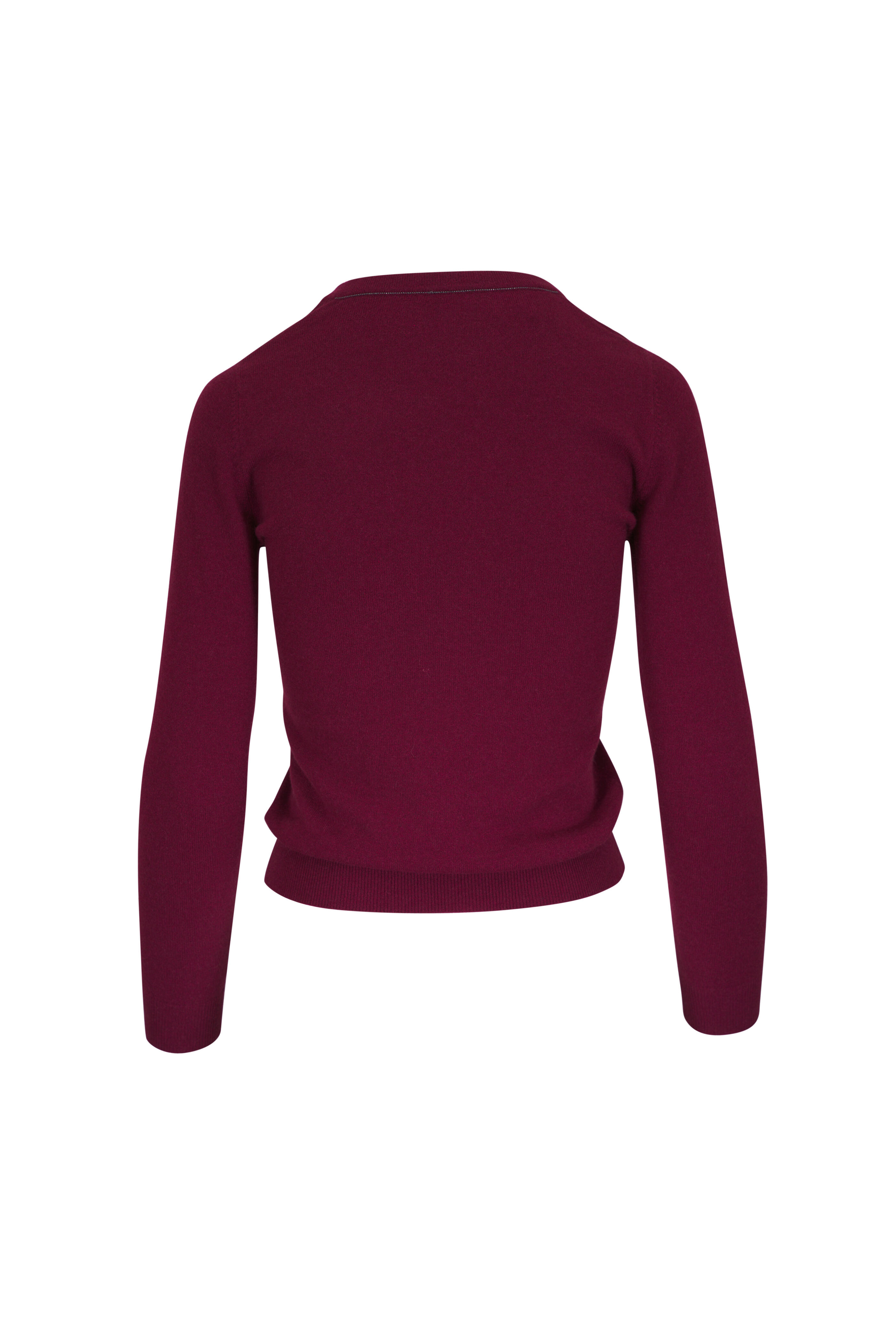 V-neckline; back monili trim detail. Ribbed trims. Made in Italy. 100% cashmere. Dry clean.