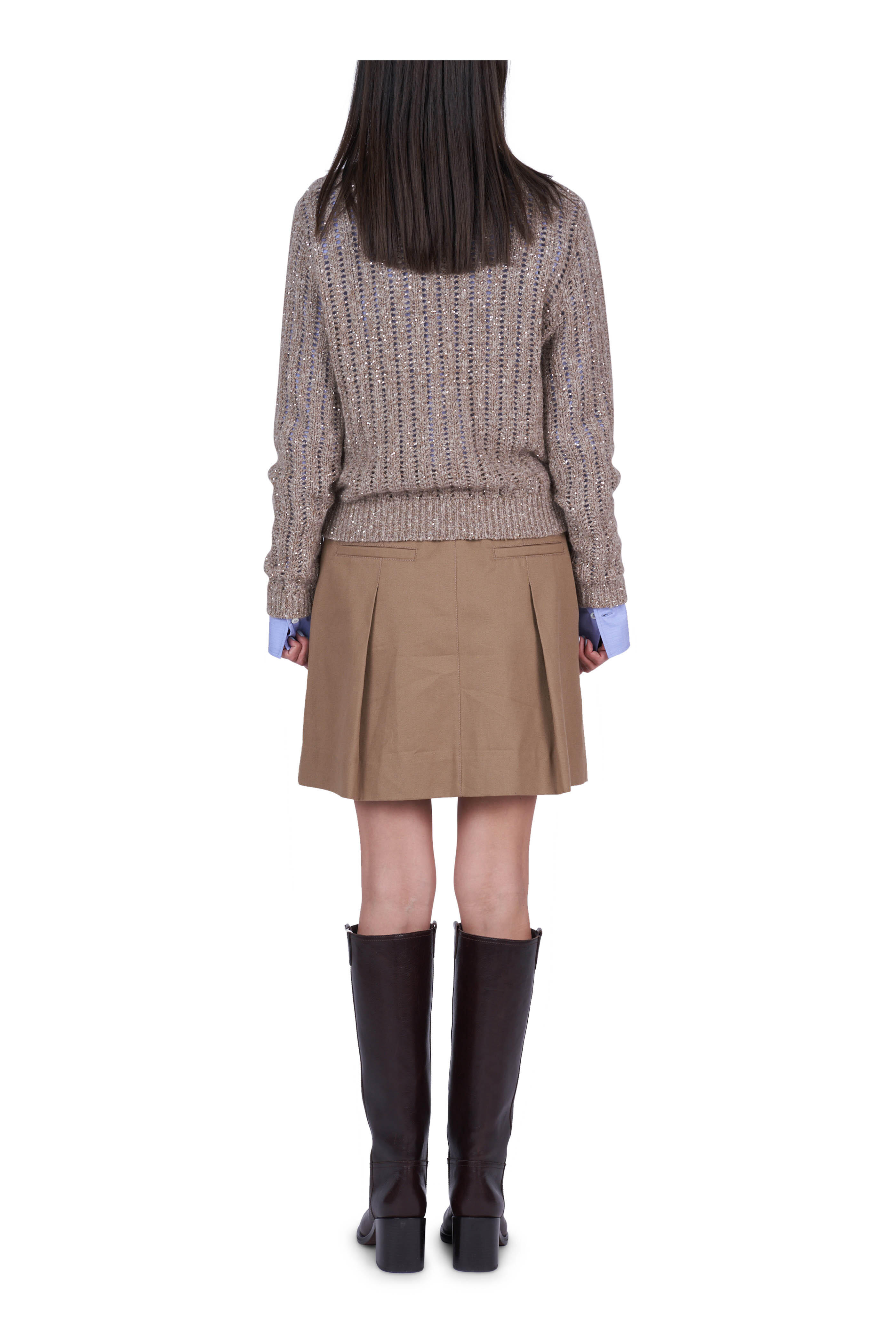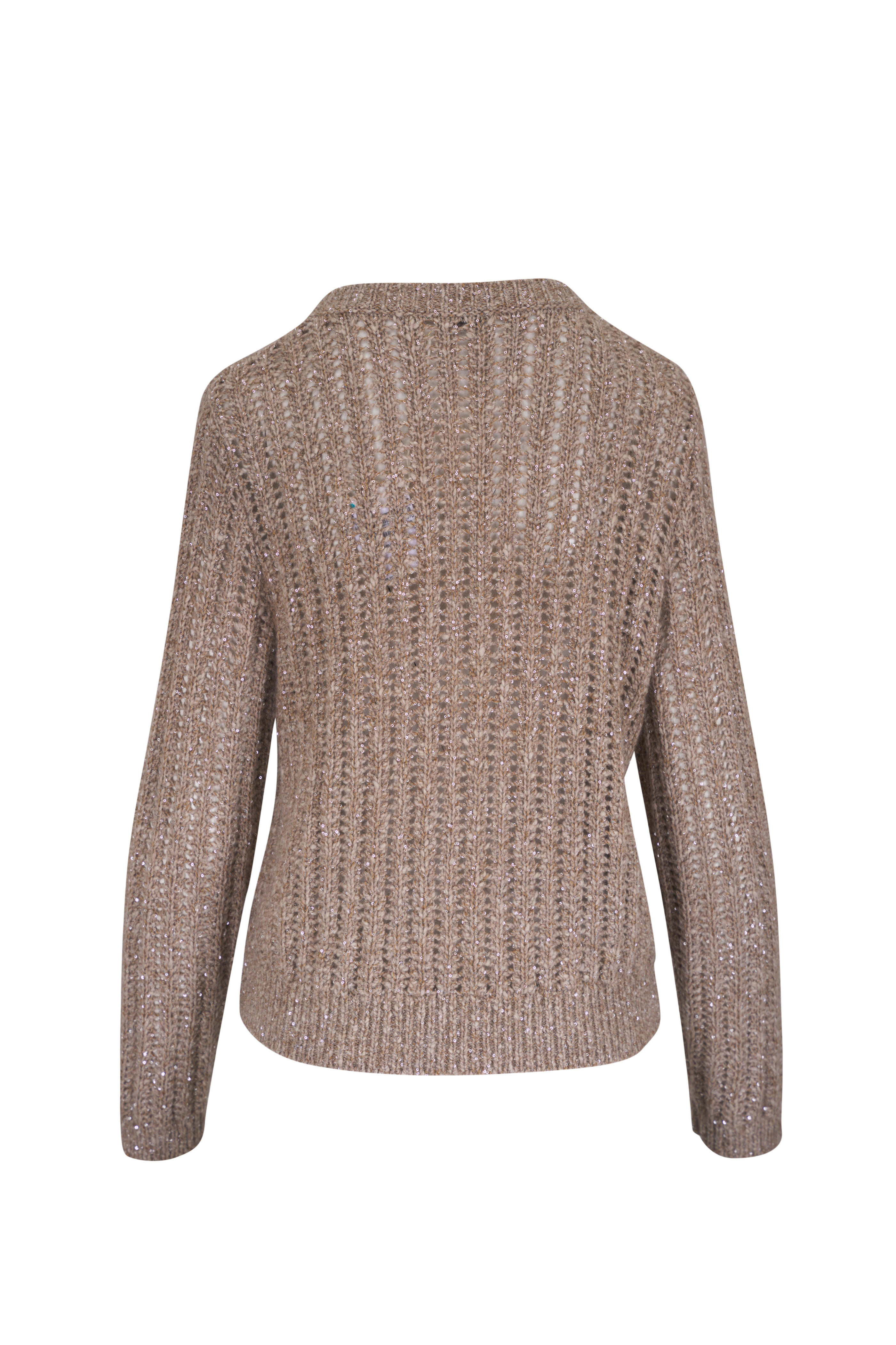 Crew neckline. All over open knit. Ribbed trim. Made in Italy. 28% lambs wool, 26% polyamide, 22% cashmere, 19%polyester, 5% mohair. Dry clean.