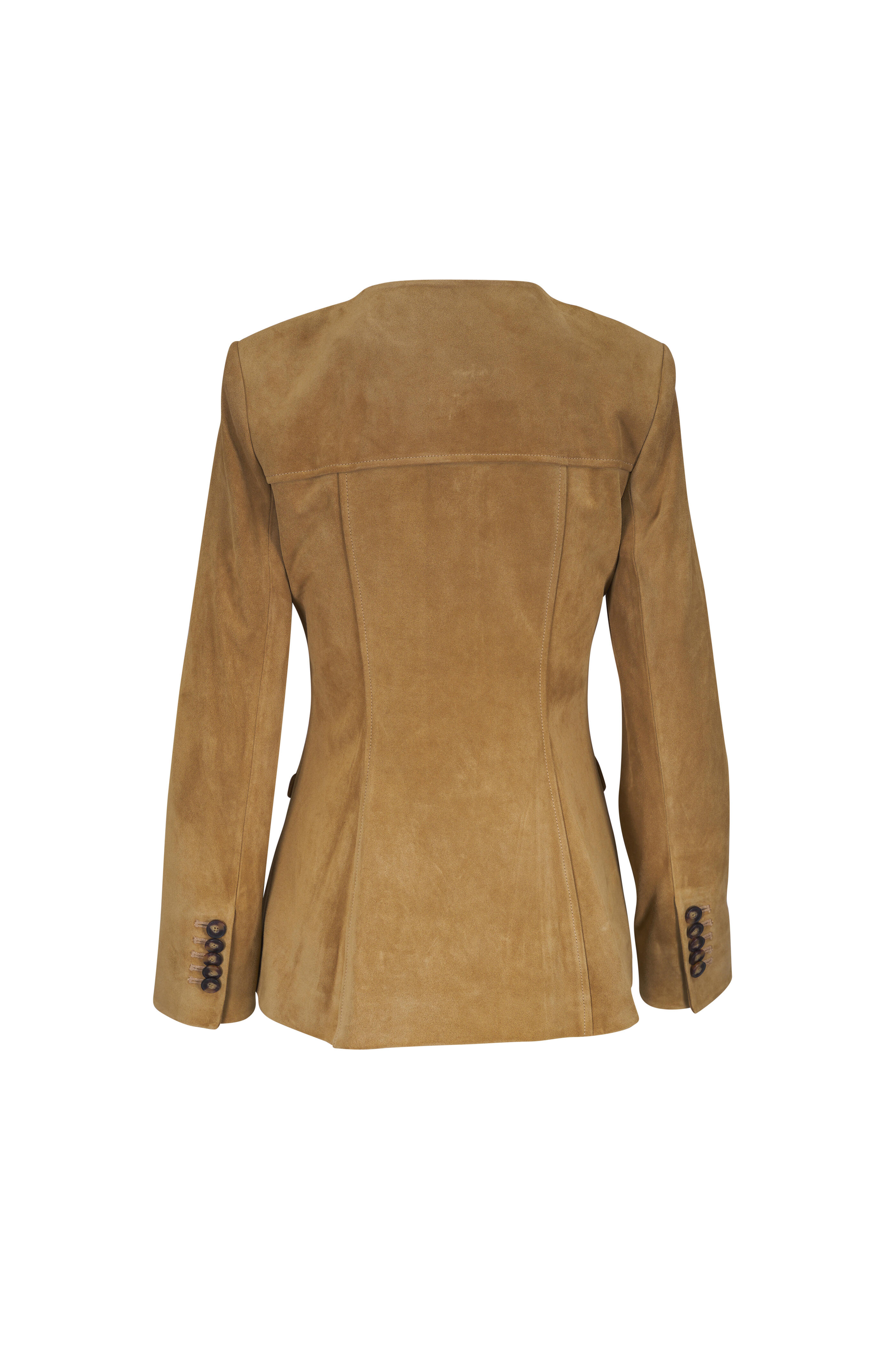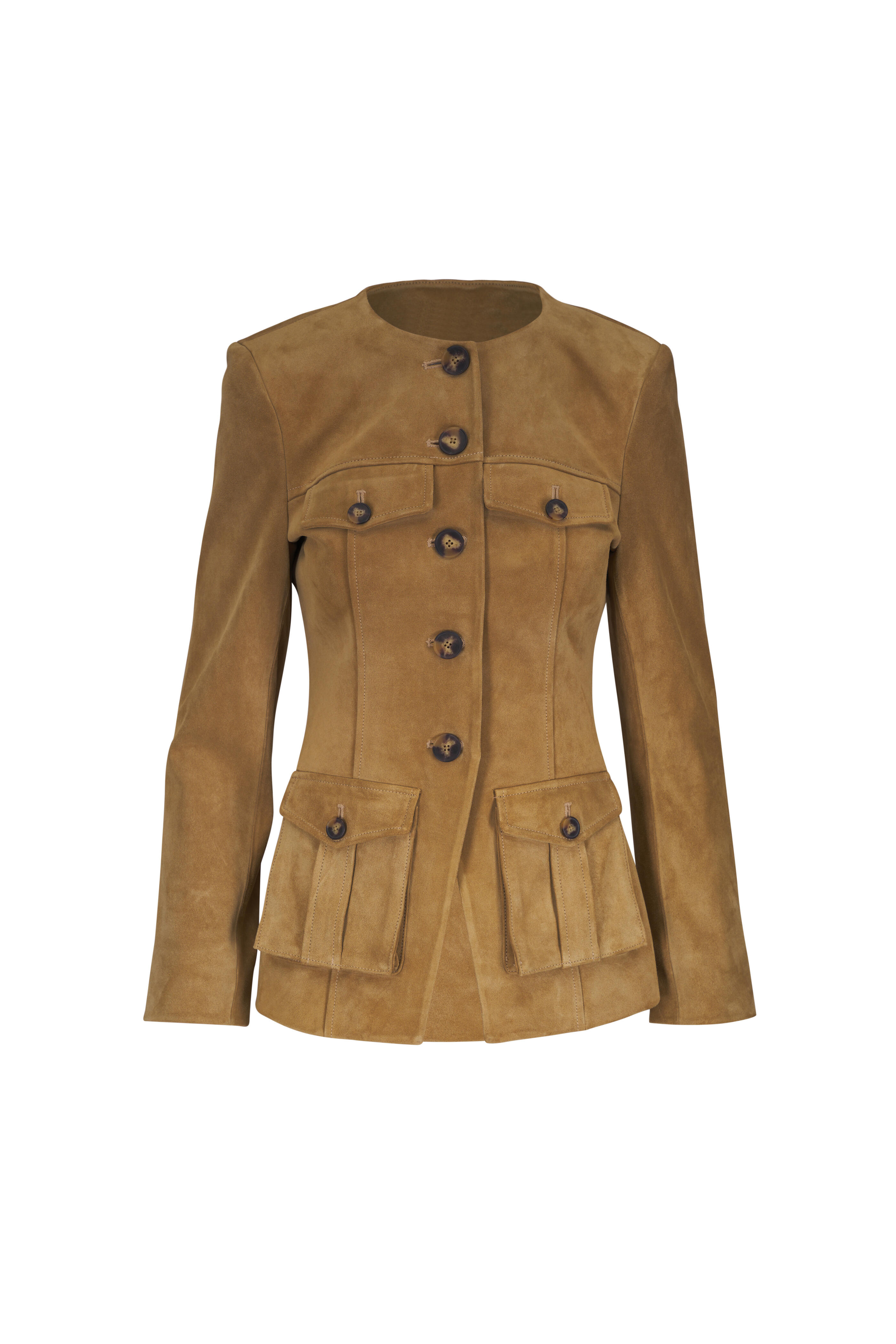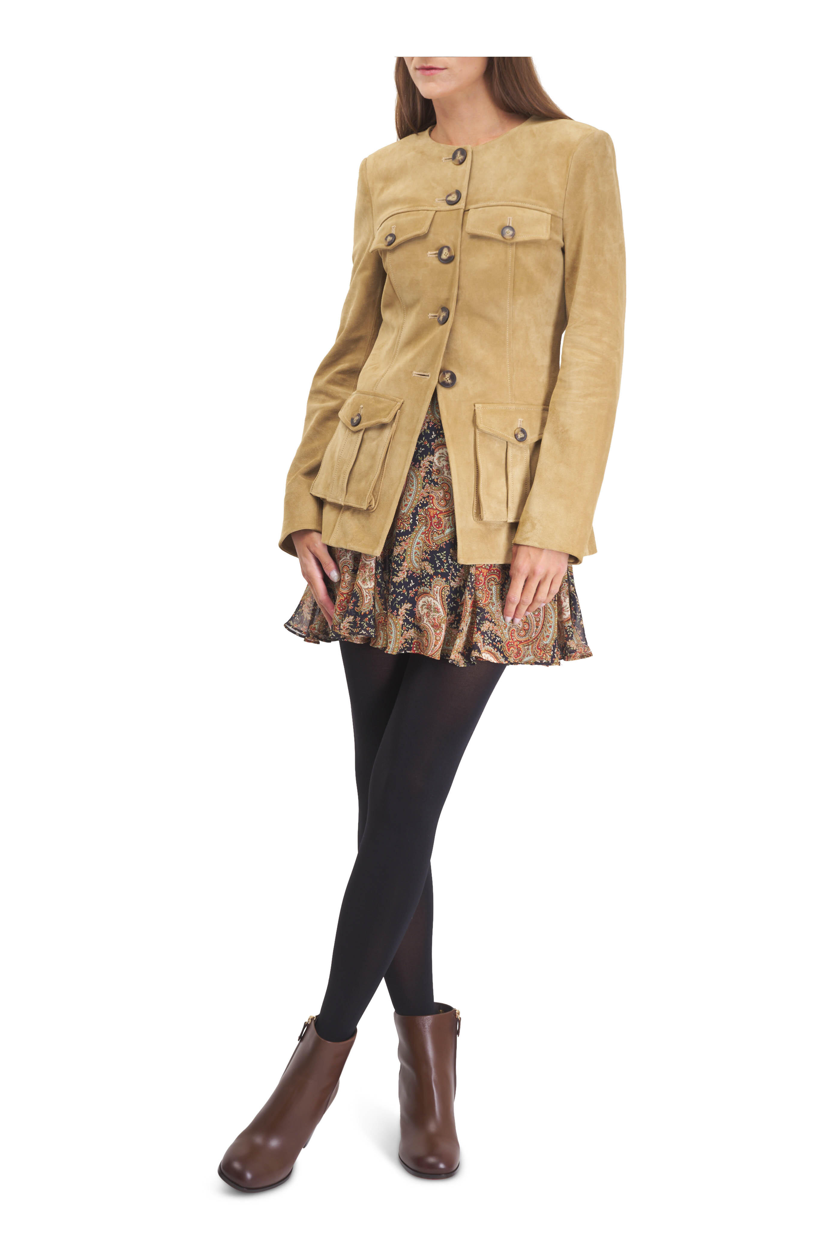 Specialist clean. Round neckline. Front button placket. Chest & lower patch pockets. Square cuffs. Imported. 100% suede; lined.