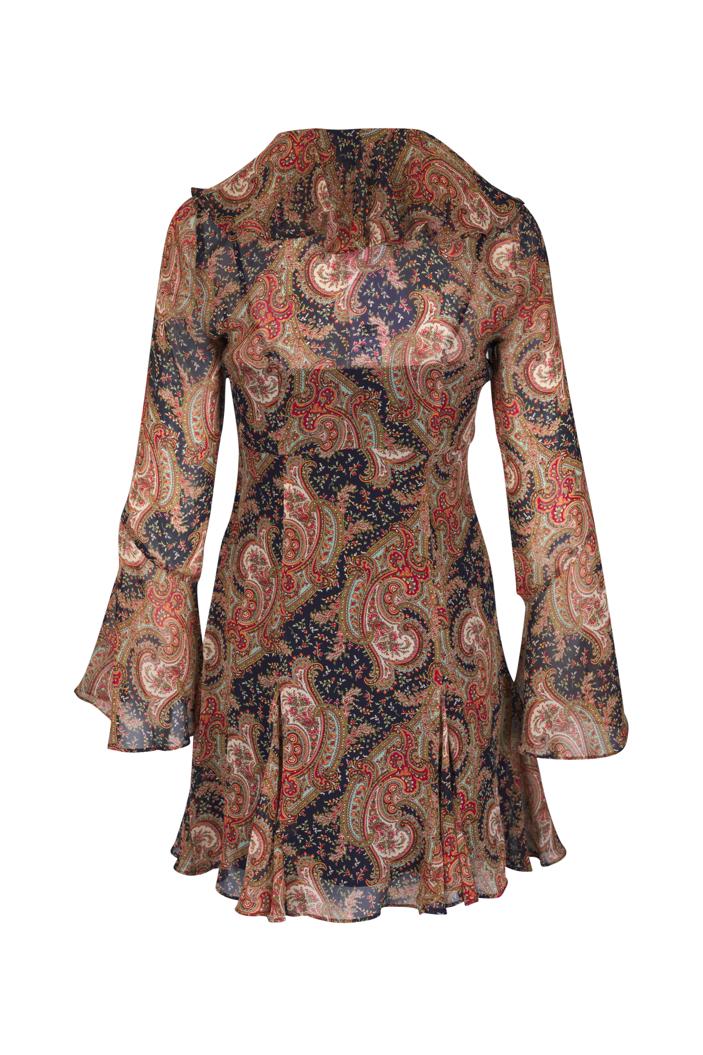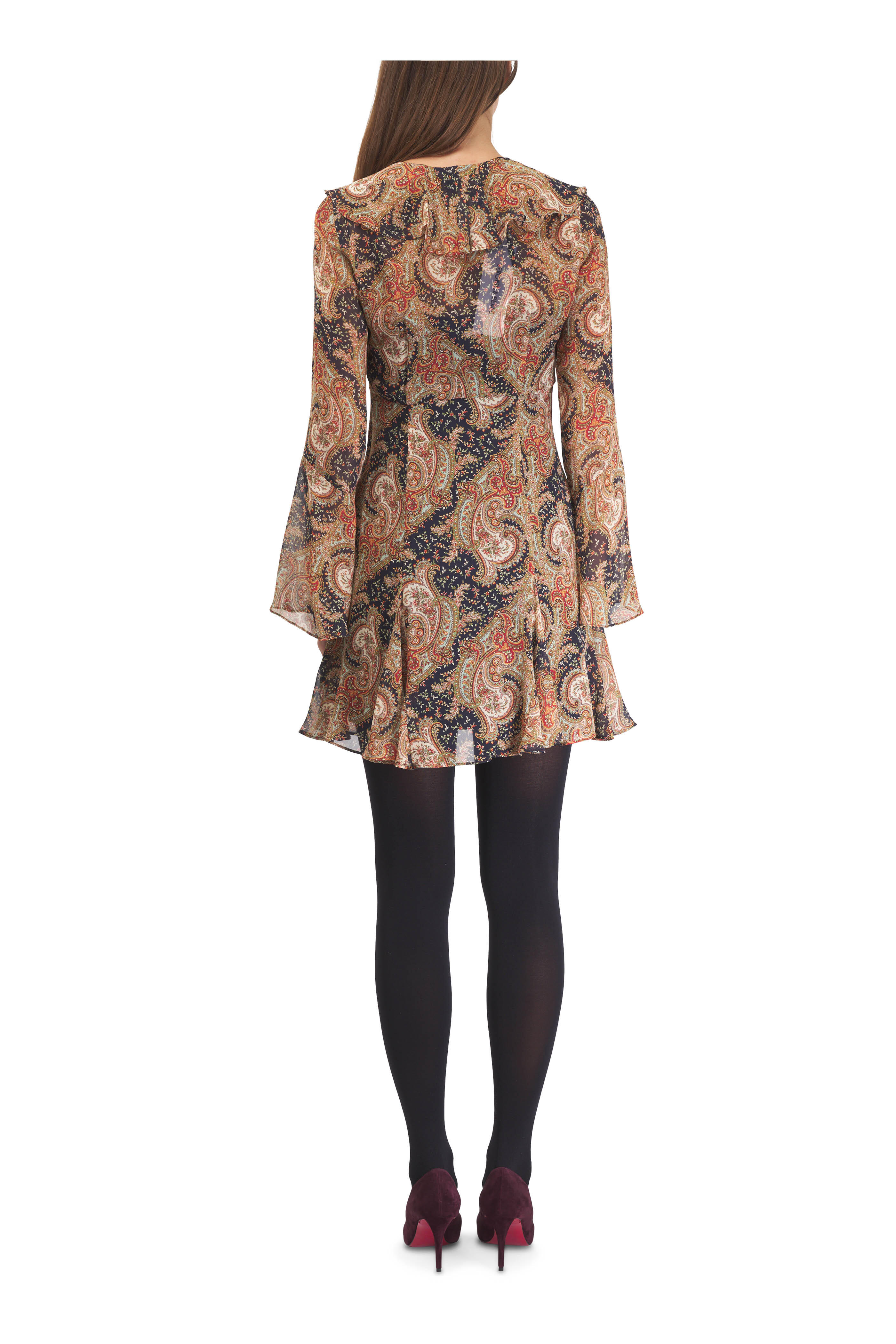 V-neckline; ruffle details. Long, bell sleeves. Imported. Length 34.25” | Sleeve length 31.25”, based on a size 2. 100% silk; lined. Dry clean.